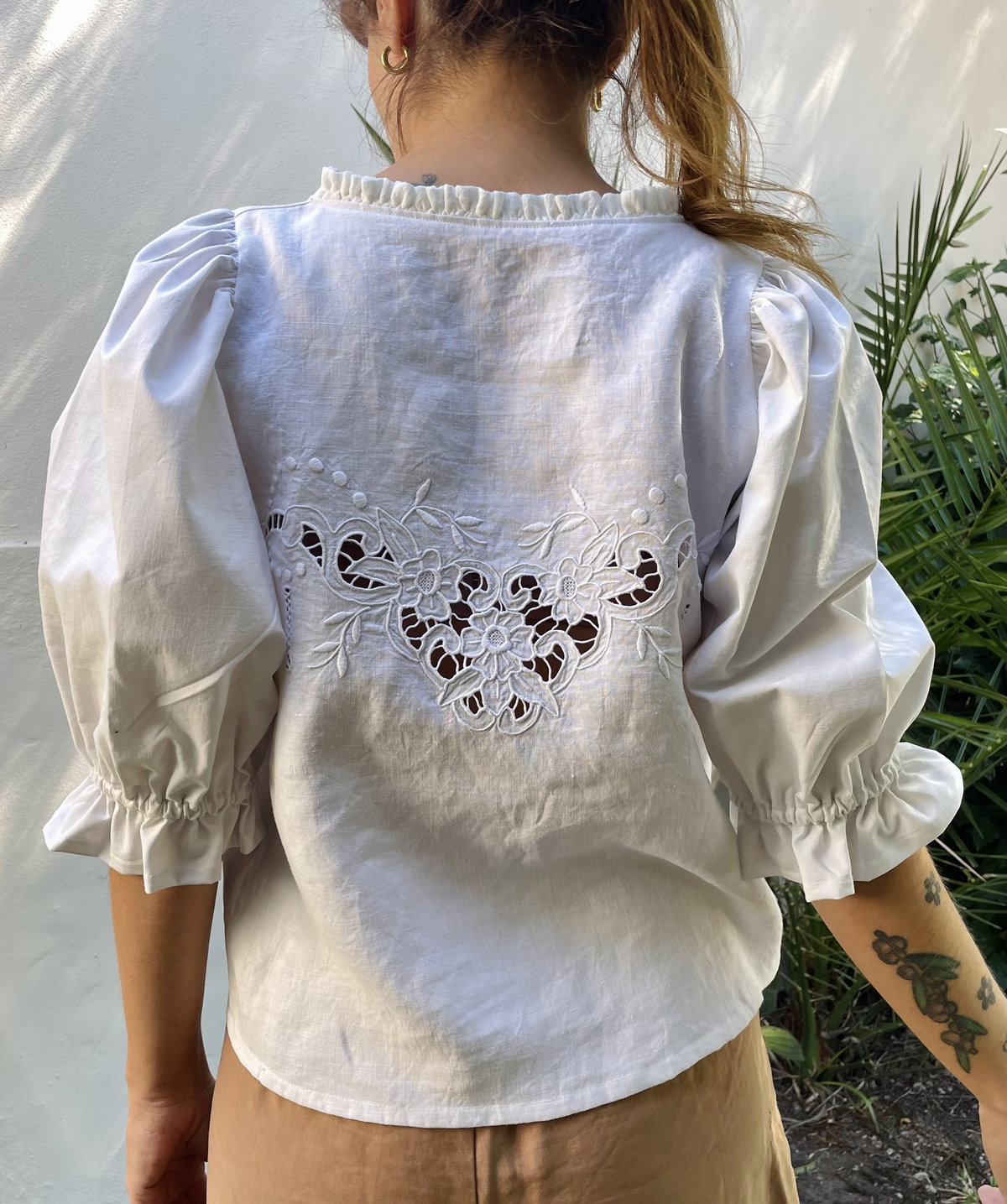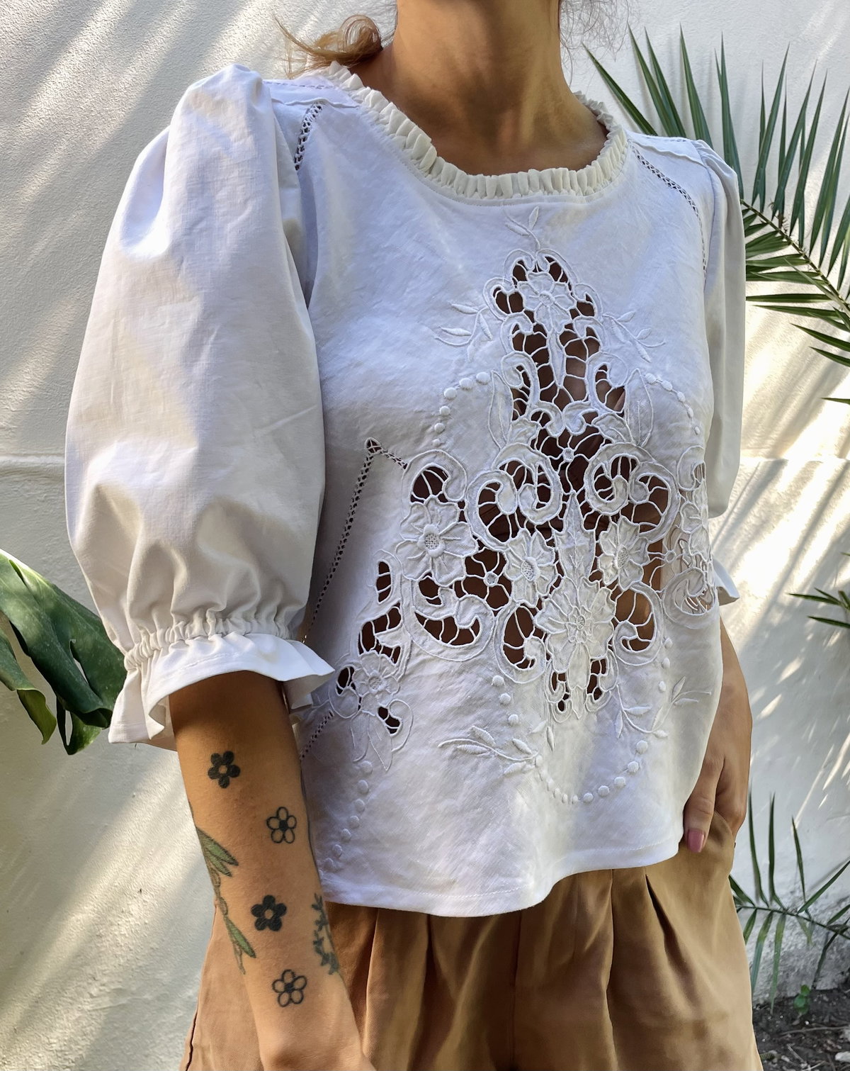 Blusa de algodón con bordado richelieu y calados. Volado en cuello y mangas abullonadas