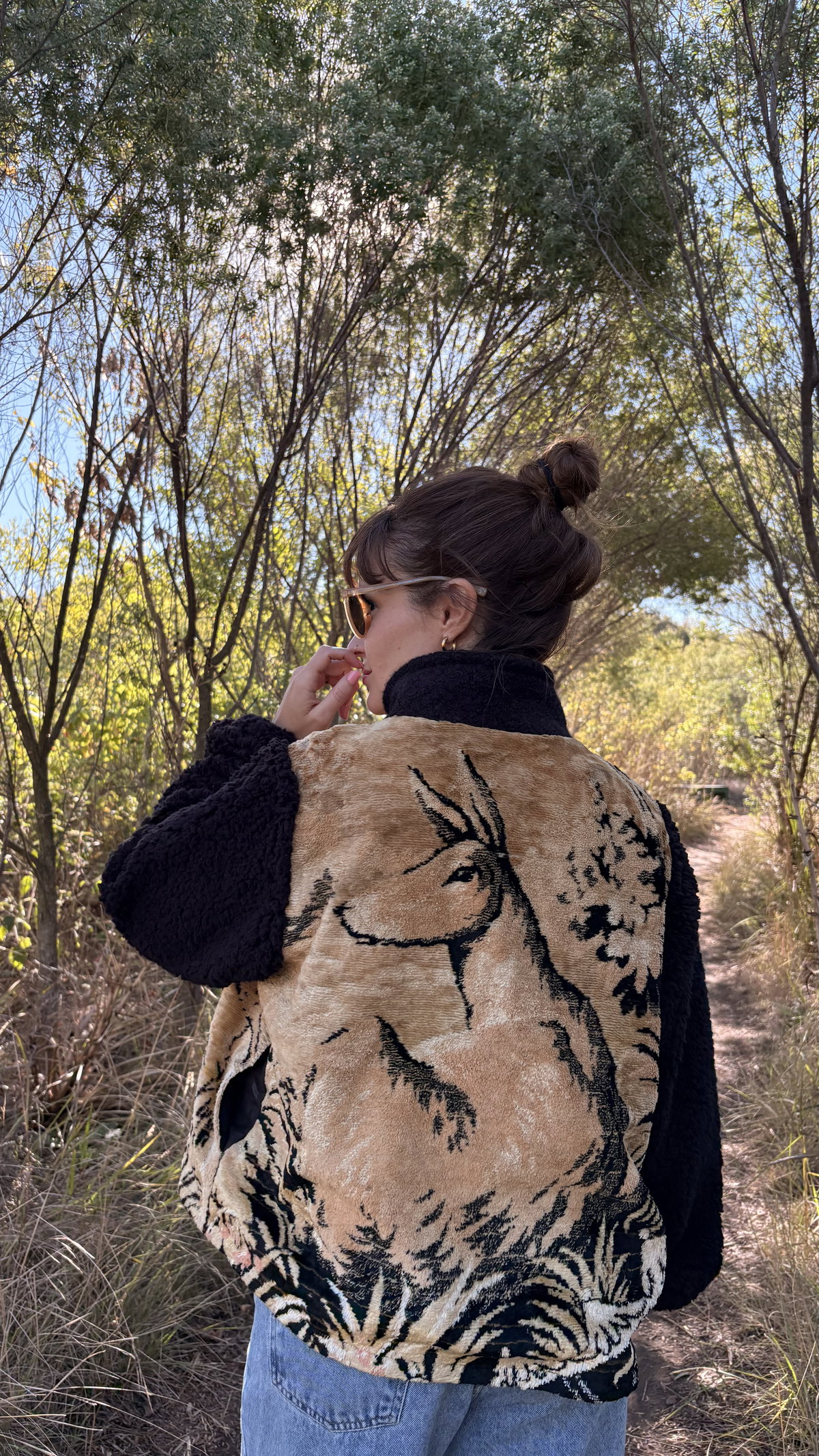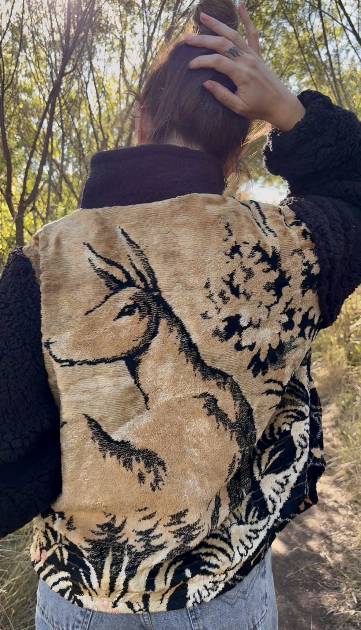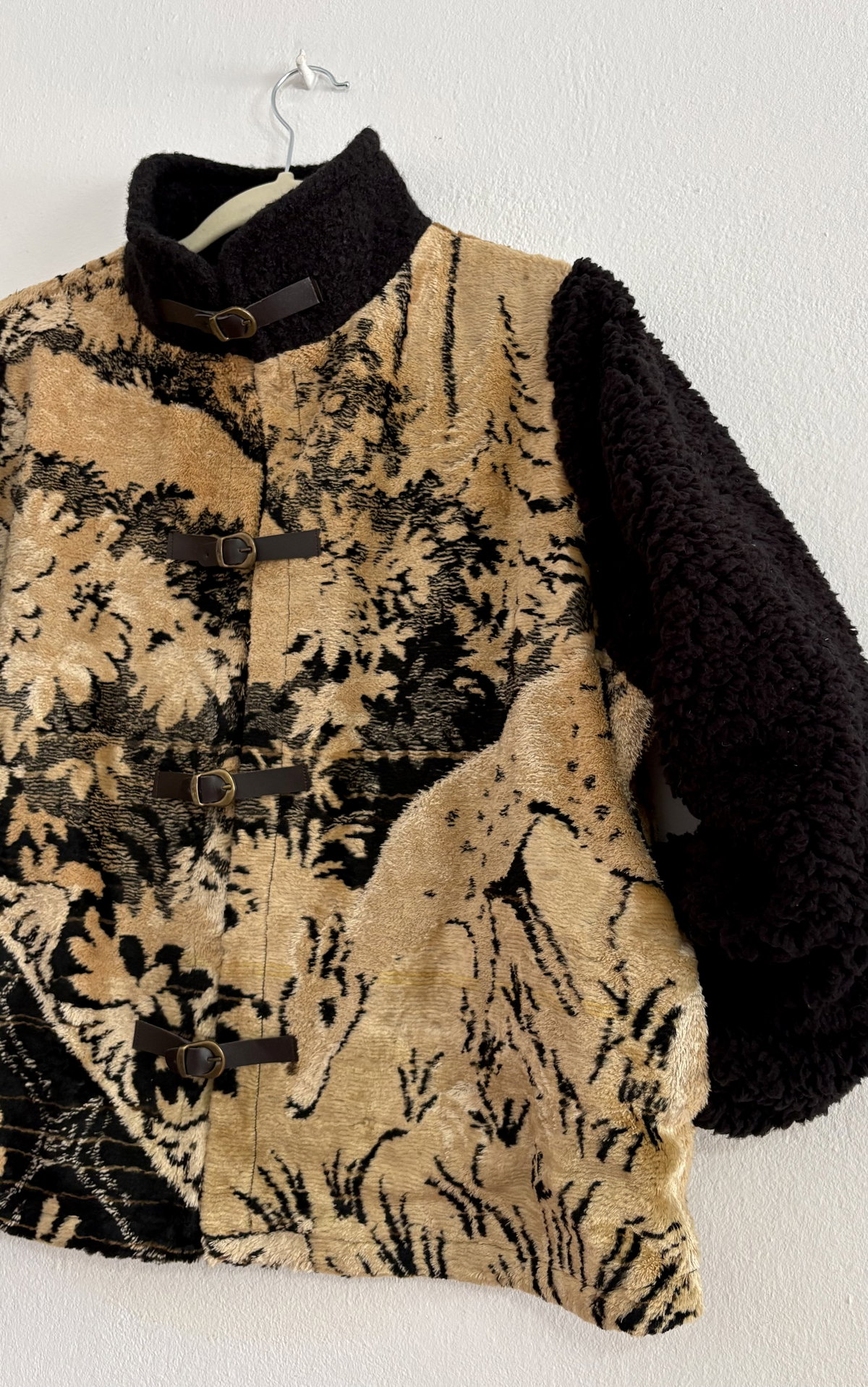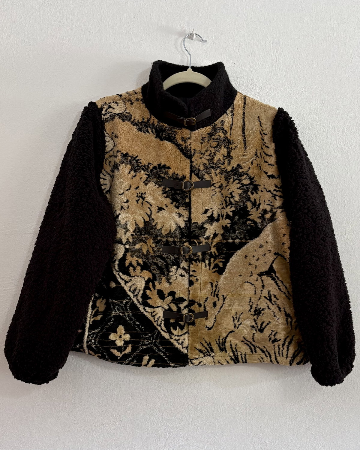 Campera hecha a partir de tapiz de terciopelo antiguo combinado con corderito en mangas y cuello. Tienen bolsillos y están íntegramente forradas.