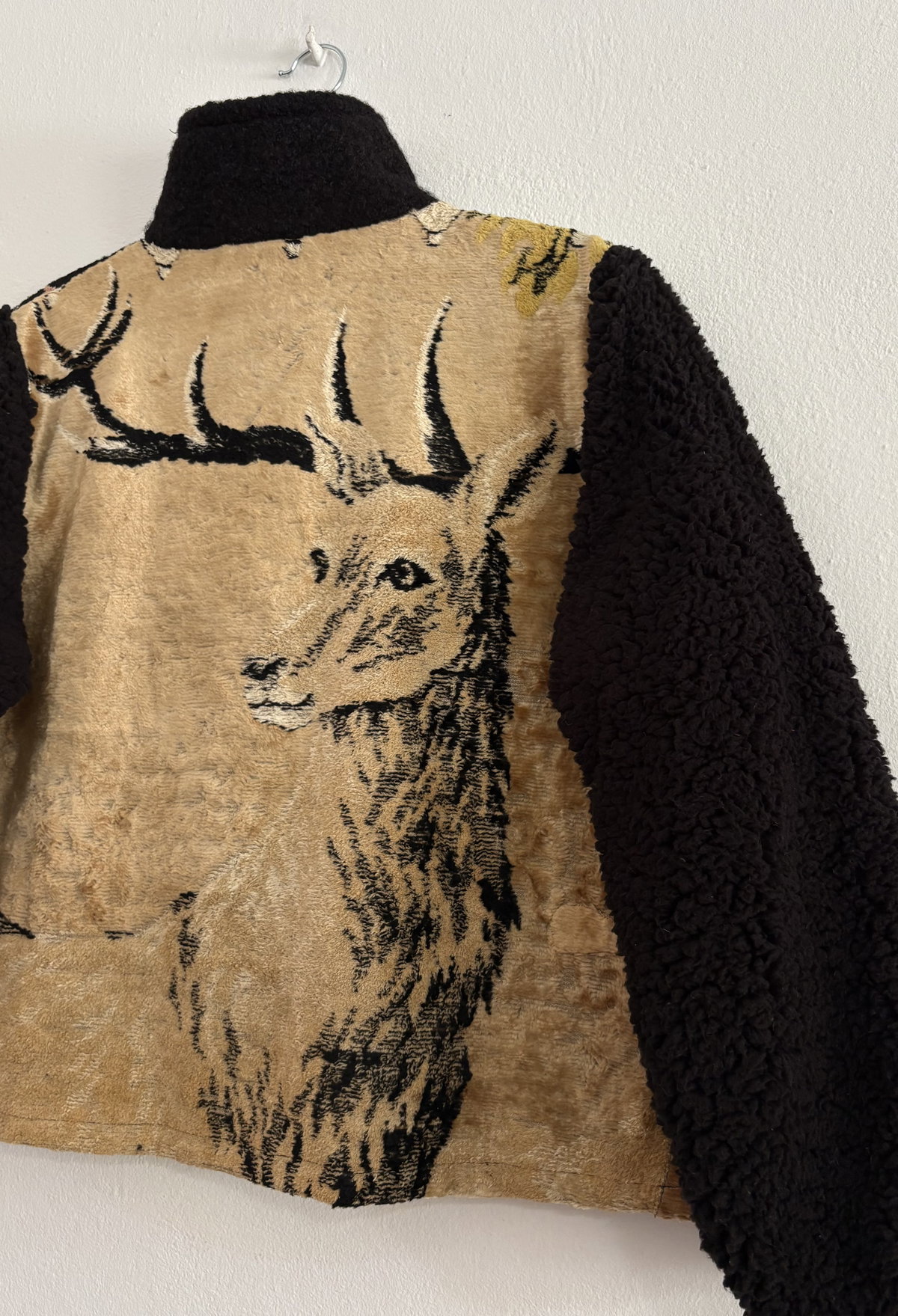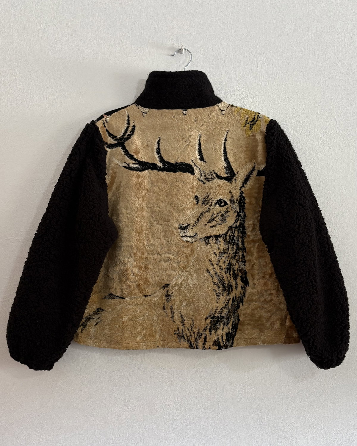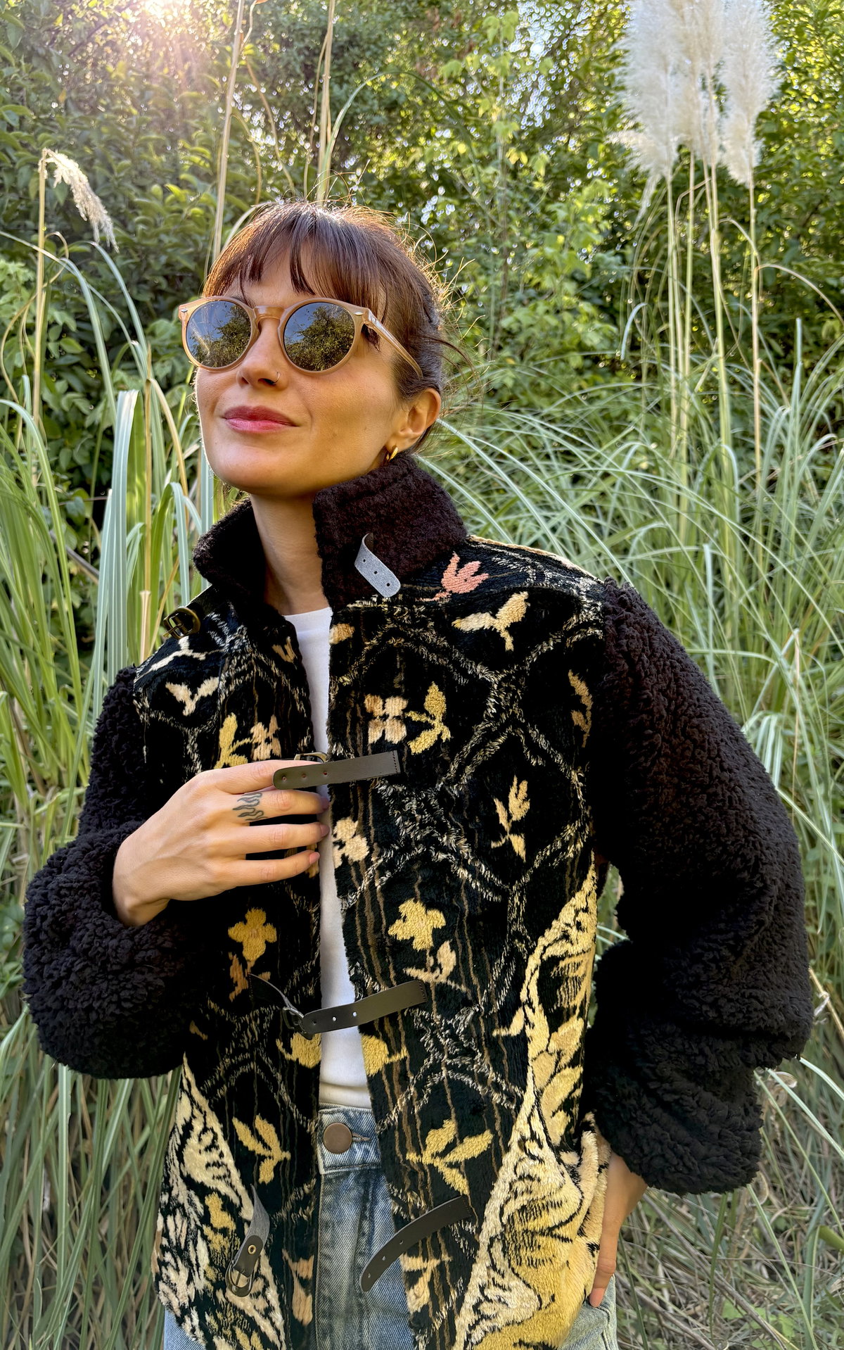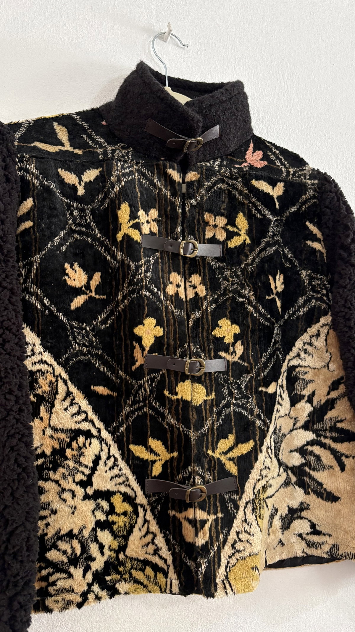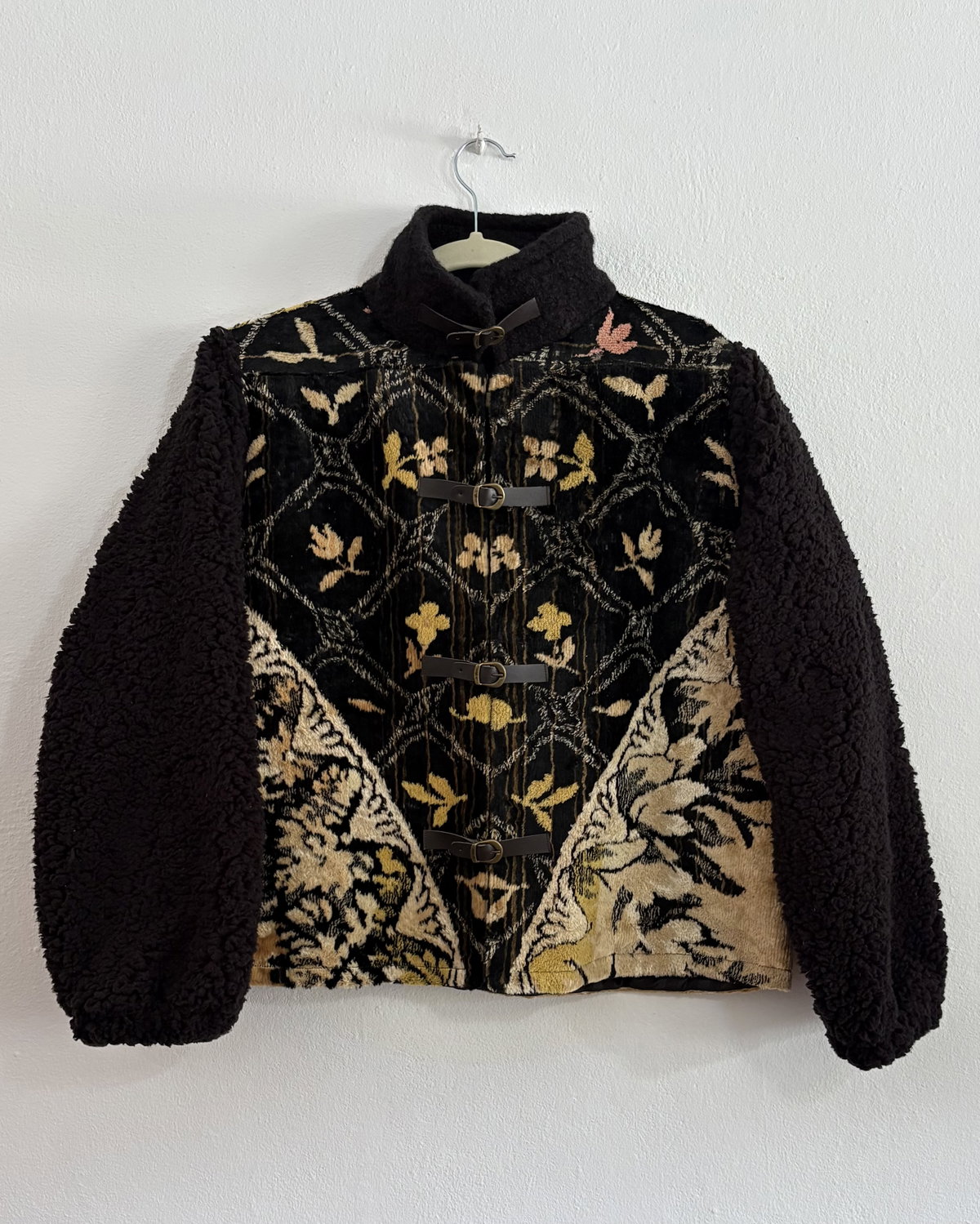 Campera hecha a partir de tapiz de terciopelo antiguo combinado con corderito en mangas y cuello. Tienen bolsillos y están íntegramente forradas.