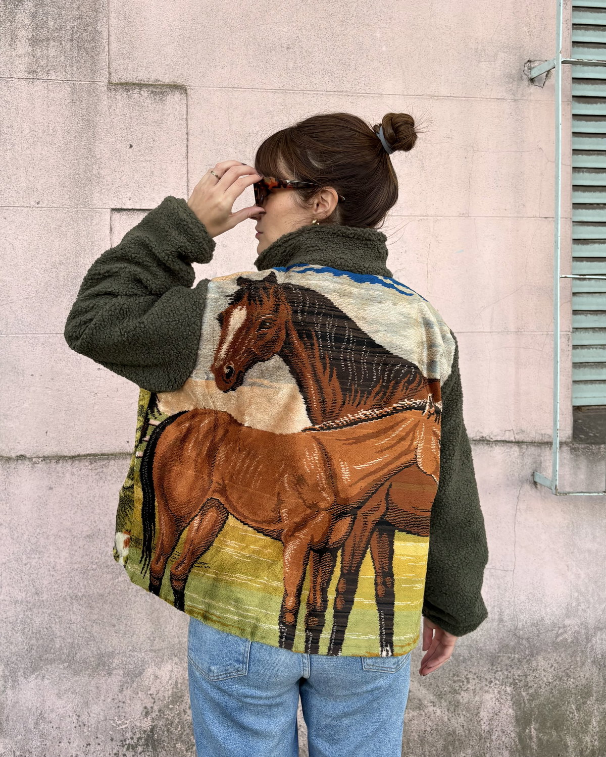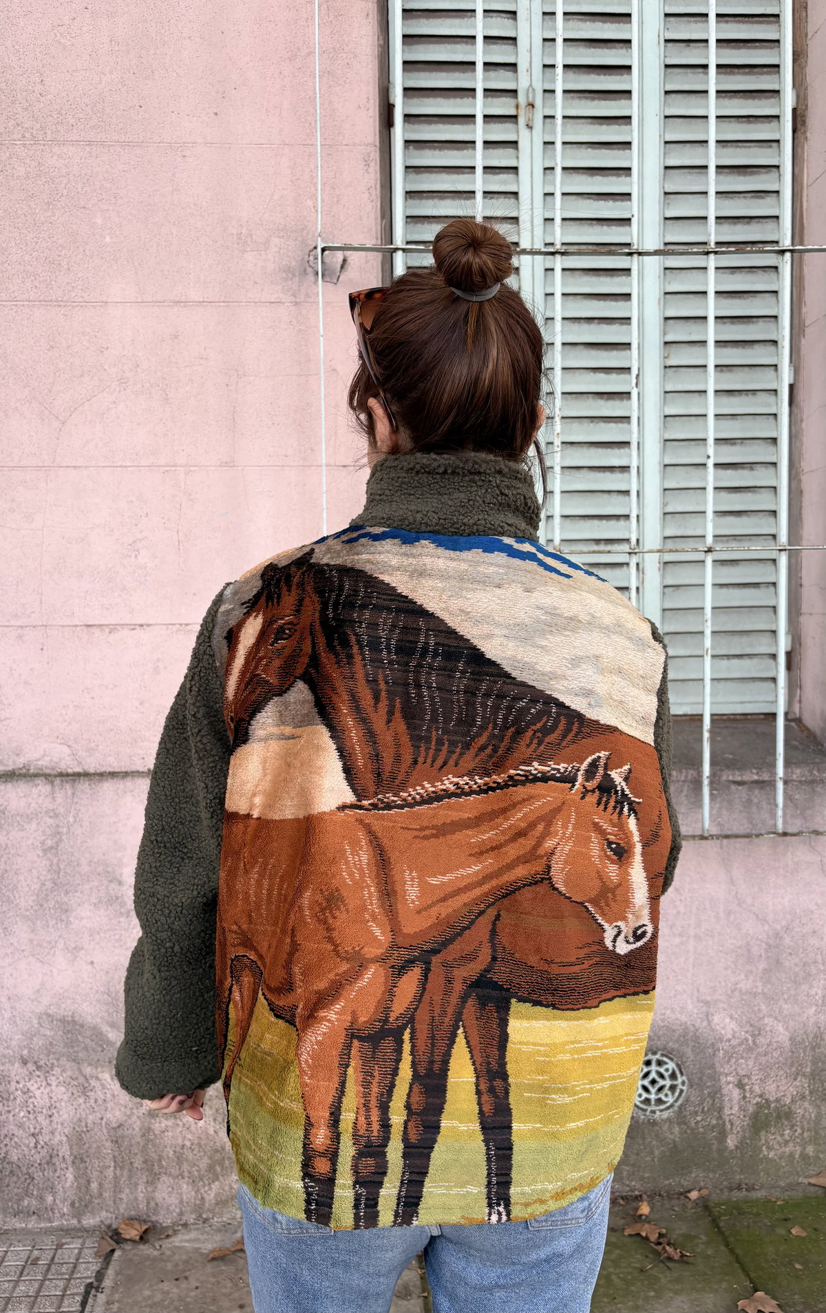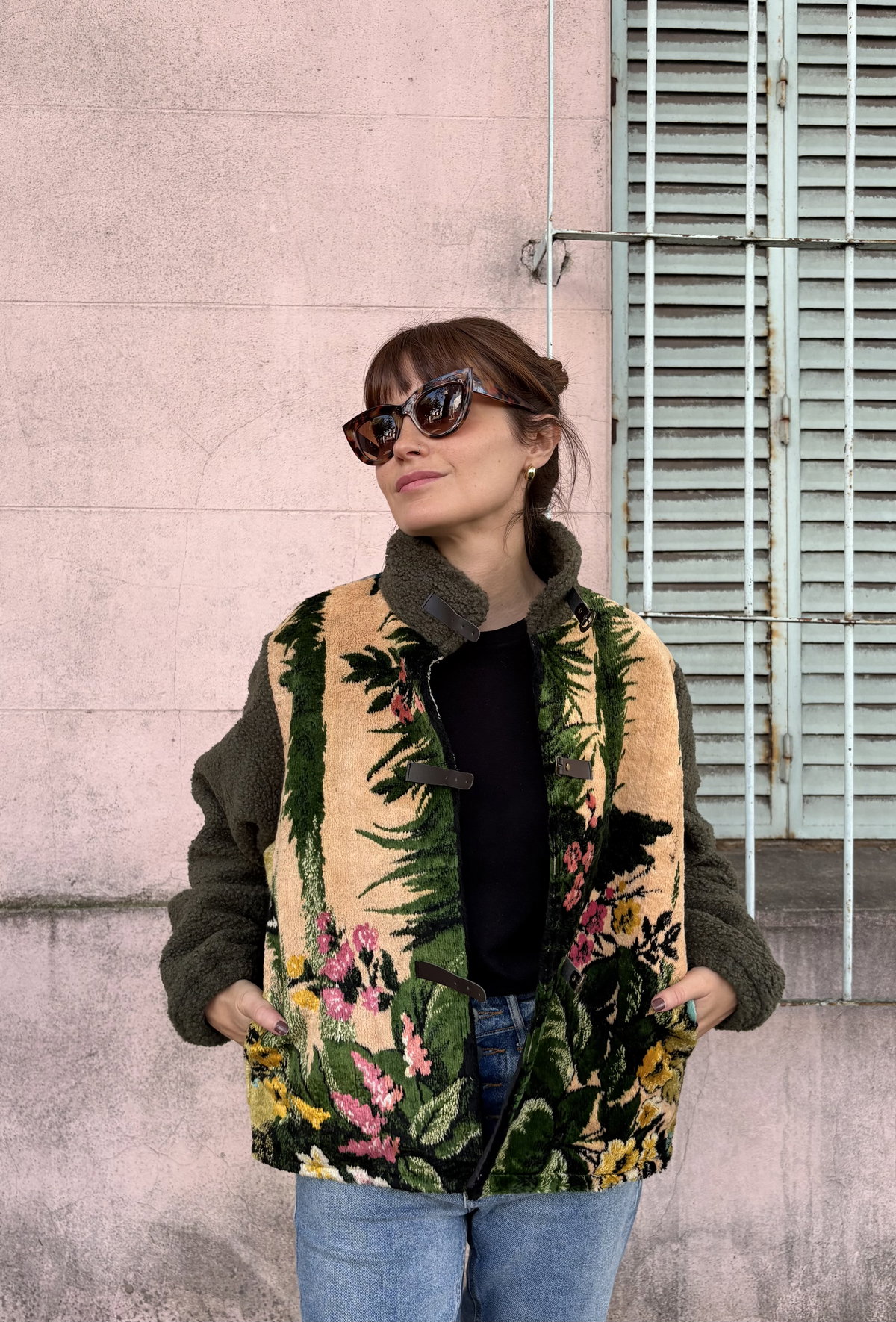 Campera hecha a partir de tapiz de terciopelo antiguo combinado con paño bouclé en mangas y cuello. Tiene bolsillos y está íntegramente forrada.