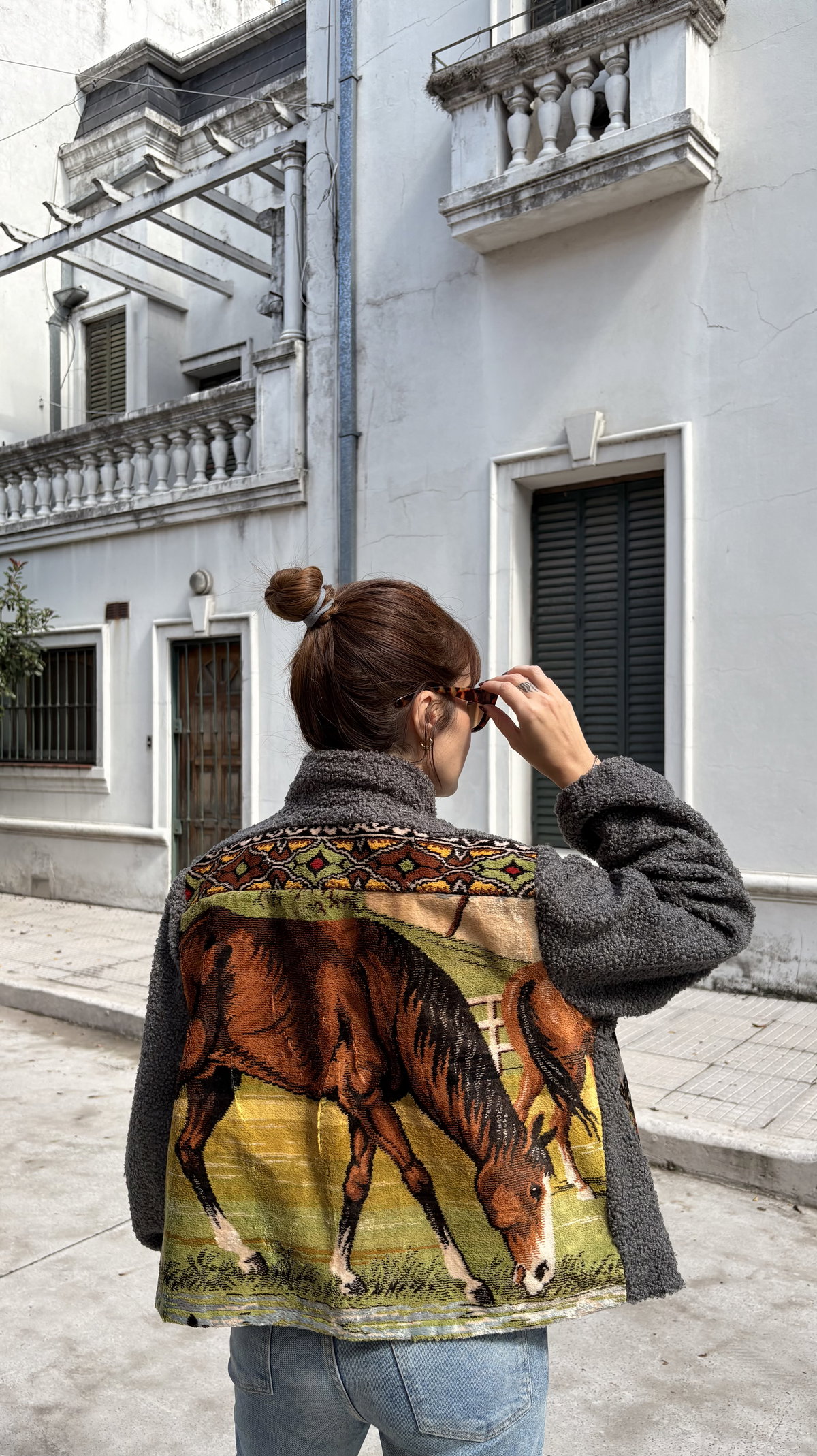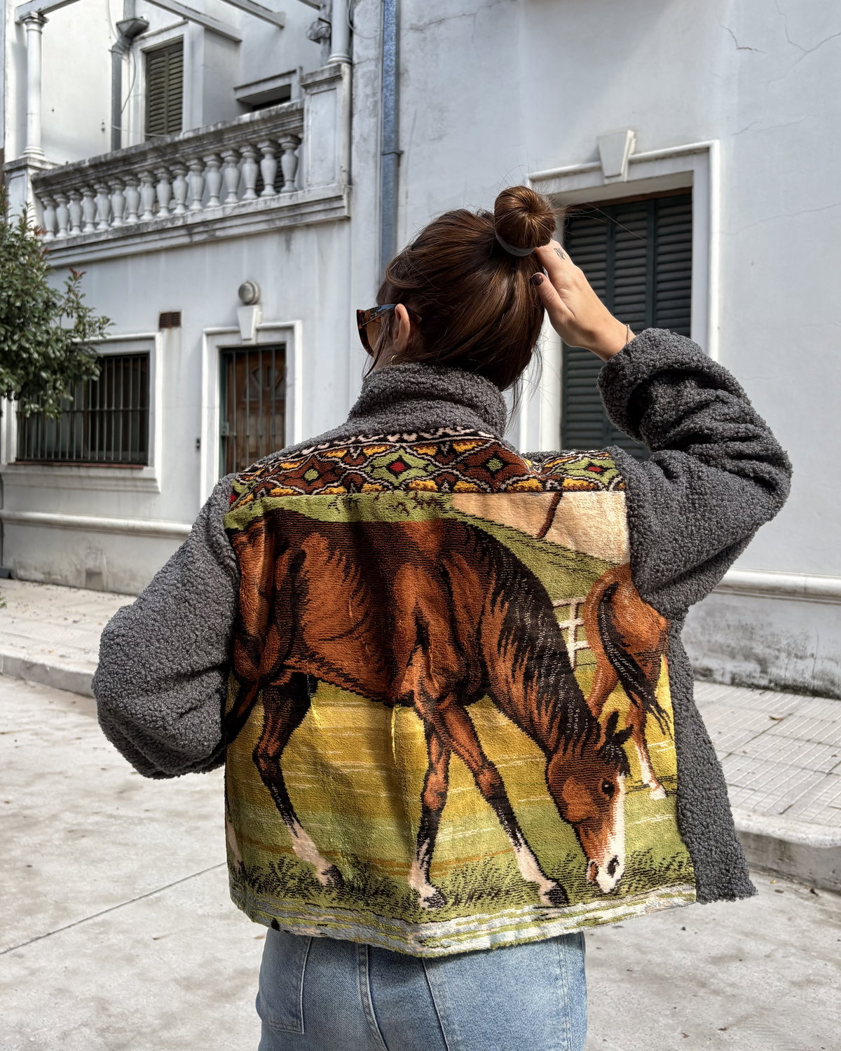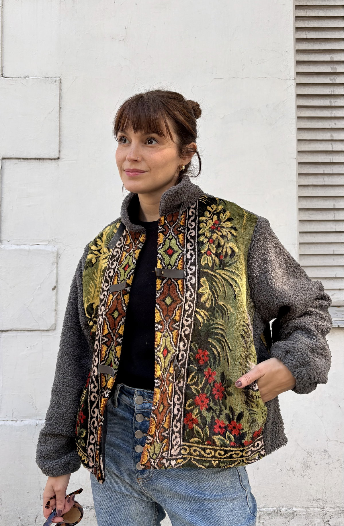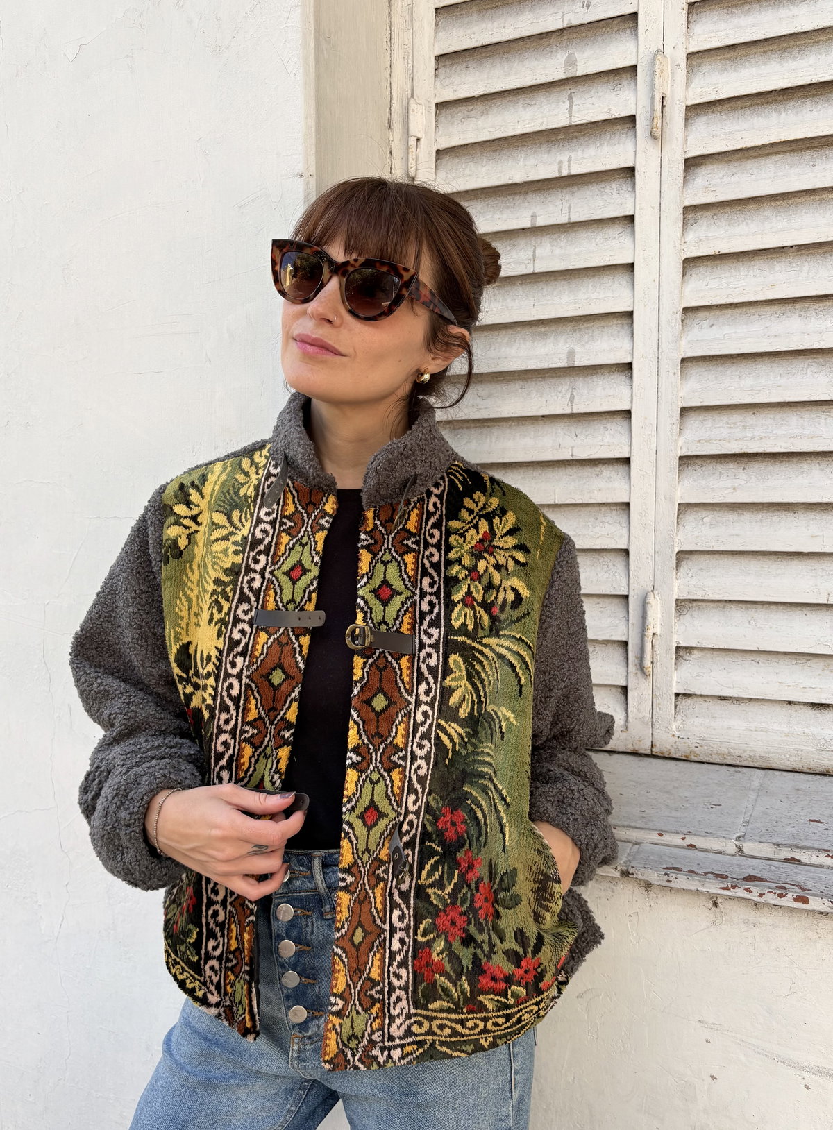Campera hecha a partir de tapiz de terciopelo antiguo combinado con corderito bouclé en mangas y cuello. Tiene bolsillos y está íntegramente forrada.