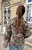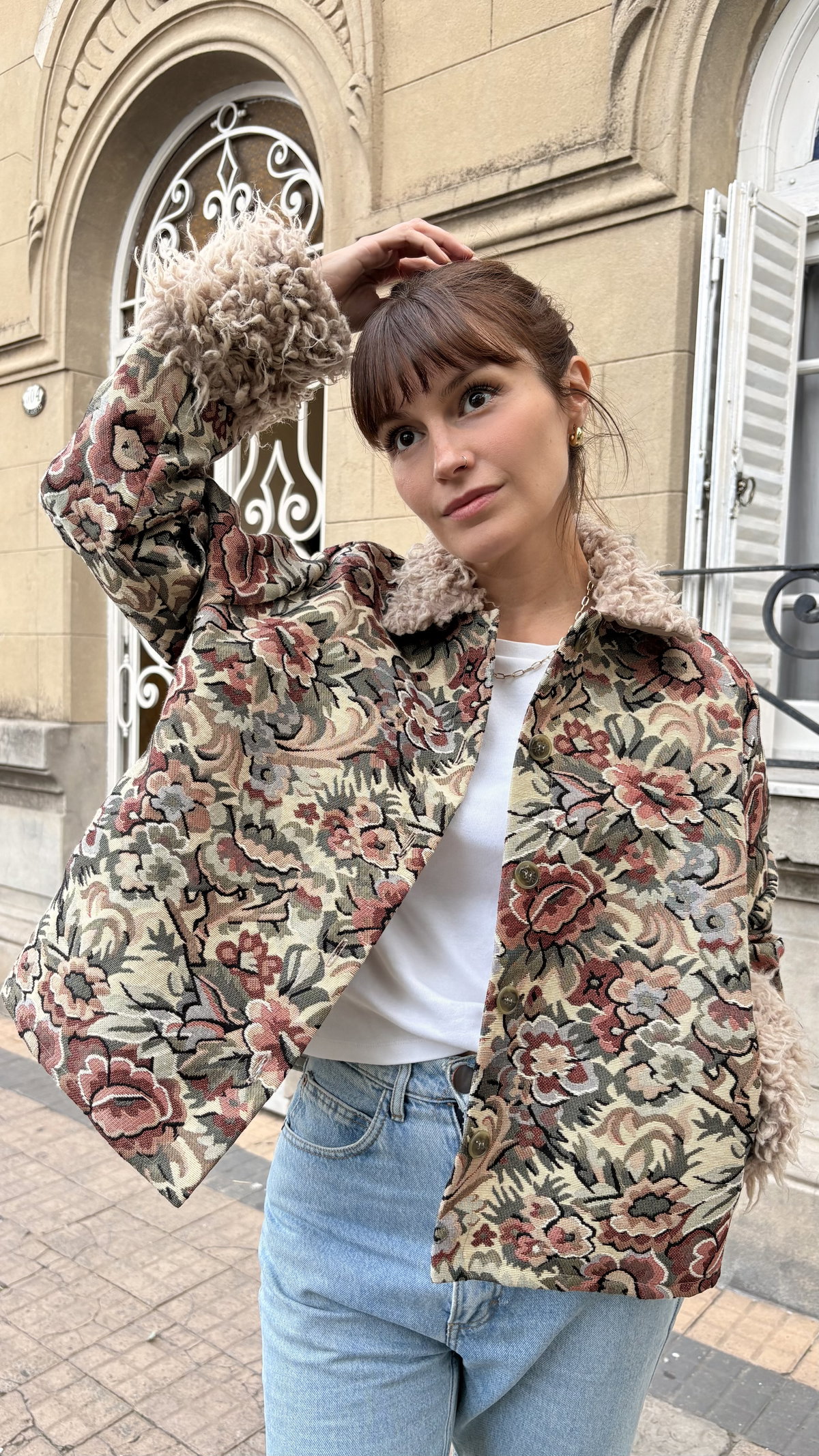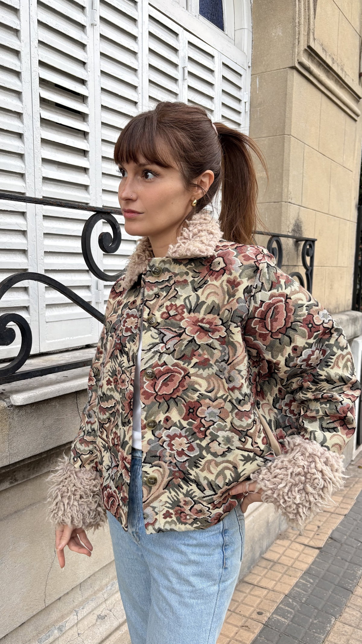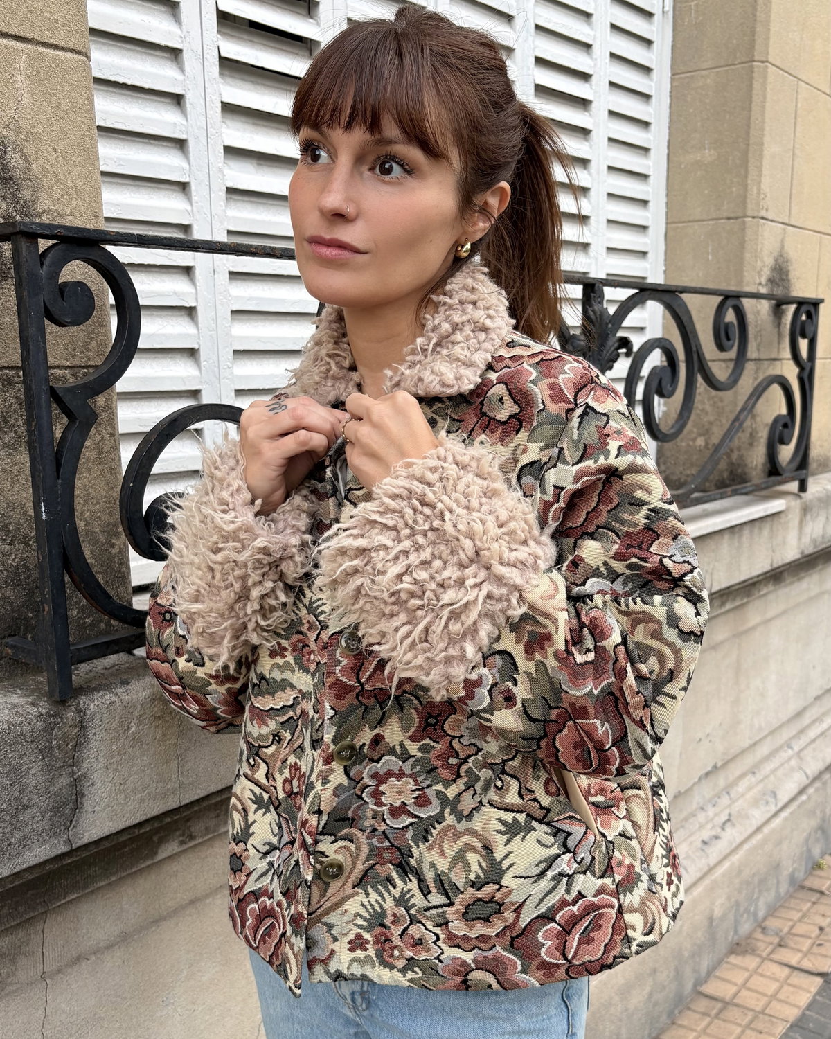 Campera confeccionada en gobelino floreado. Con piel en ruedo de mangas y cuello. Tiene bolsillos y está íntegramente forrada.