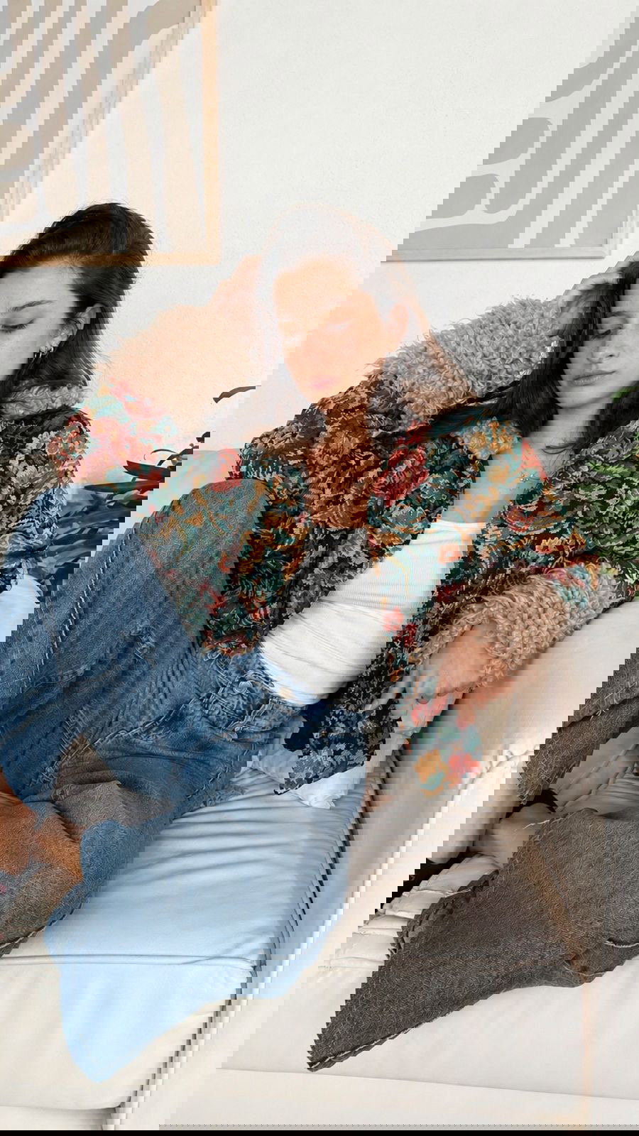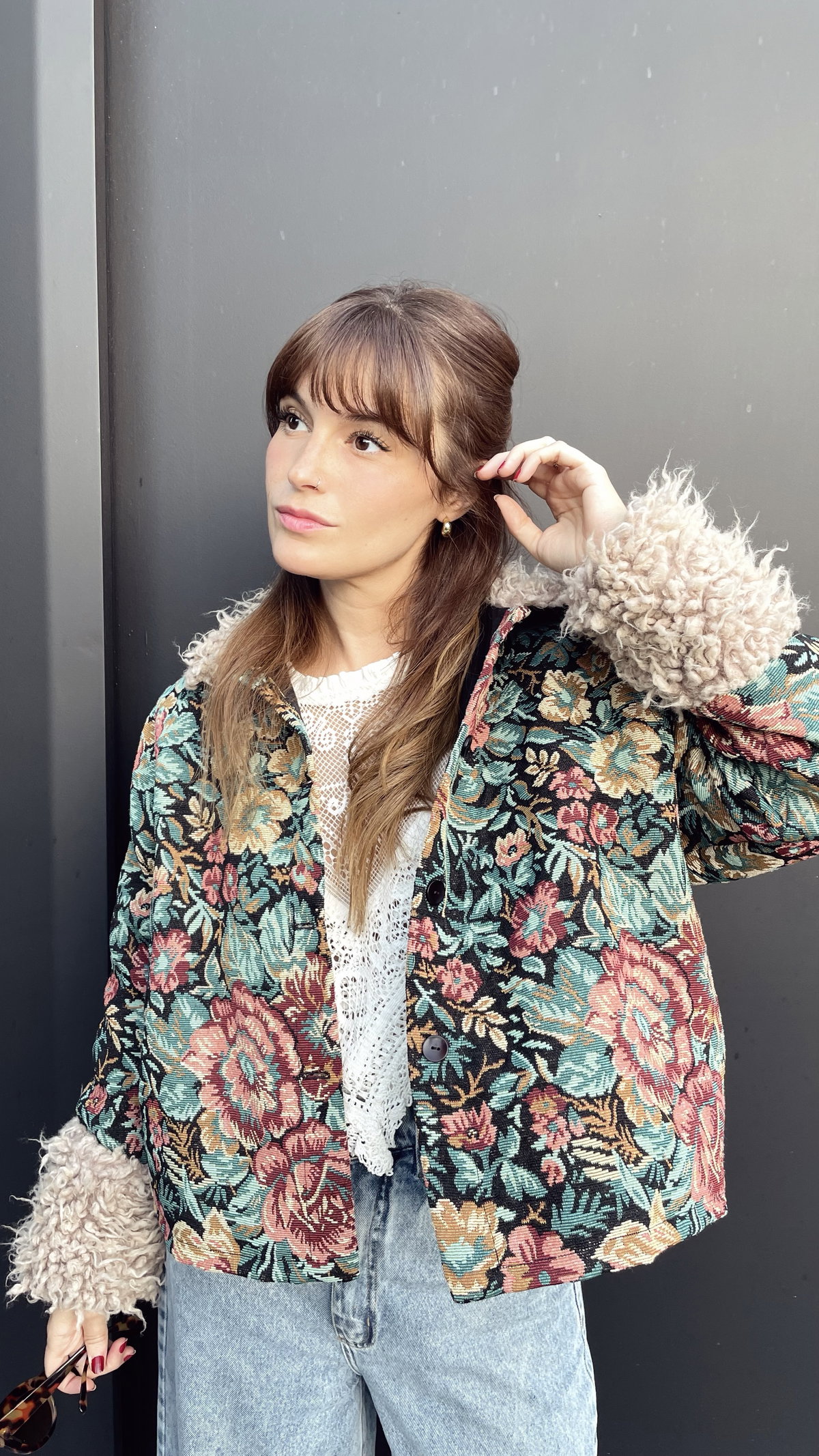 Campera confeccionada en gobelino floreado. Con piel en ruedo de mangas y cuello. Integramente forrada