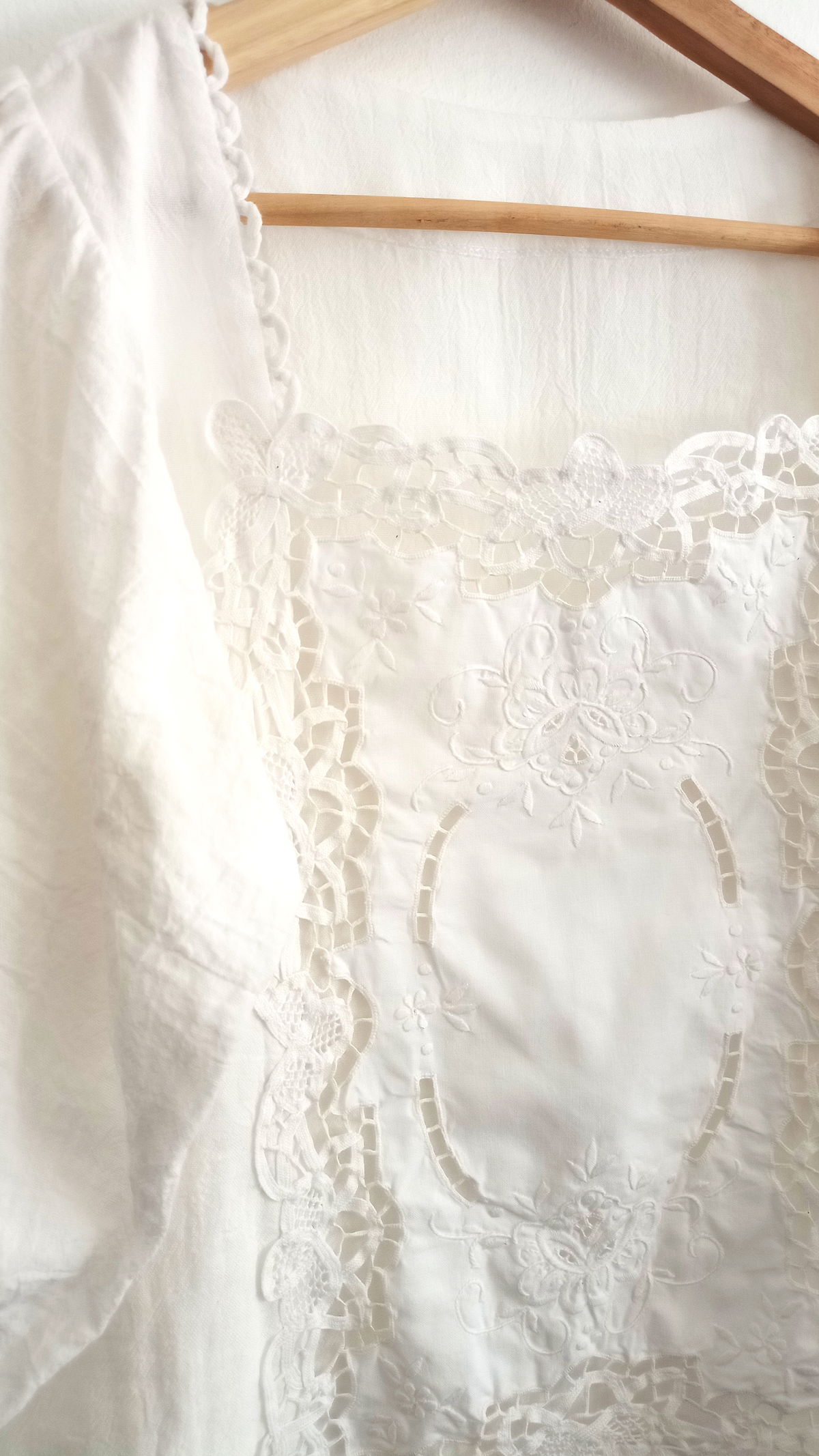 Blusa de gasa de algodón con mangas abullonadas y aplique de algodón bordado y calado. Talle M
