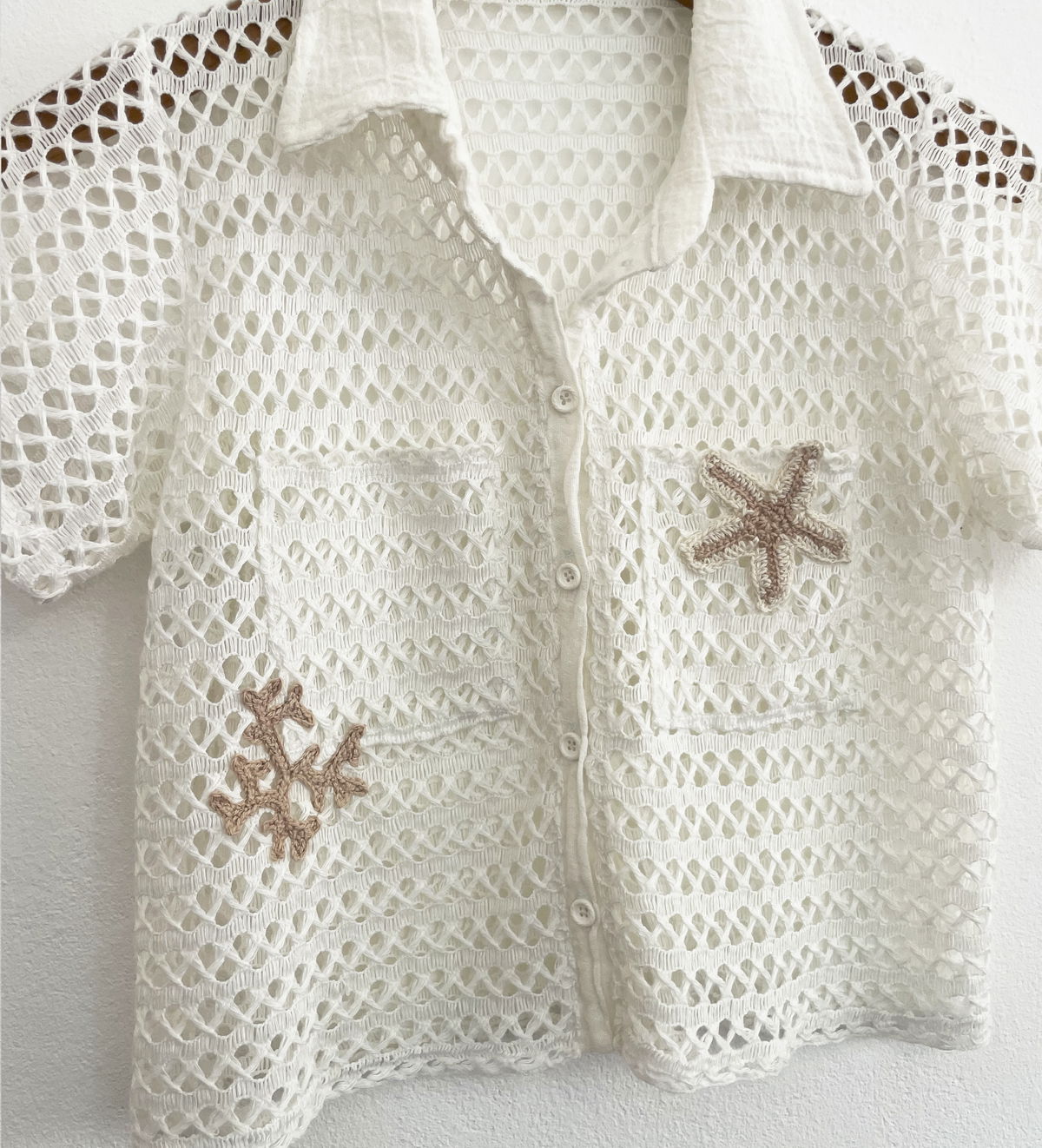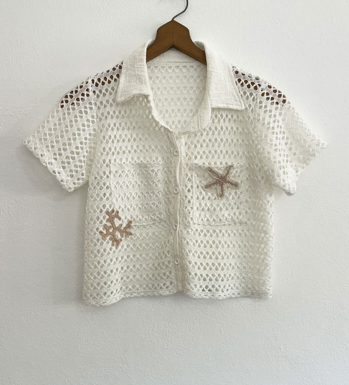 Camisa de género tejido con apliques de estrella de mar y coral tejido en crochet y botones de nácar. Talle S