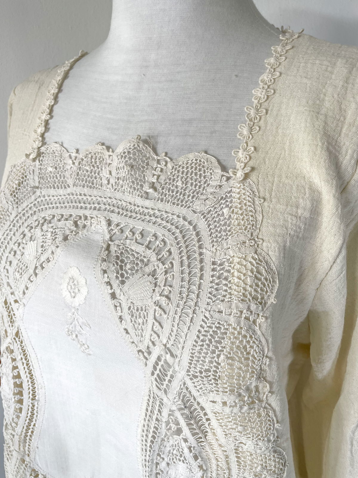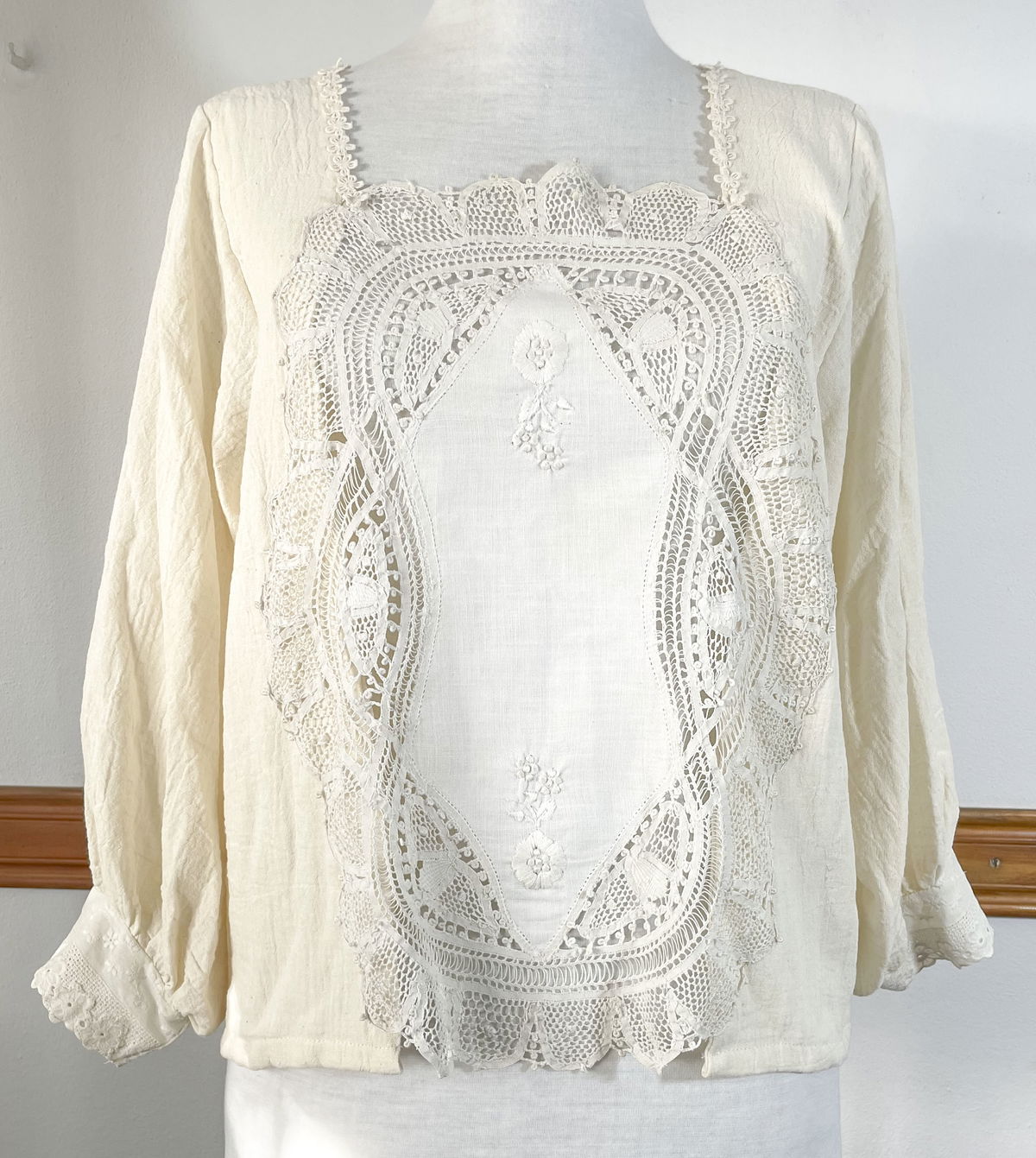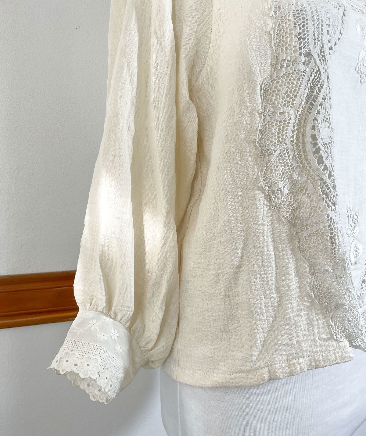 Blusa de gasa de algodón con aplique vintage bordado y con detalles tejidos. Mangas abullonadas y terminación en puño de puntilla broderie. Talle L (La modelo mide 100cm de busto)