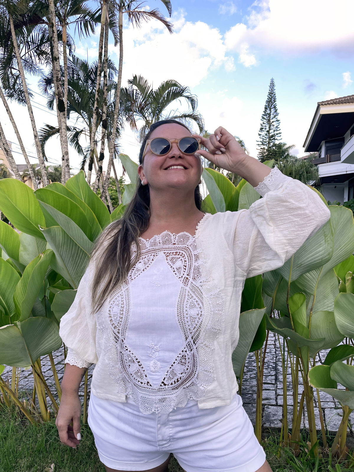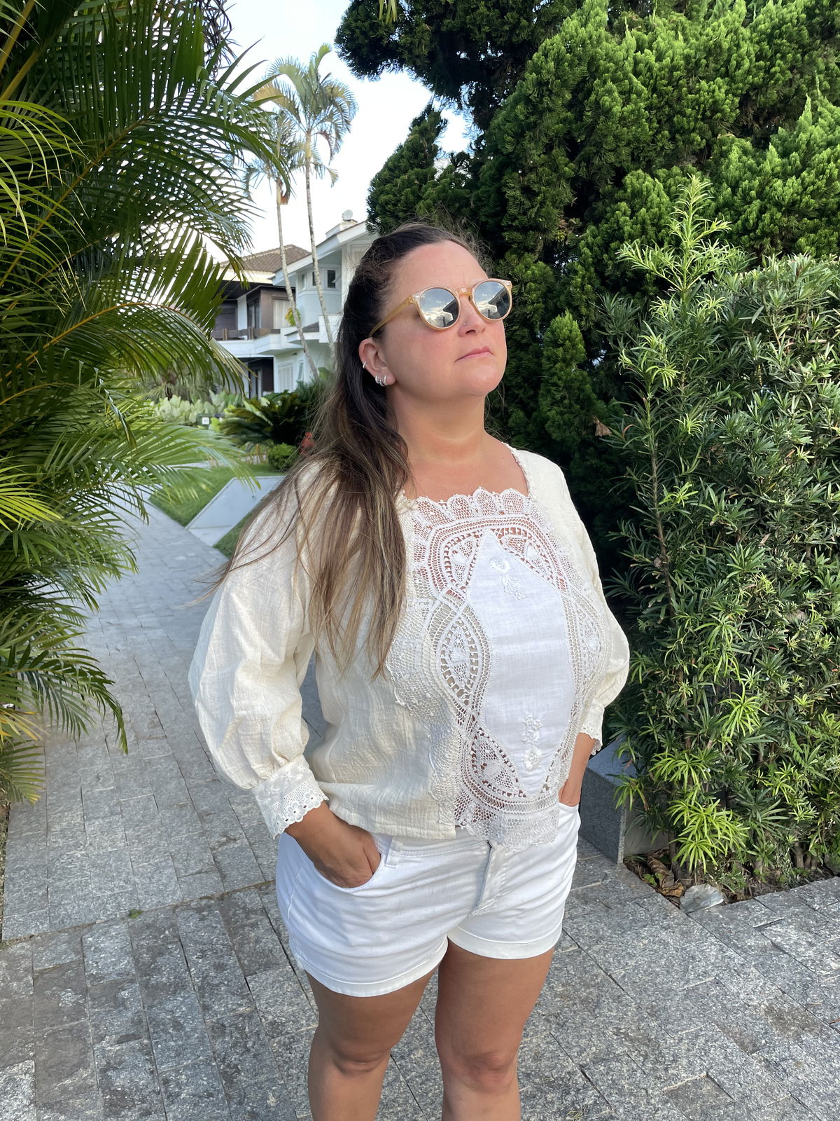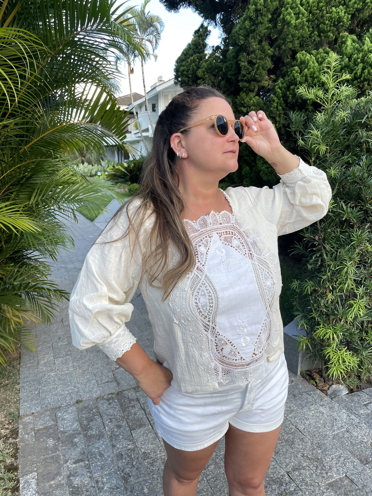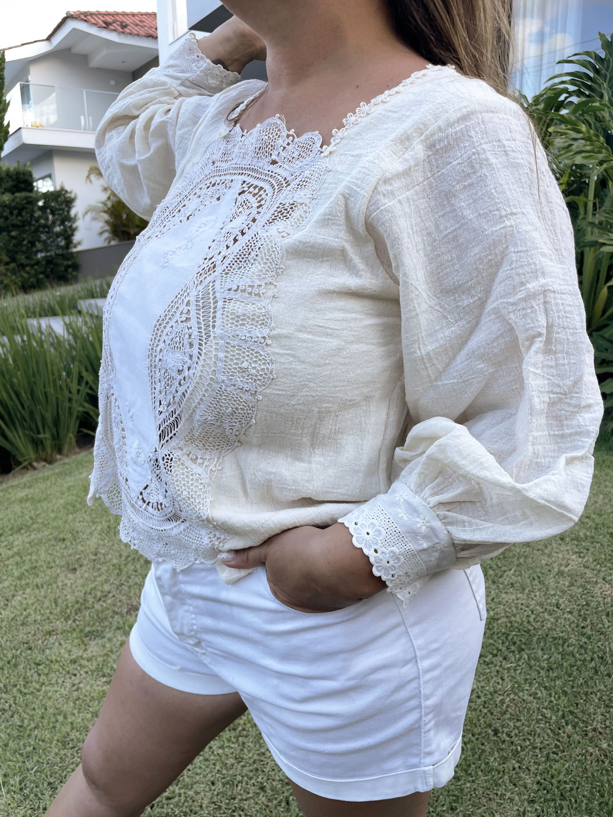 Blusa de gasa de algodón con aplique vintage bordado y con detalles tejidos. Mangas abullonadas y terminación en puño de puntilla broderie. Talle L (La modelo mide 100cm de busto)