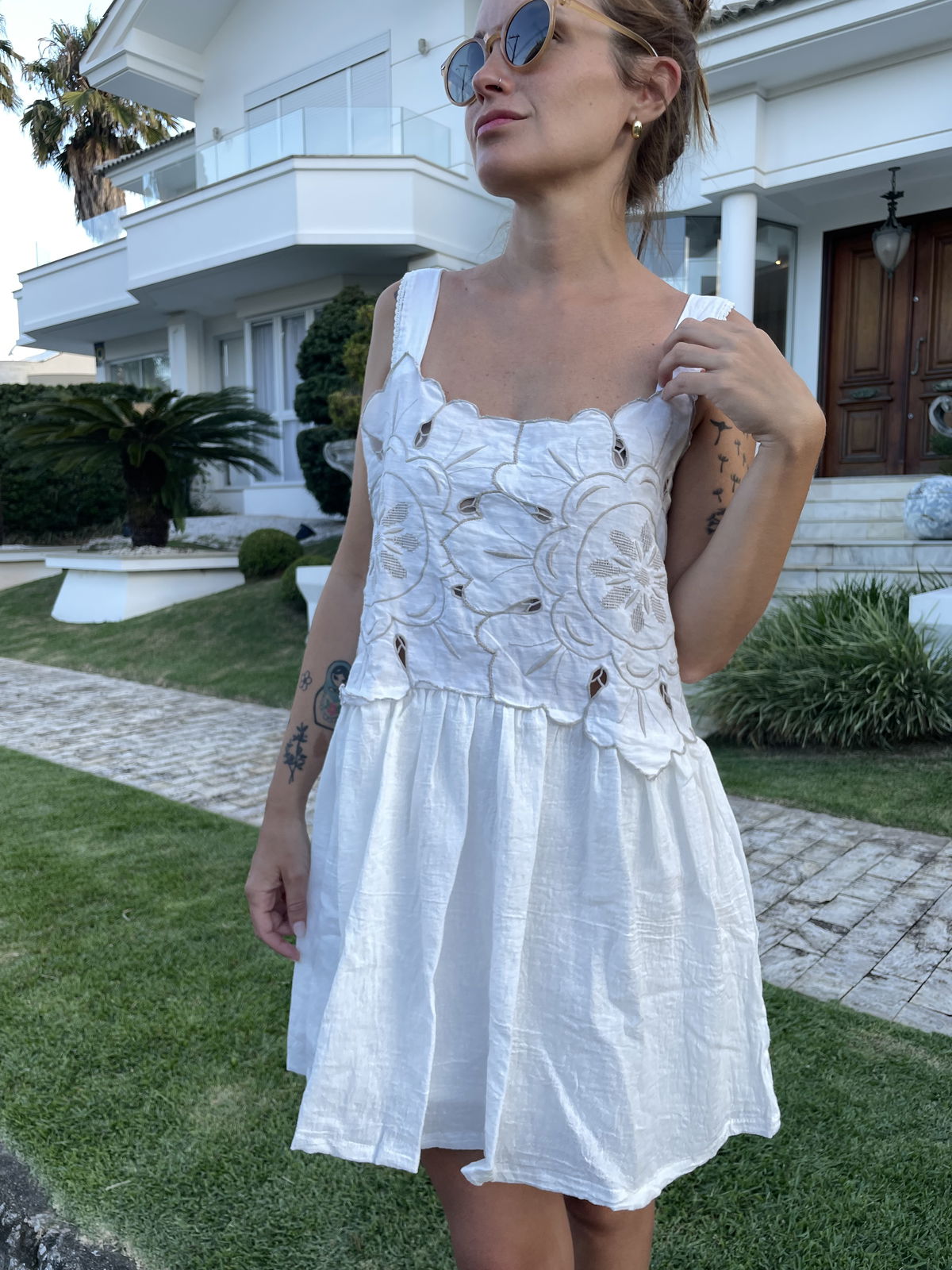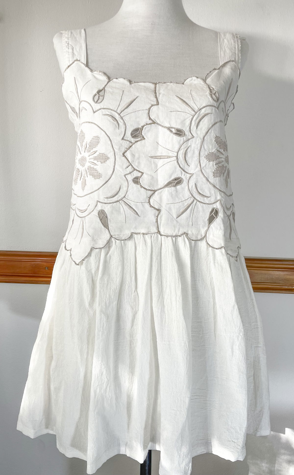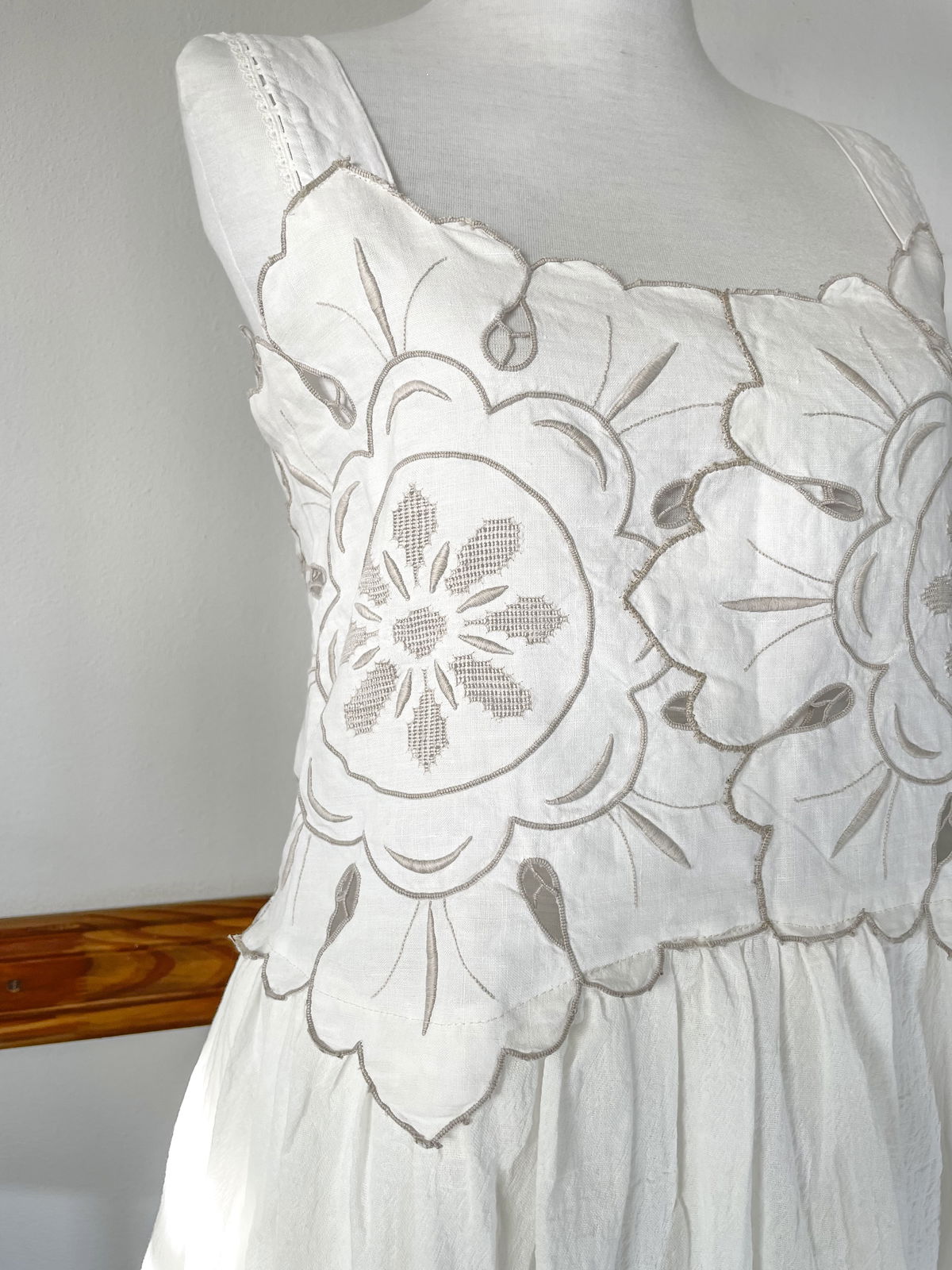 Vestido de gasa algodón con canesú bordado y calado. Falda forrada, no se trasluce. Talle S