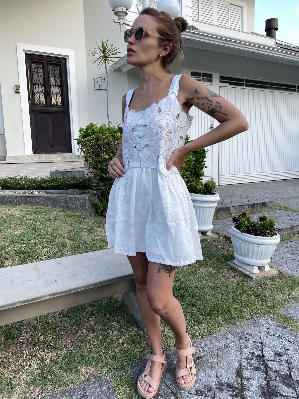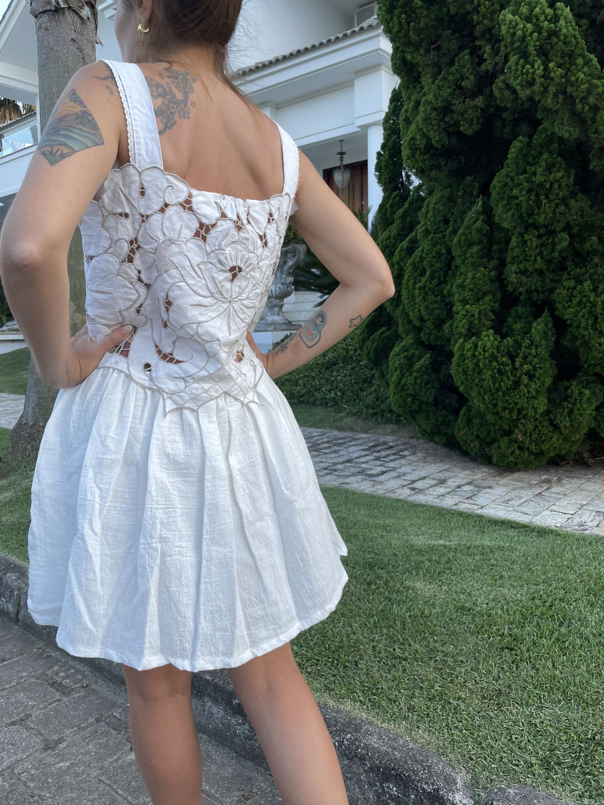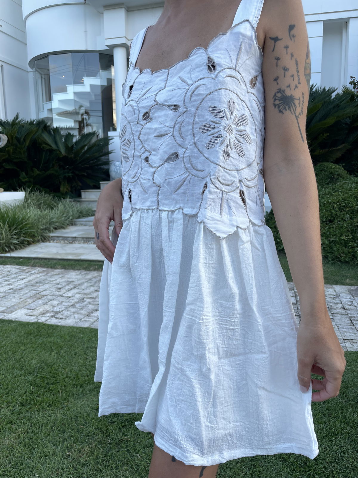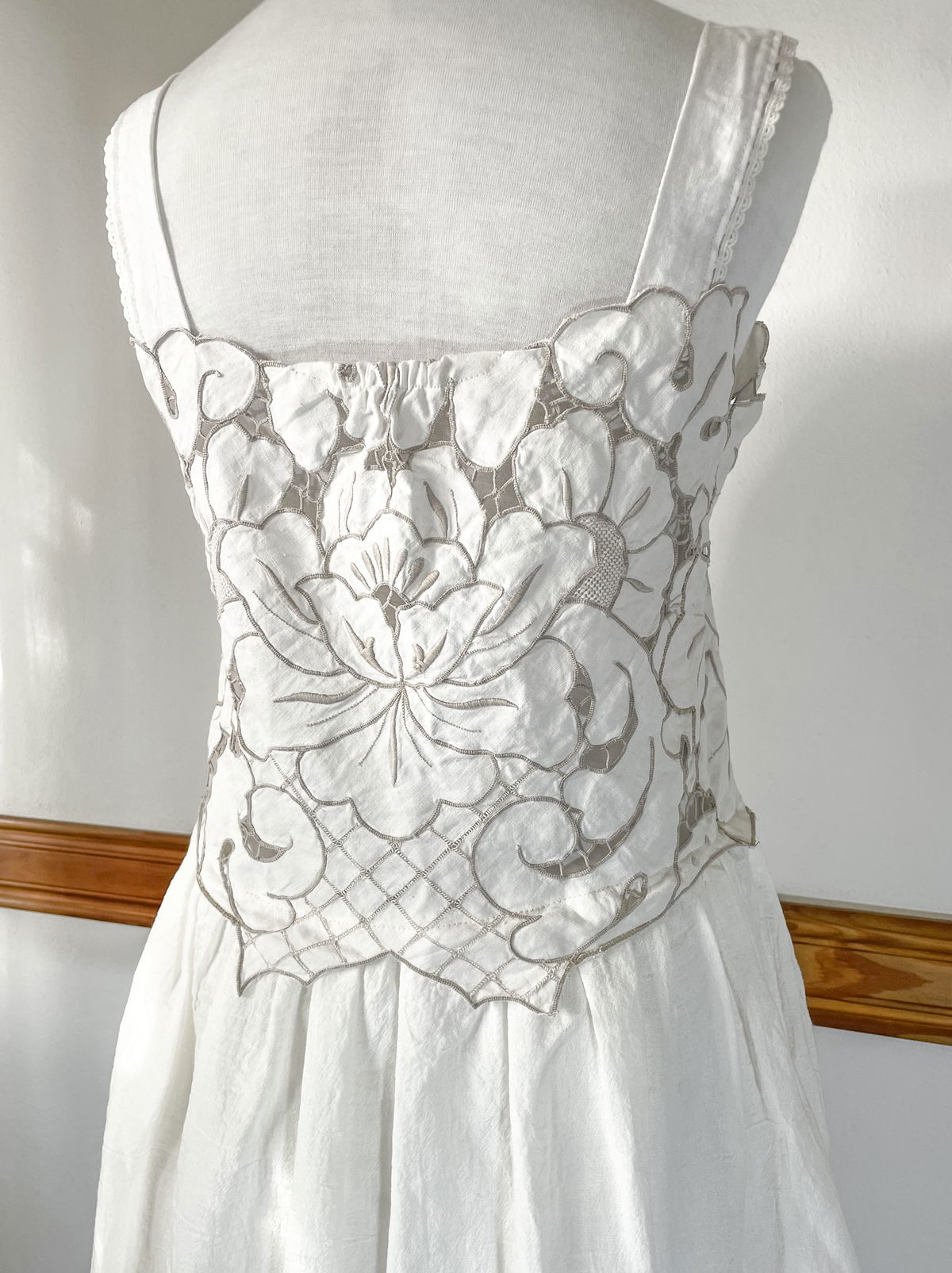 Vestido de gasa algodón con canesú bordado y calado. Falda forrada, no se trasluce. Talle S