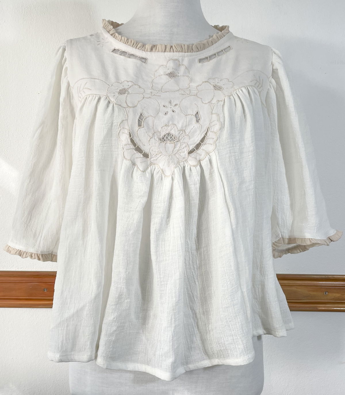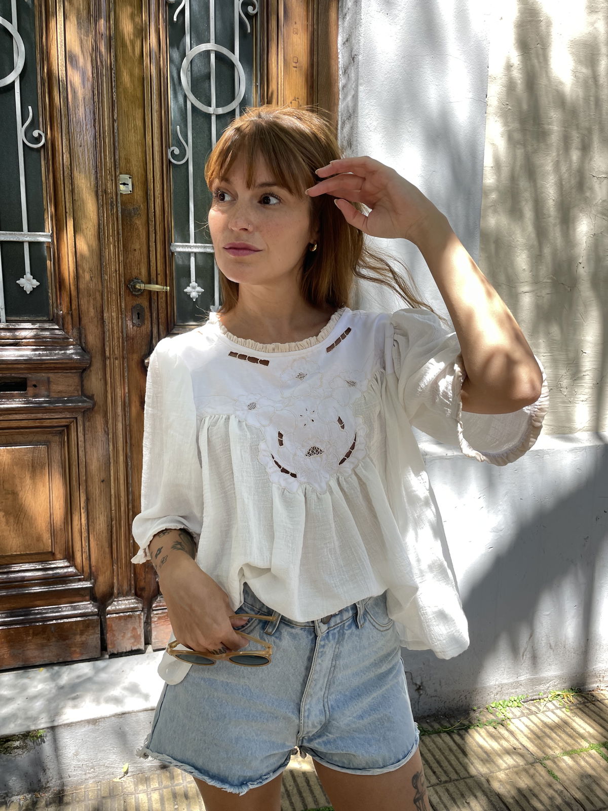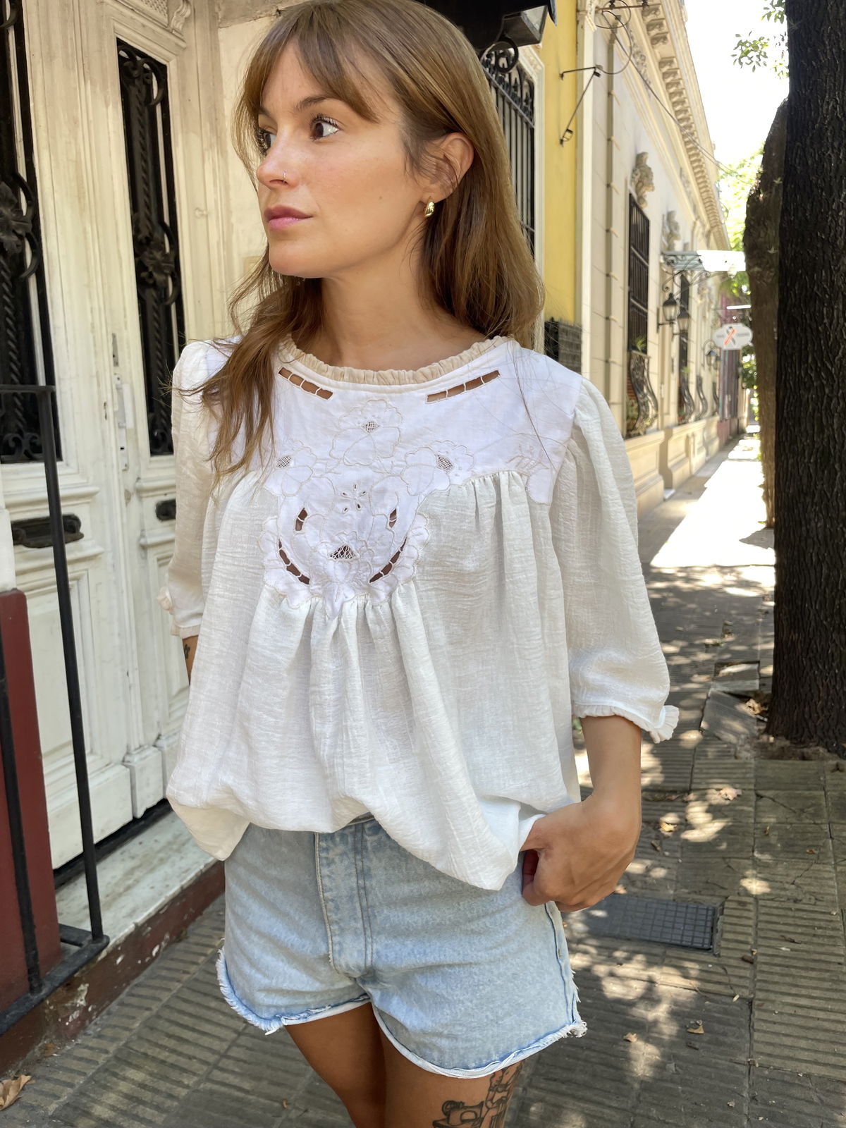 Blusa de gasa de algodón con aplique vintage bordado y calado. Mangas abullonadas, largo 3/4. Talle L