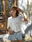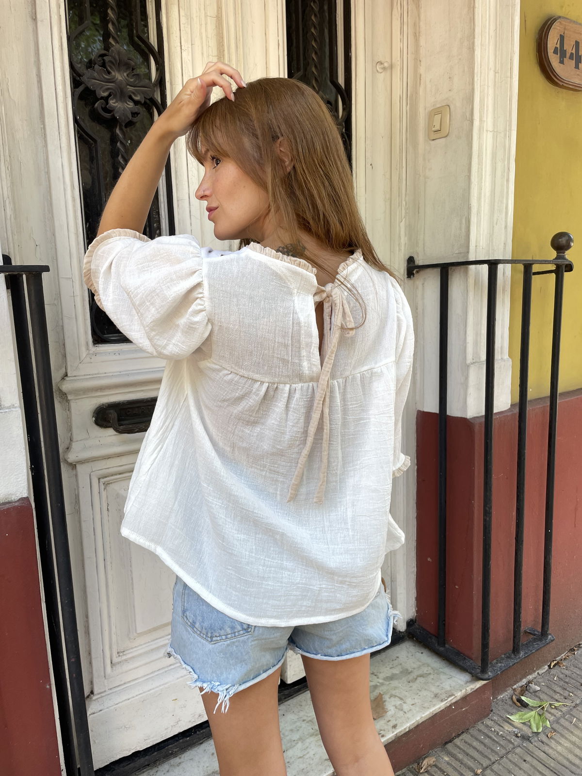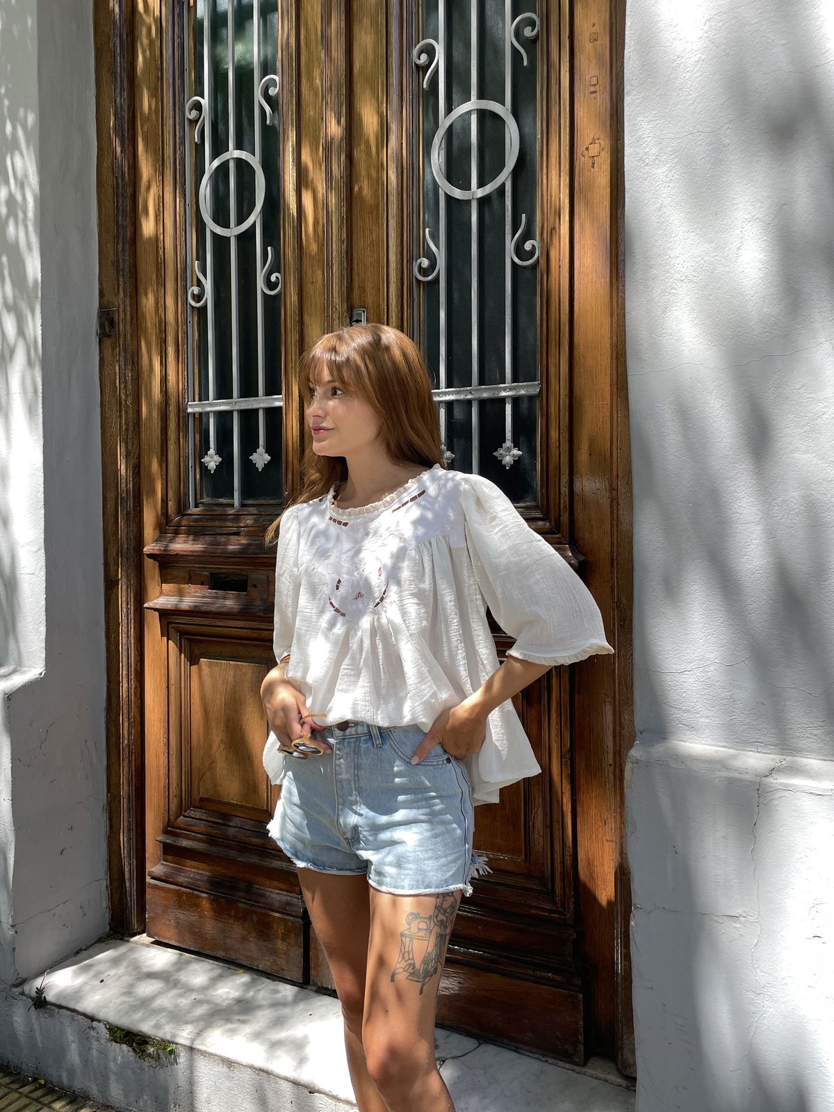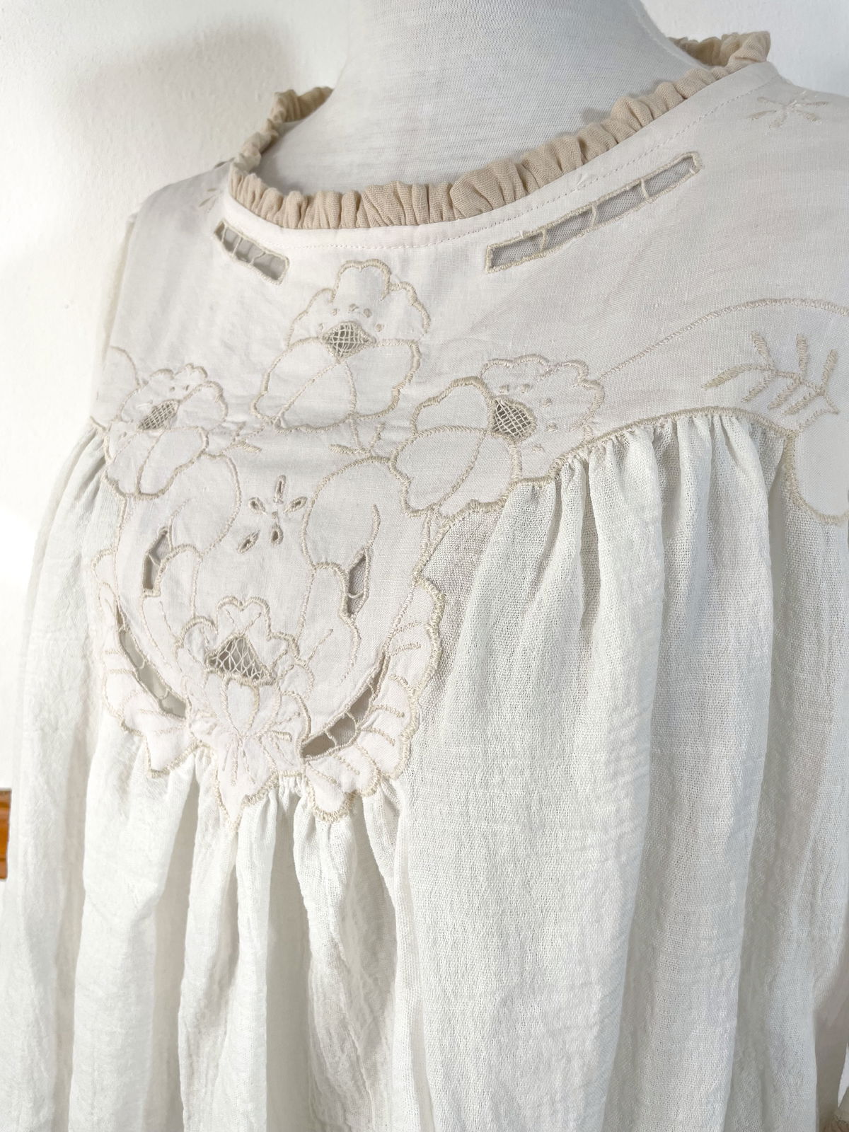 Blusa de gasa de algodón con aplique vintage bordado y calado. Mangas abullonadas, largo 3/4. Talle L