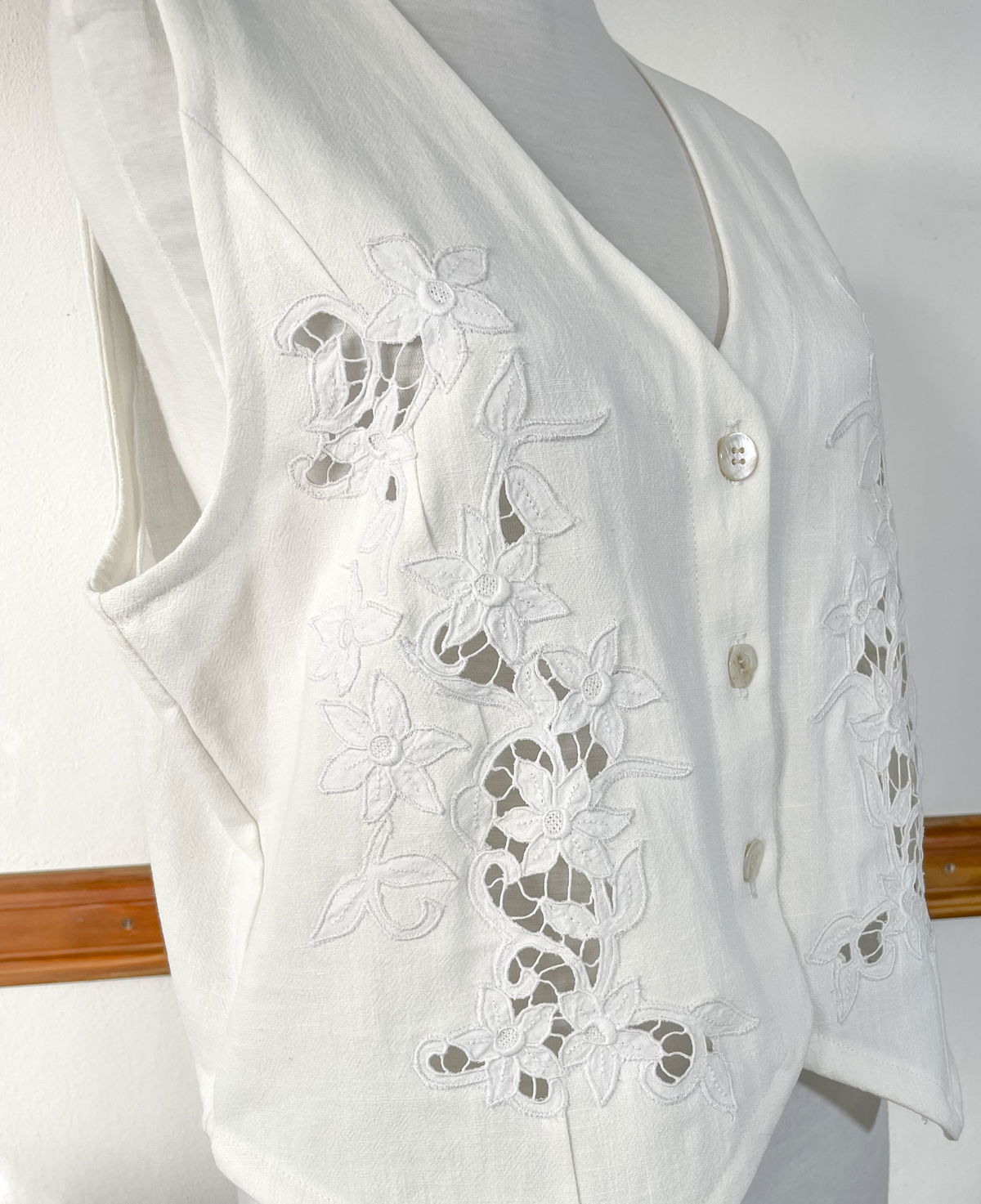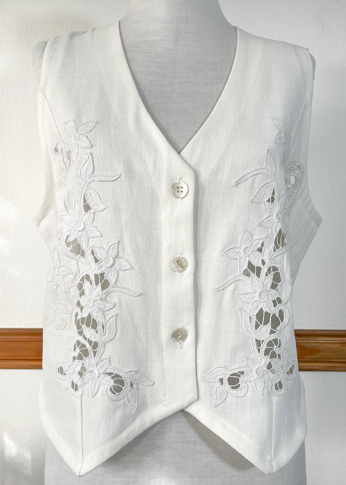 Chaleco de lino con bordado y calado. Talle M