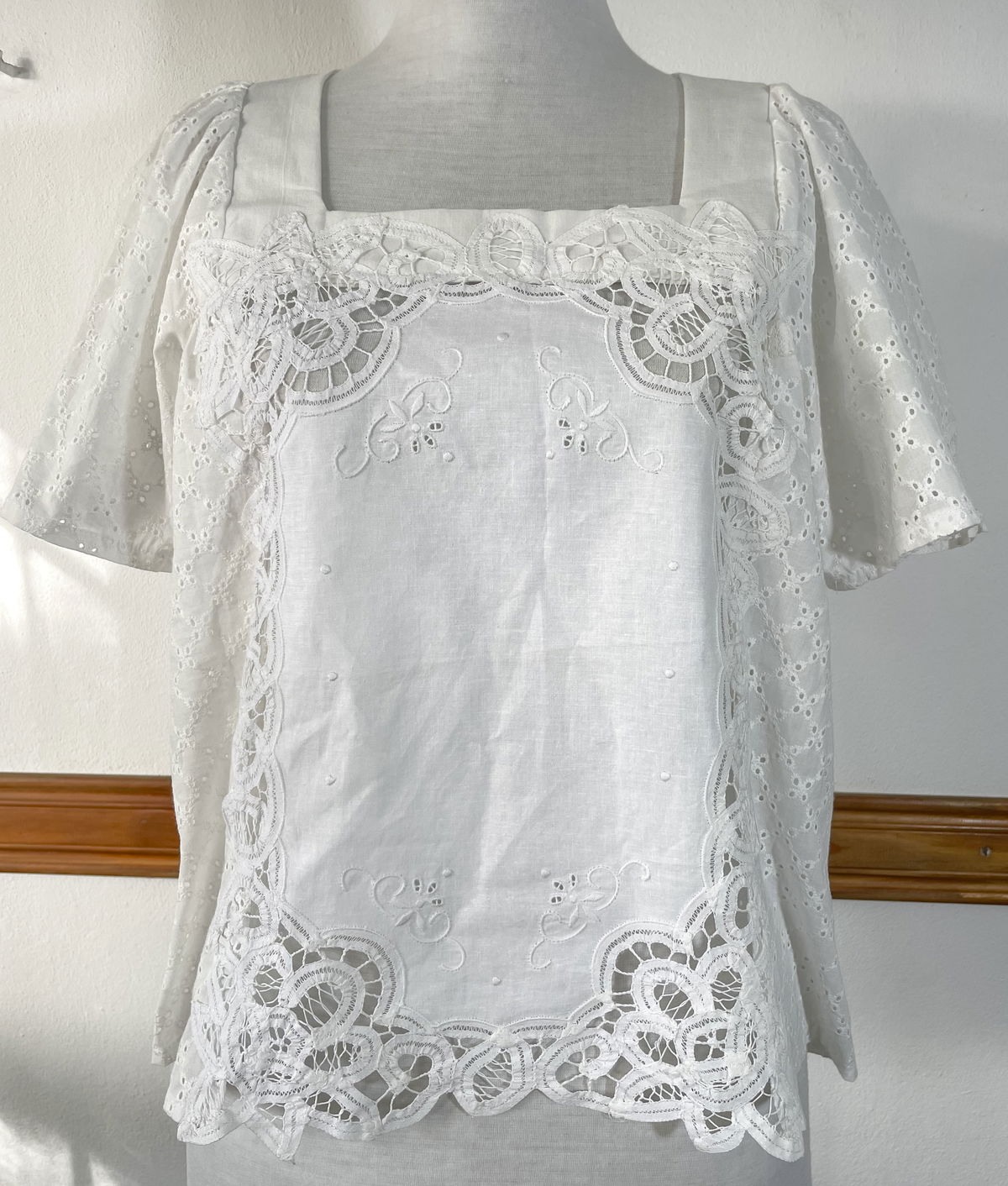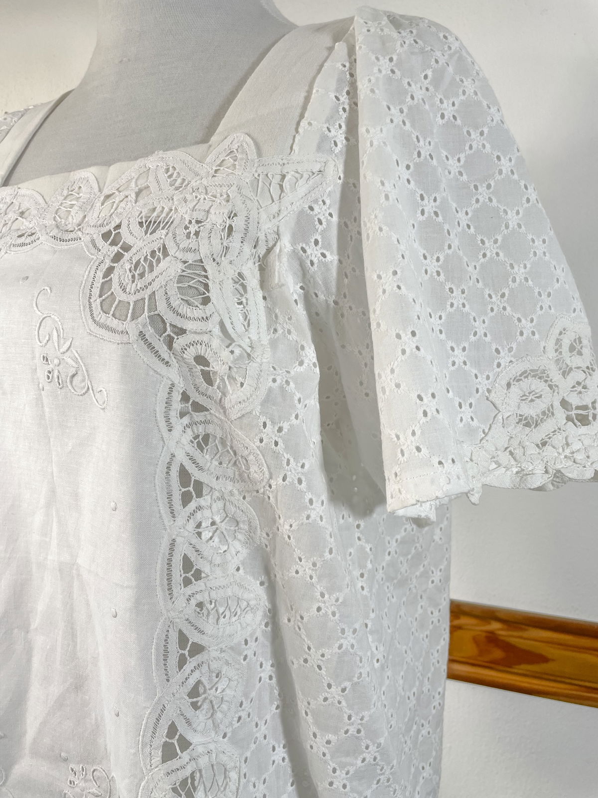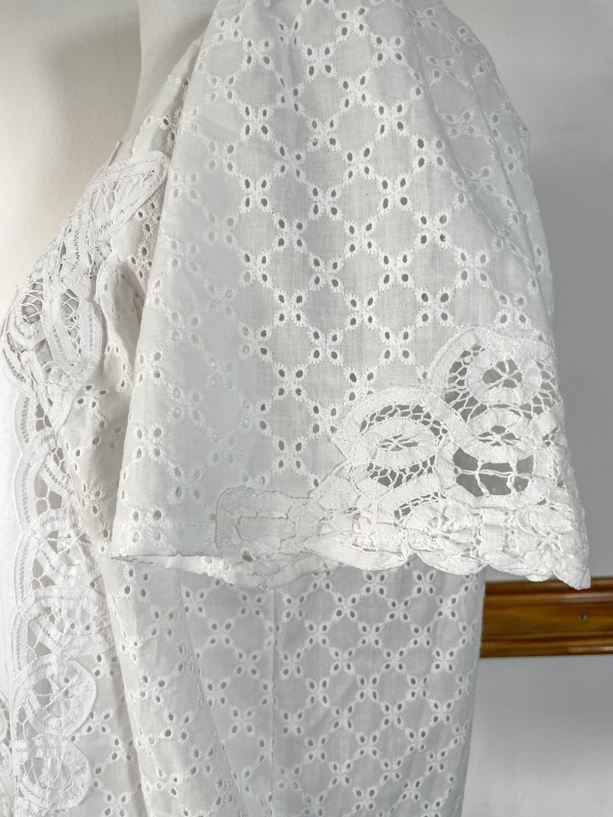 Blusa de broderie de algodón con aplique vintage bordado y calado. Talle L (la modelo mide 100 cm de busto)
