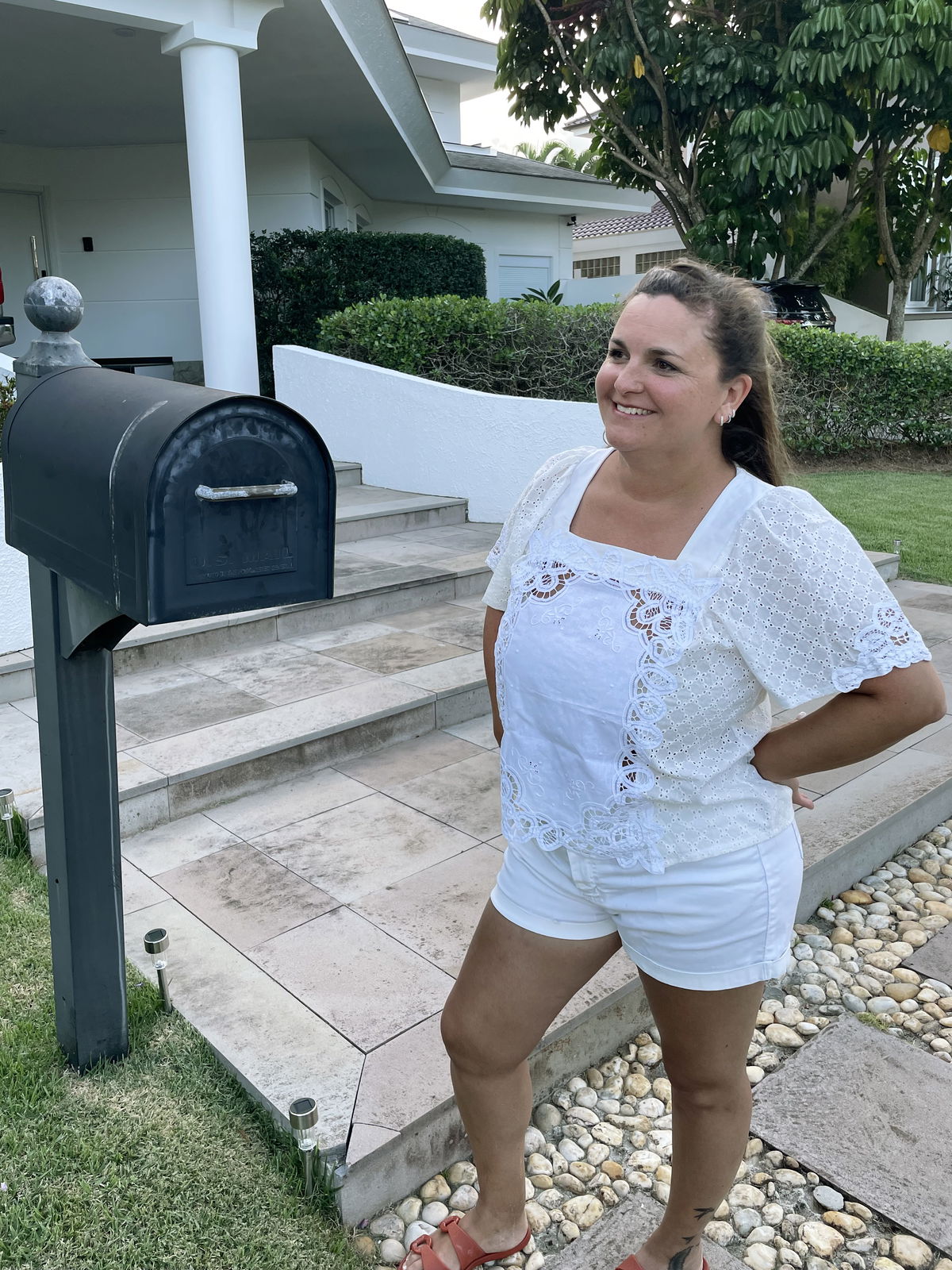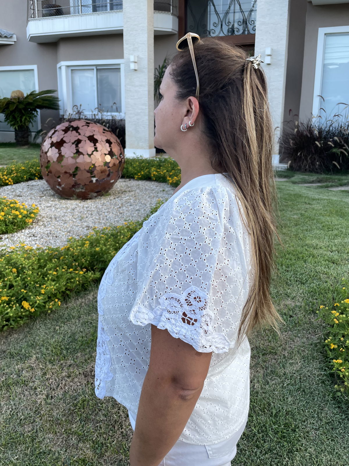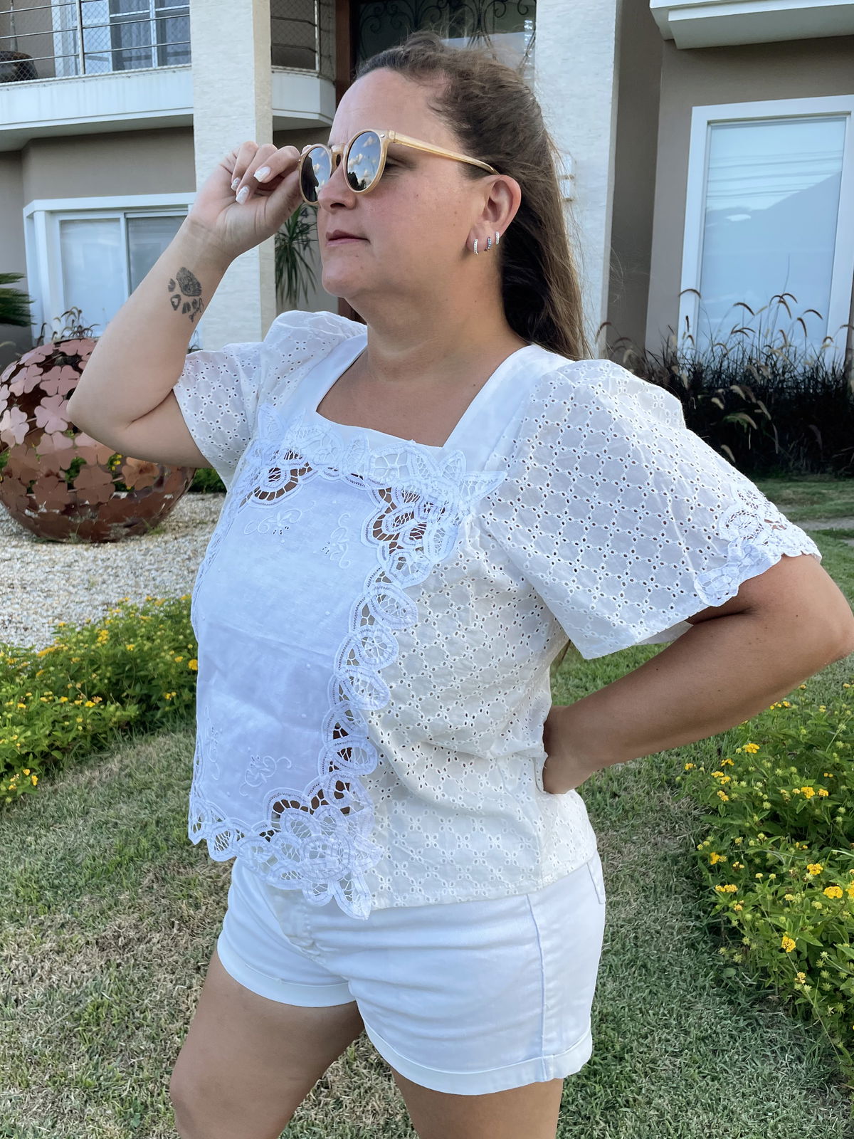 Blusa de broderie de algodón con aplique vintage bordado y calado. Talle L (la modelo mide 100 cm de busto)