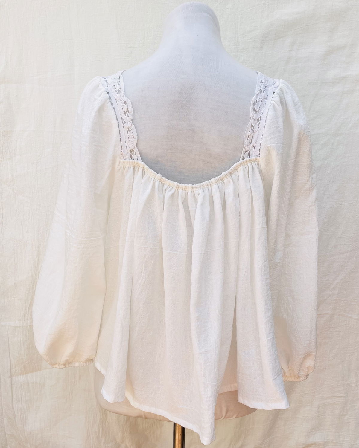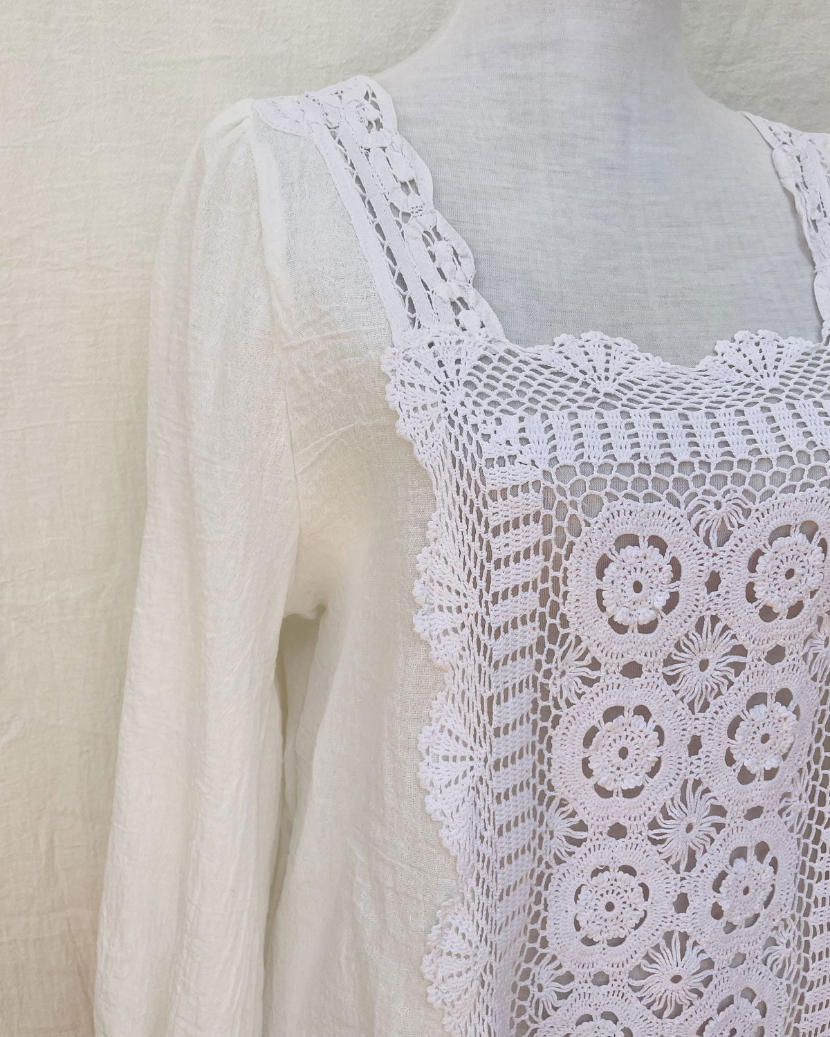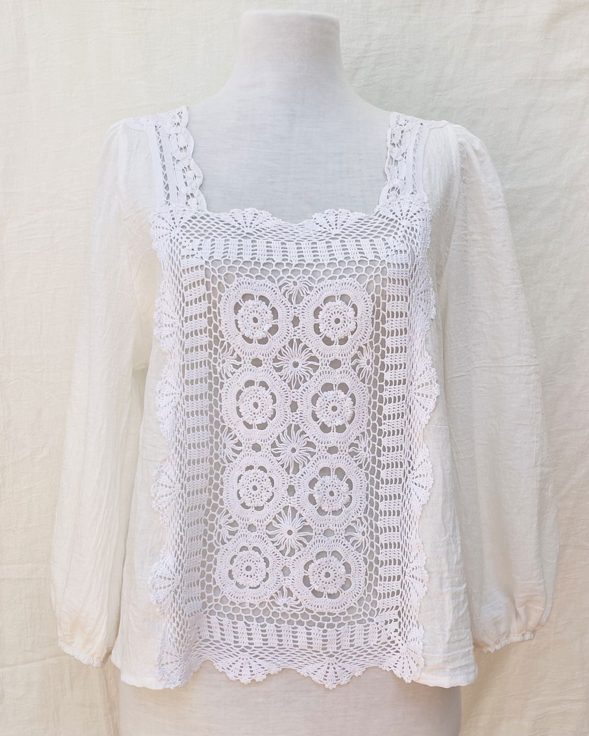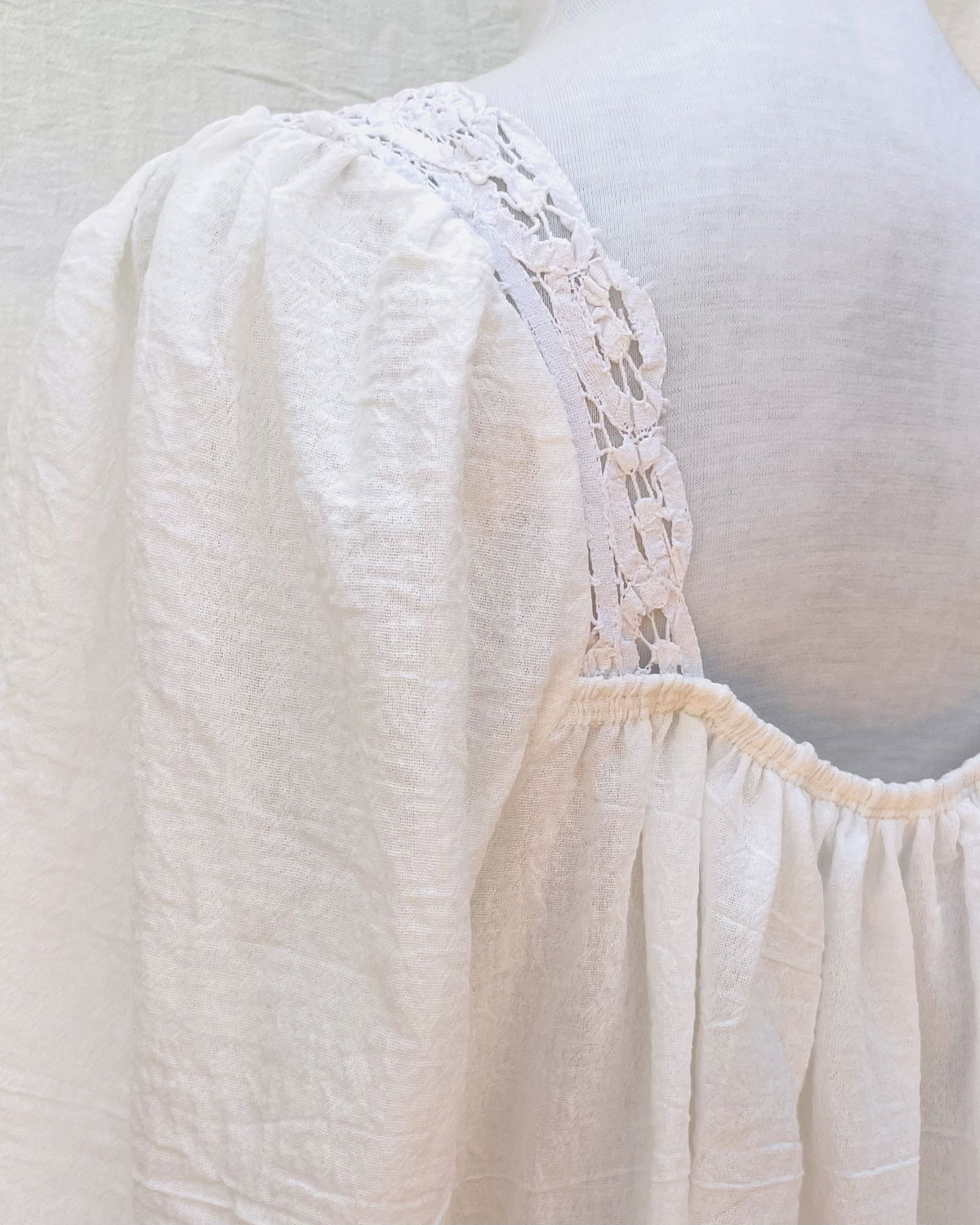 Blusa de gasa de algodón con aplique vintage tejido en crochet. Espalda con mucha aplitud. Mangas abullonadas. Talle L