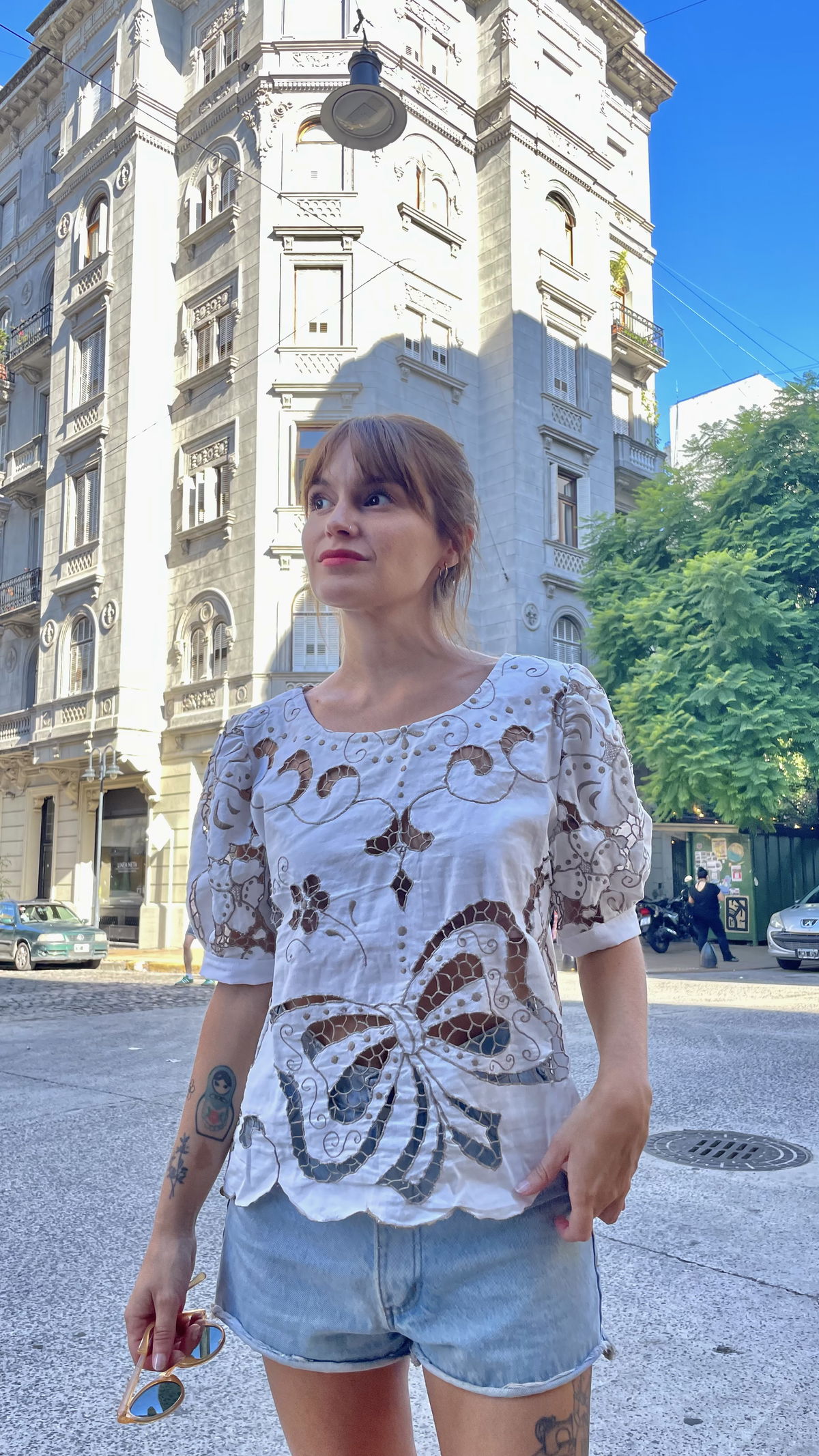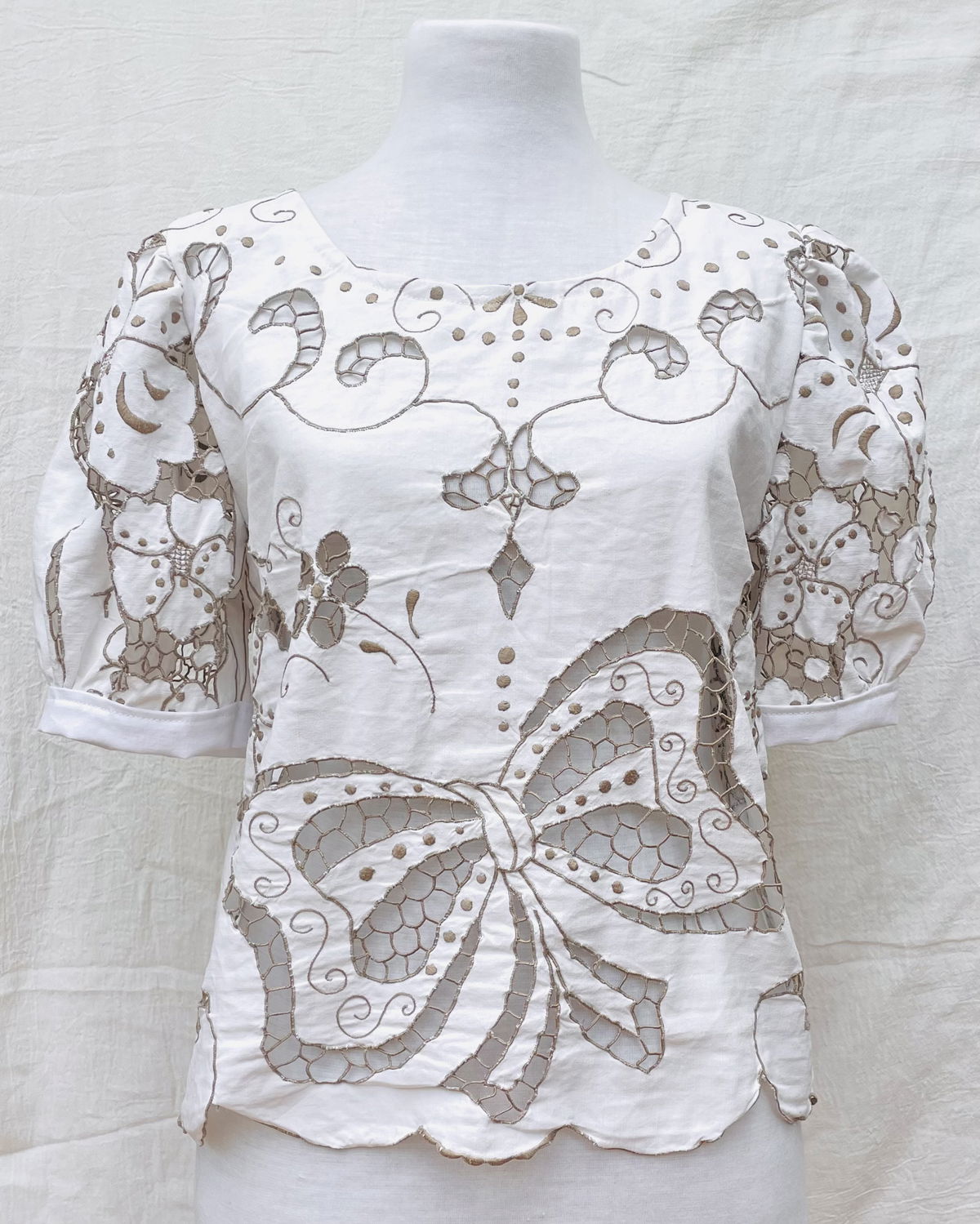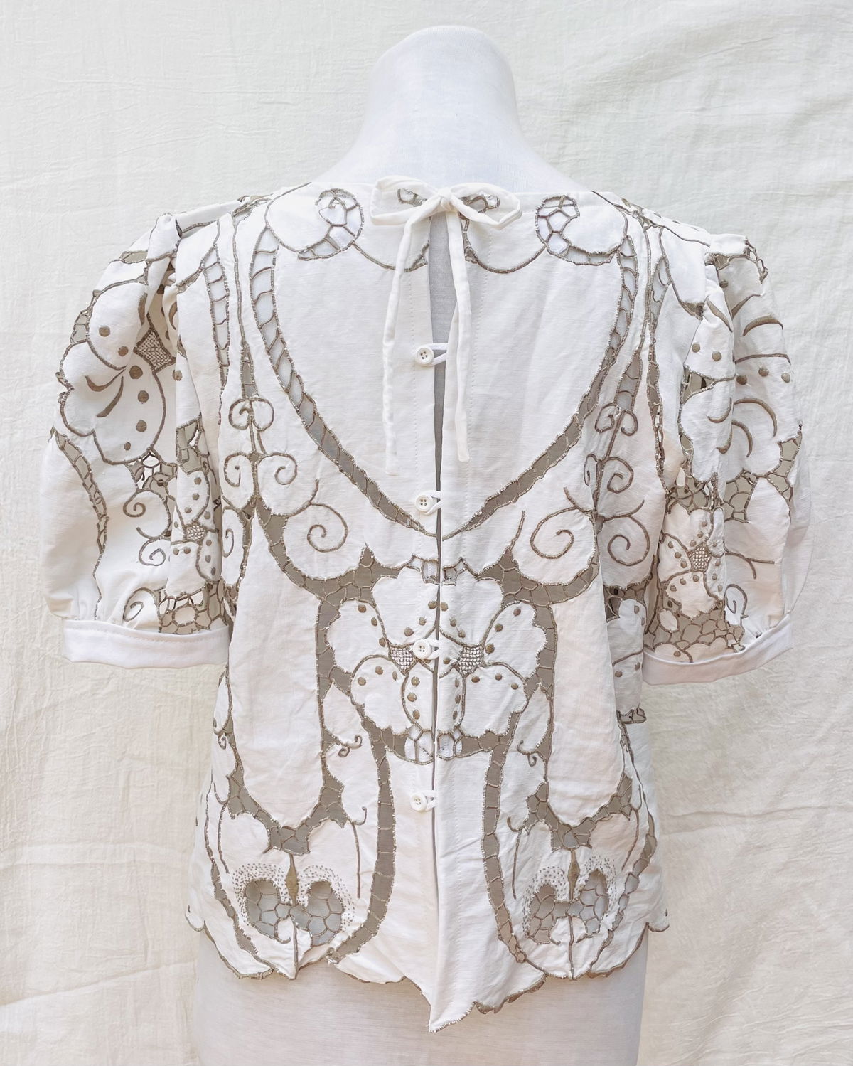 Blusa con mangas abullonadas de género de algodón bordado y calado. Abierta en espalda con botones. Talle M