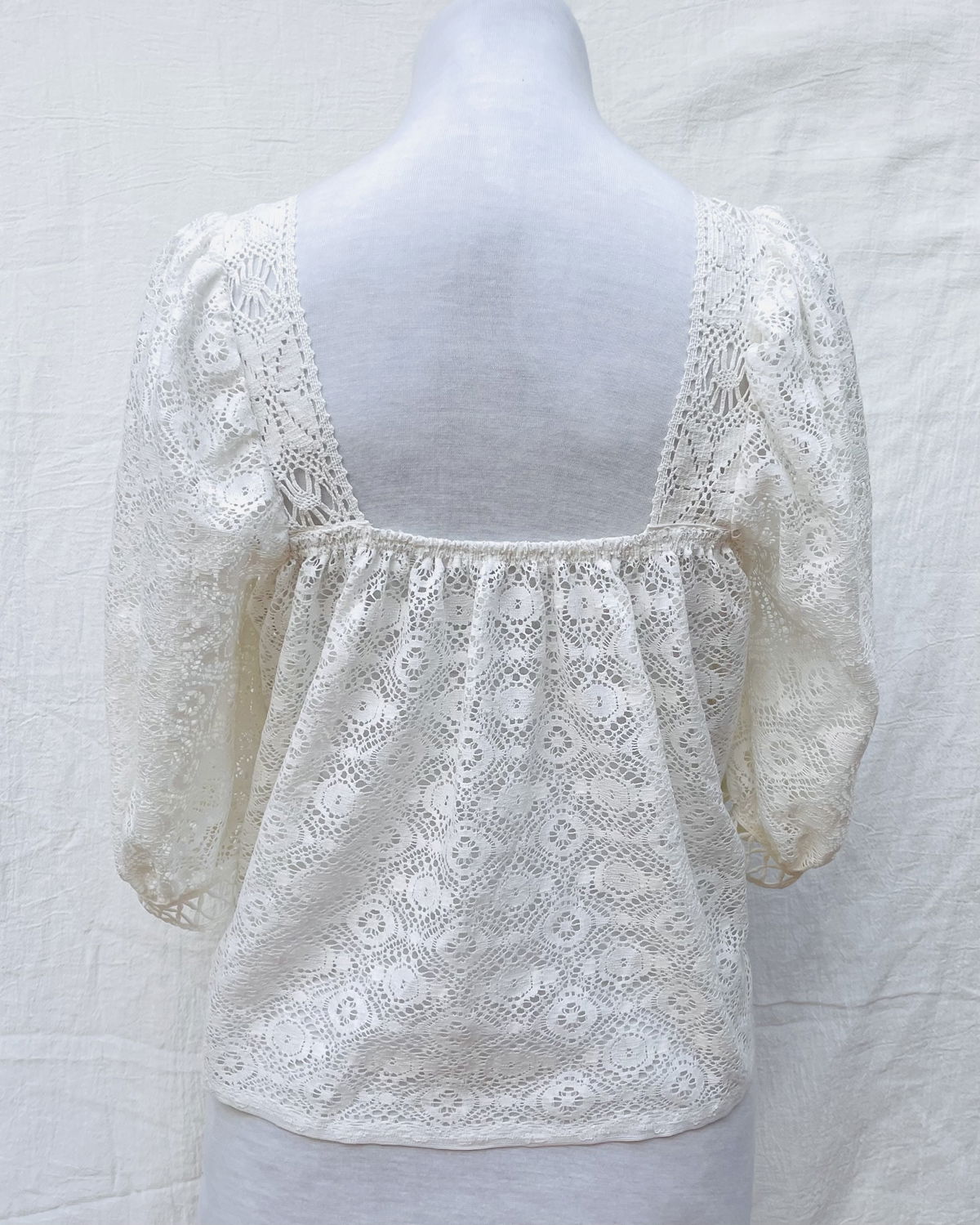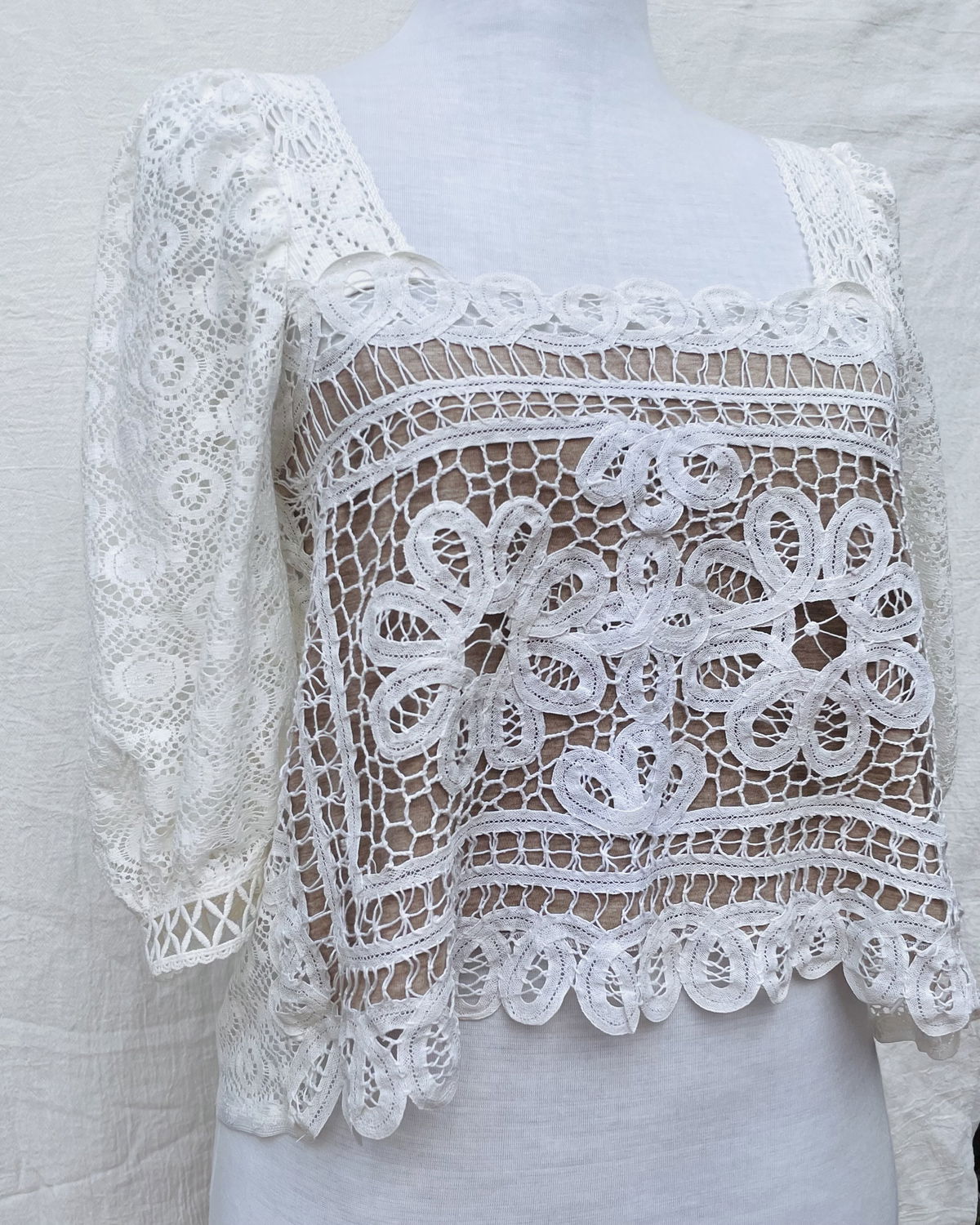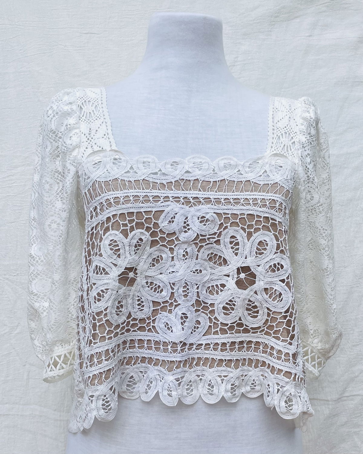 Blusa corta de encaje de algodón, con aplique vintage calado en el delantero (forrado en color nude) y puntillas. Mangas 3/4 abullonadas. Talle S