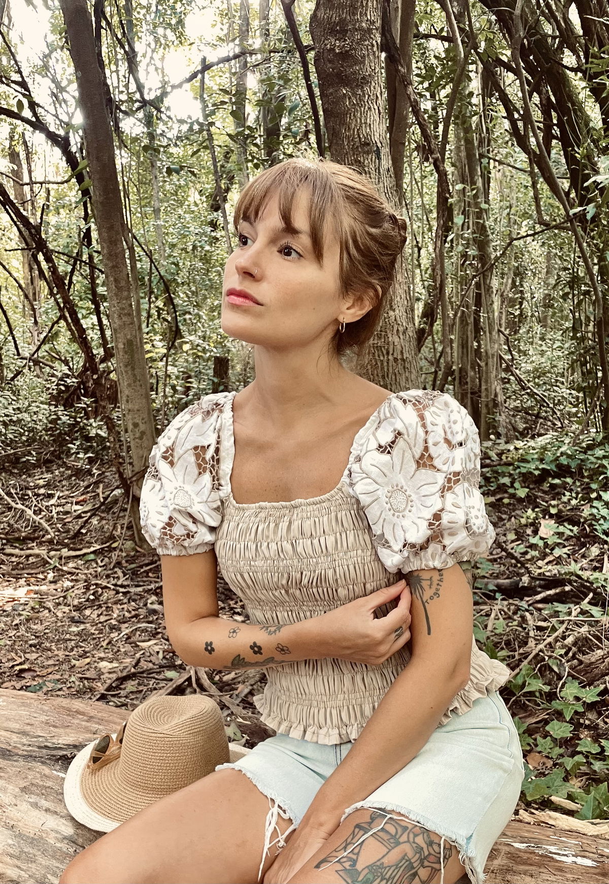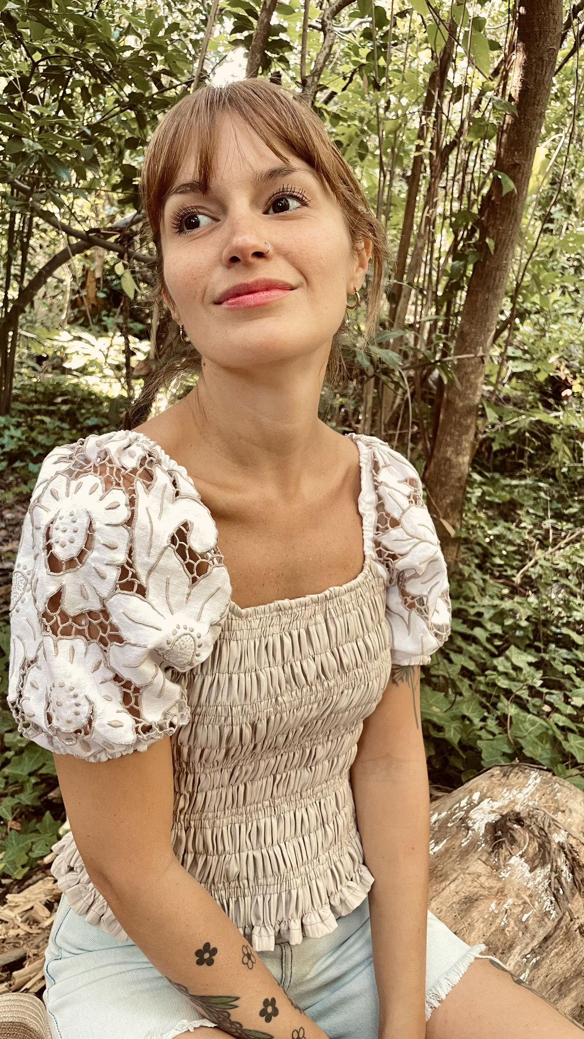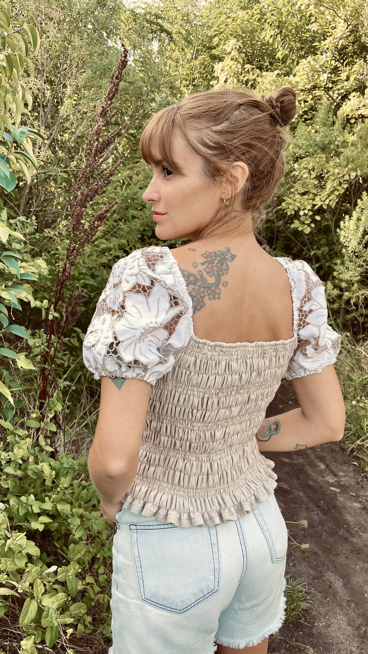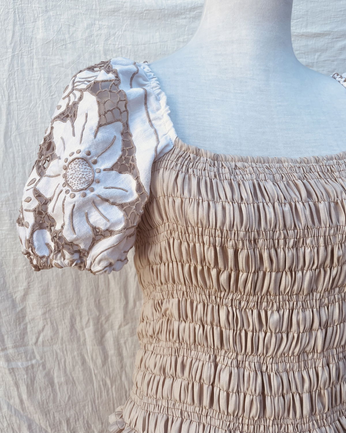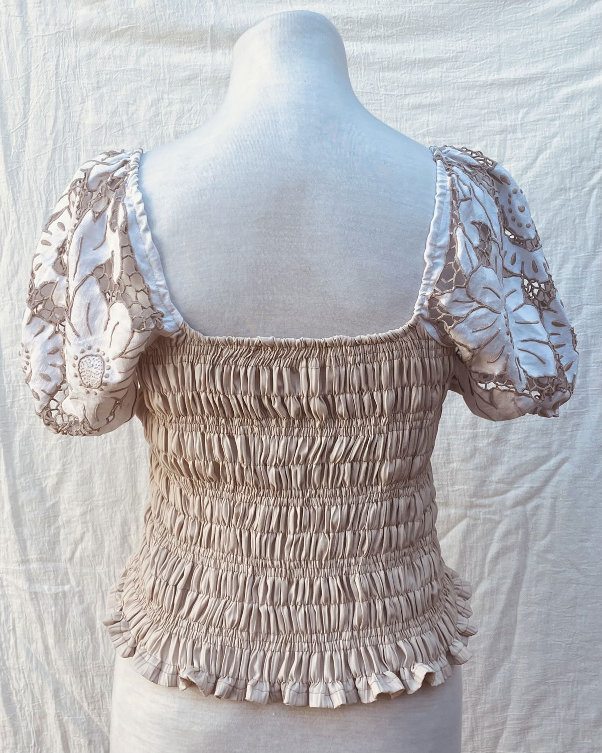 Blusa de algodón fruncido con mangas abullonadas de género bordado y calado.