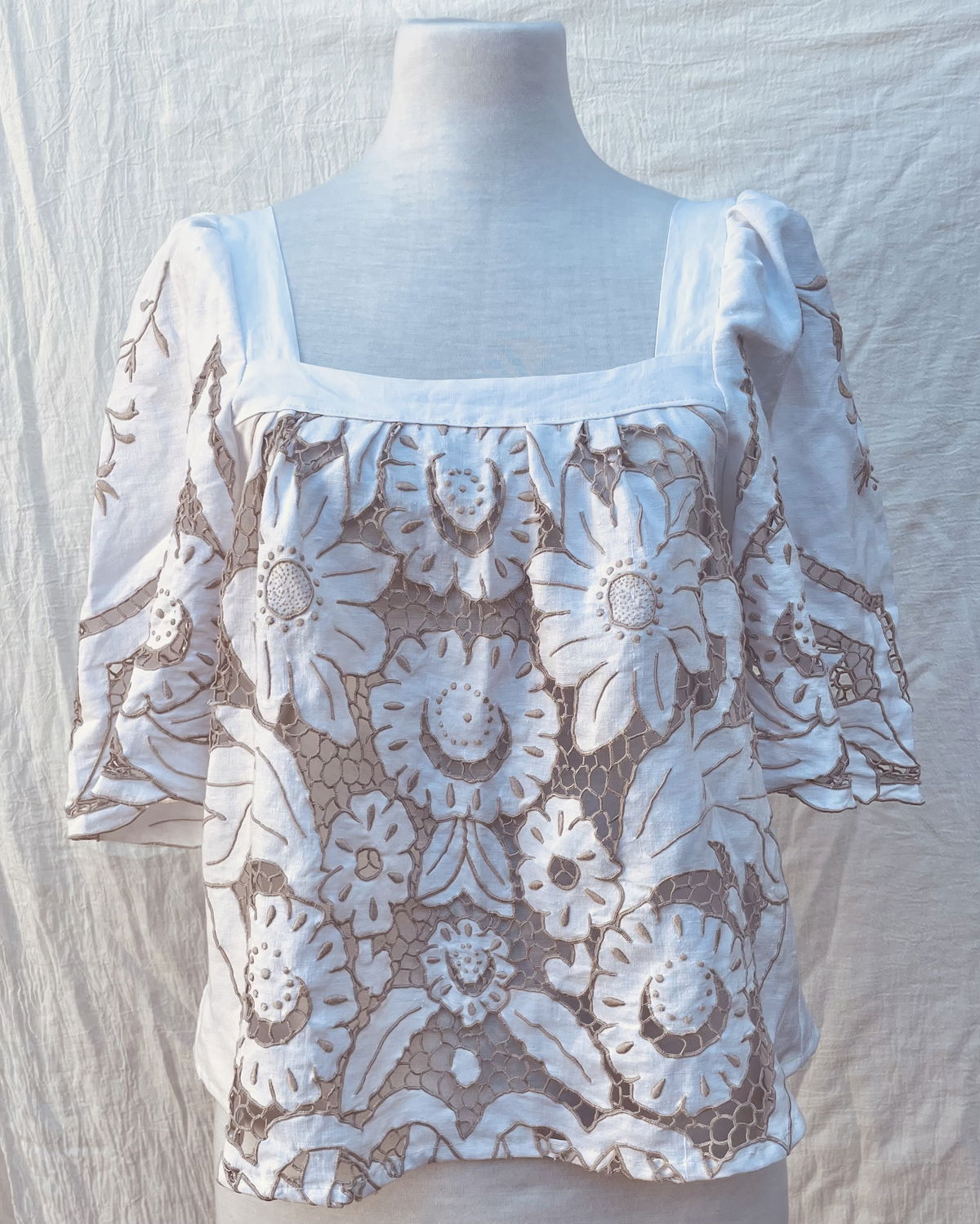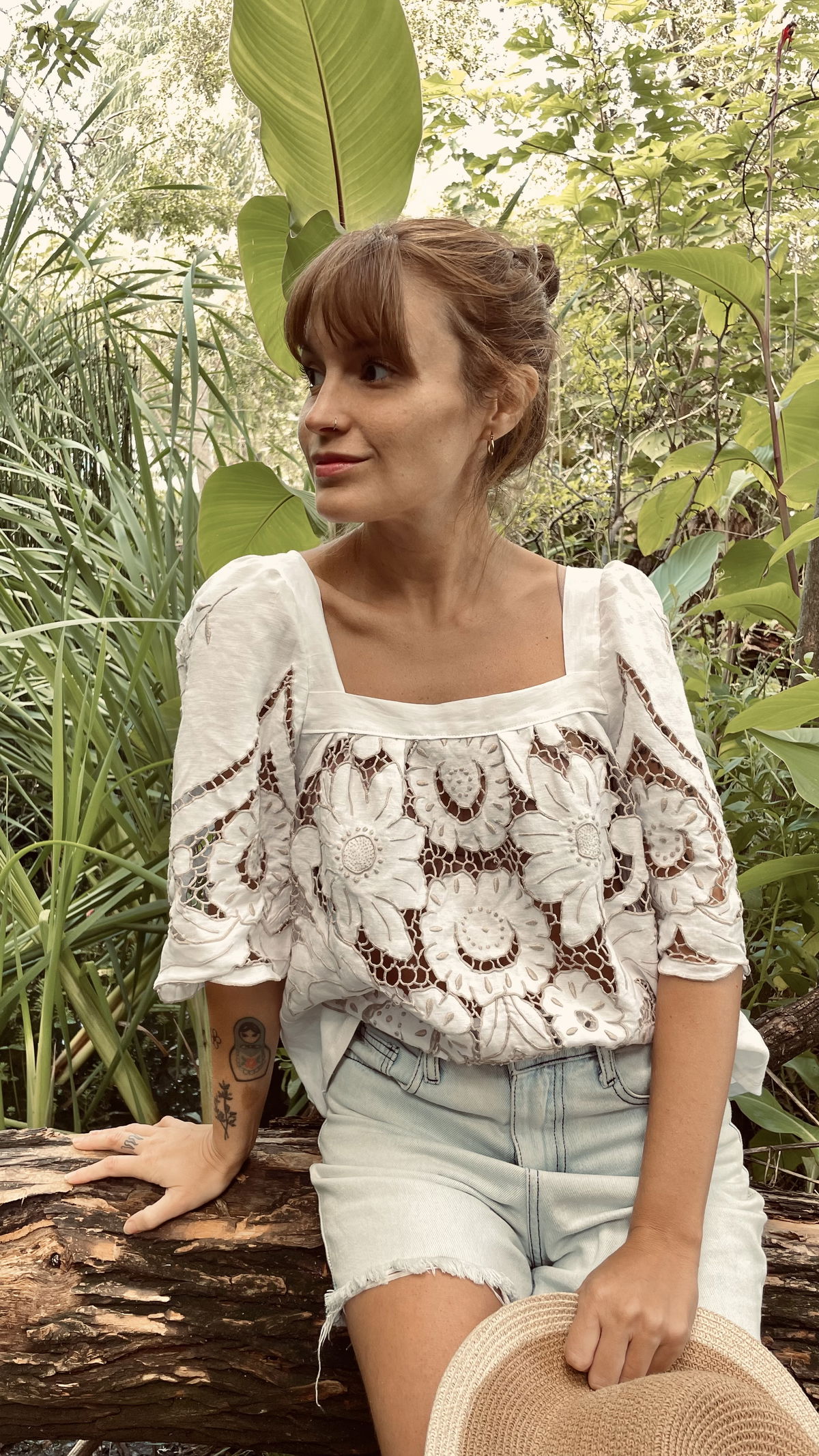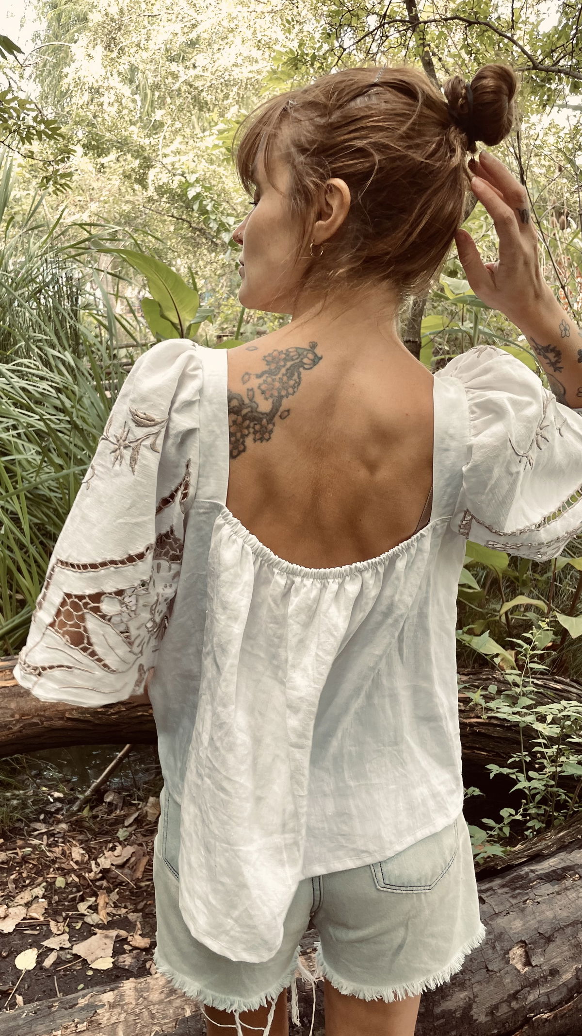 Blusa amplia de algodón con bordado Richelieu y calados. Mangas amplias
