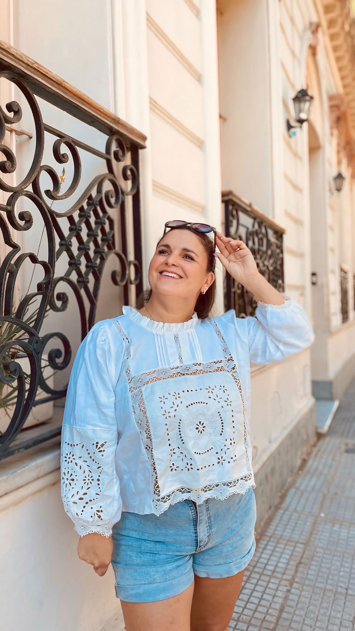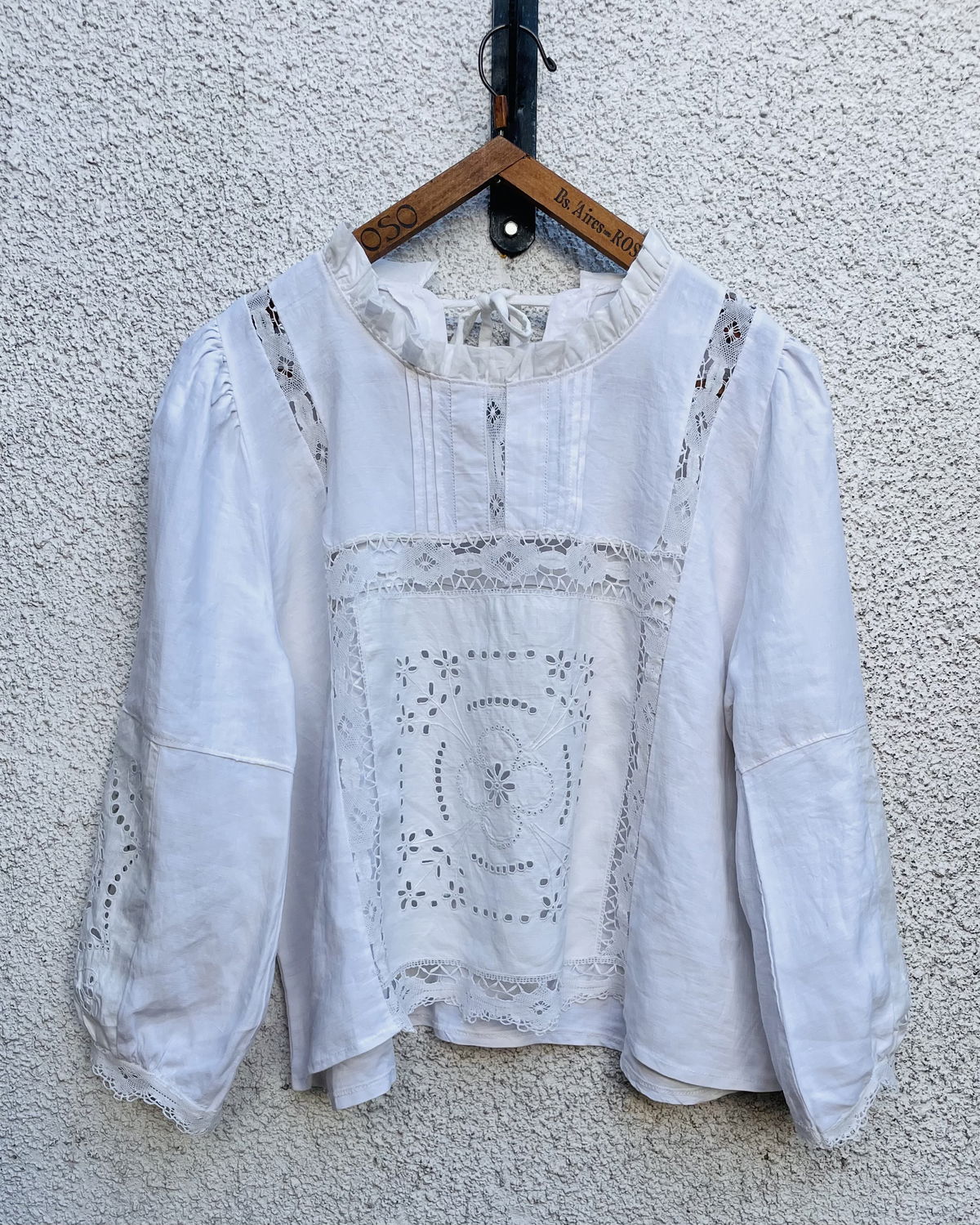 Blusa con recortes de algodón bordado y calado y puntillas. Mangas amplias y volado en cuello