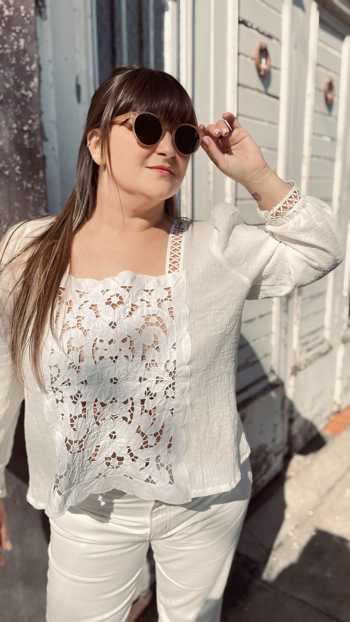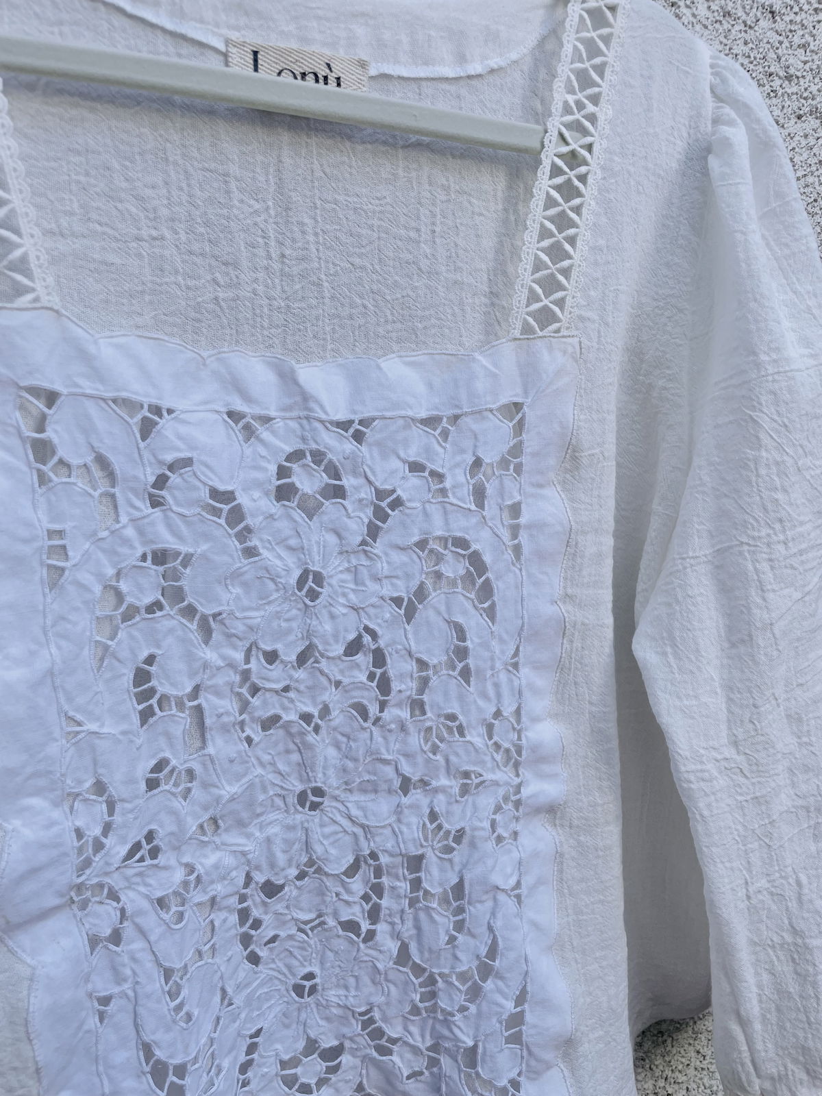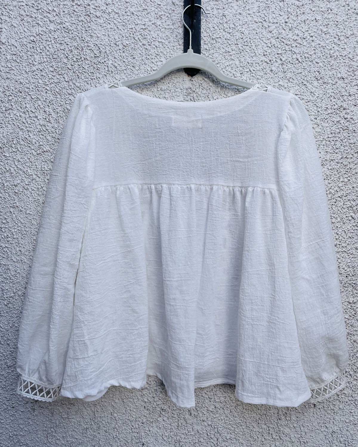 Blusa de gasa de algodón con aplique bordado y calado en delantero