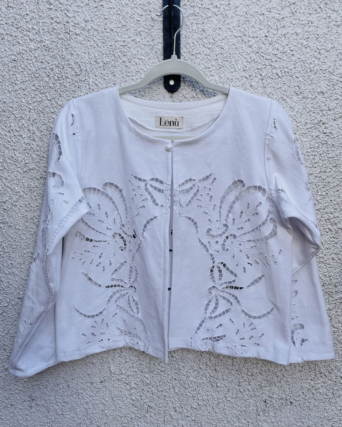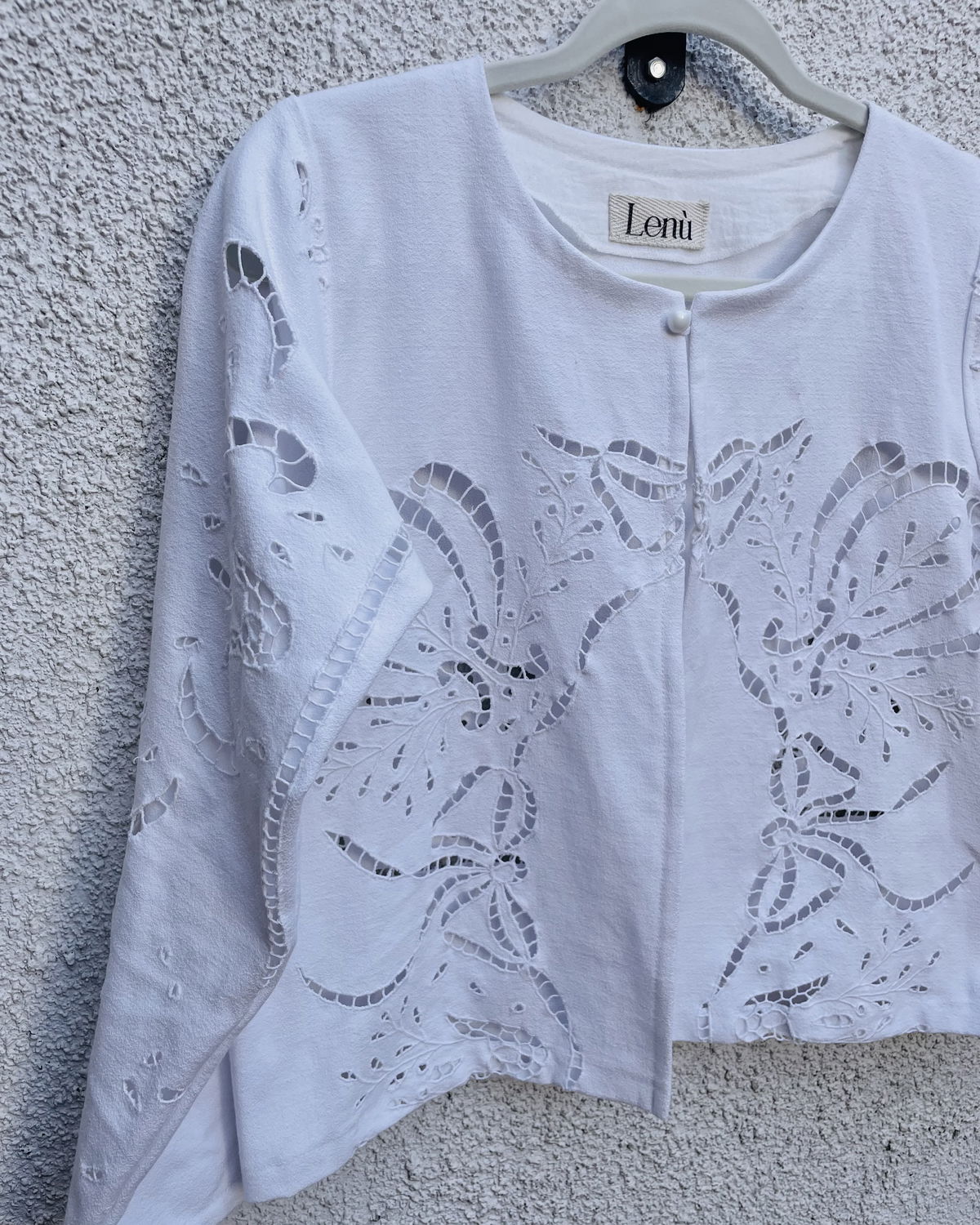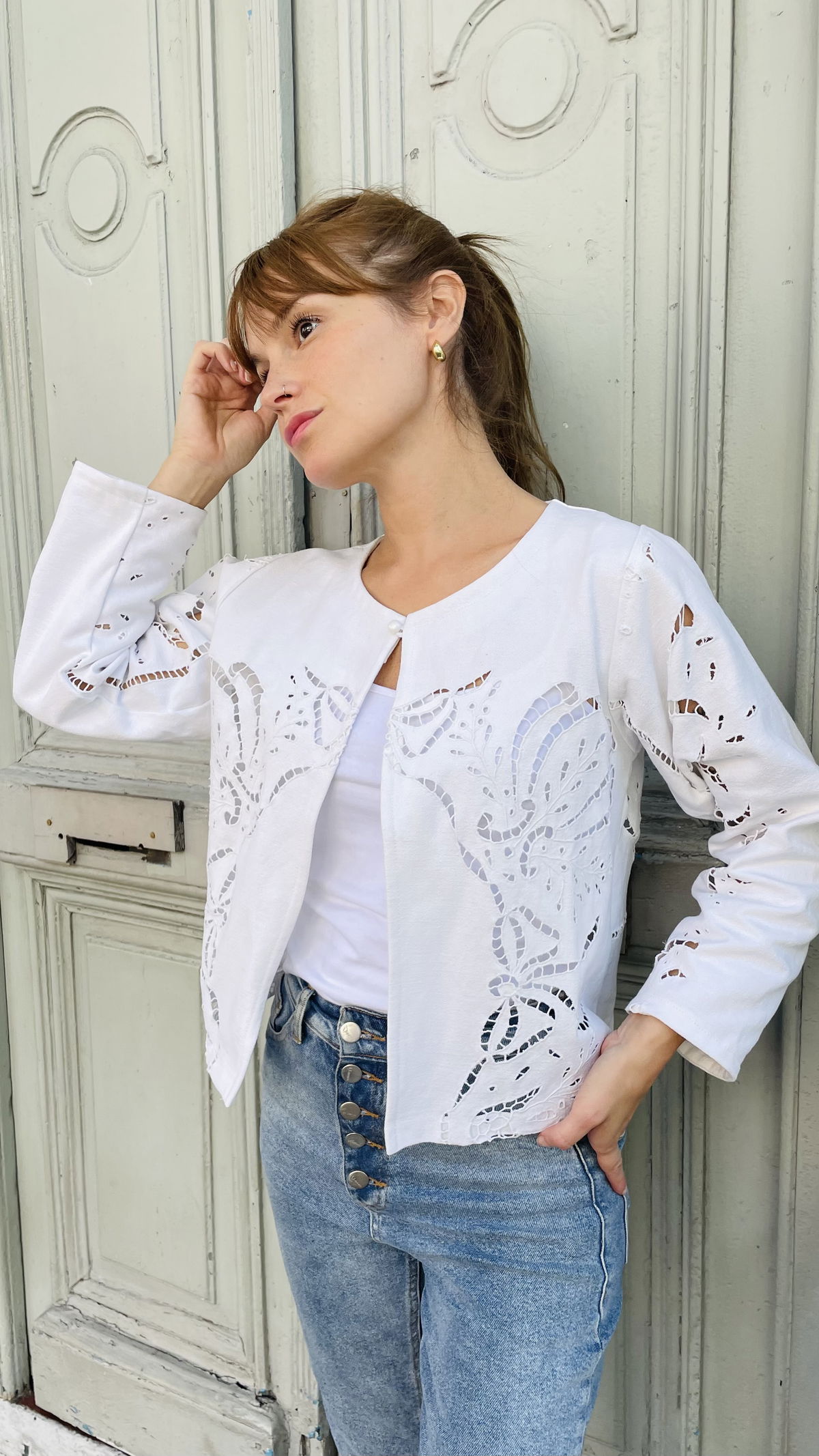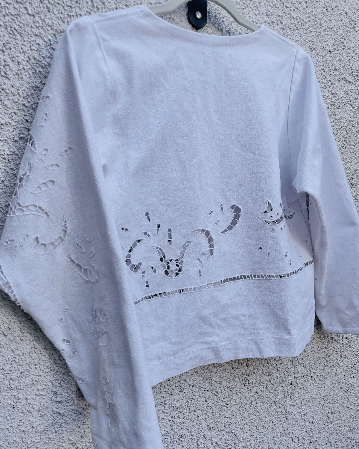Camperita de granité con bordado richelieu y calados. El granité es una tela con cuerpo símil gabardina o Jean.
