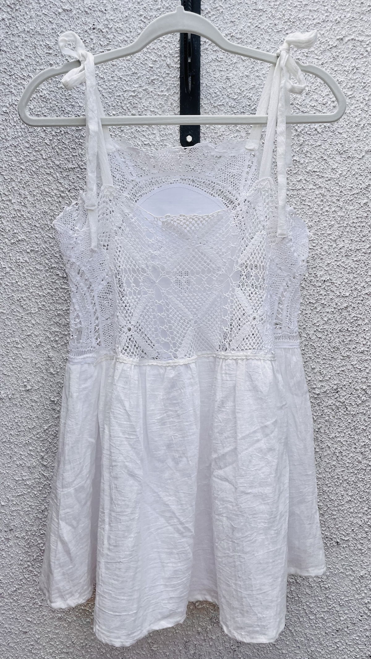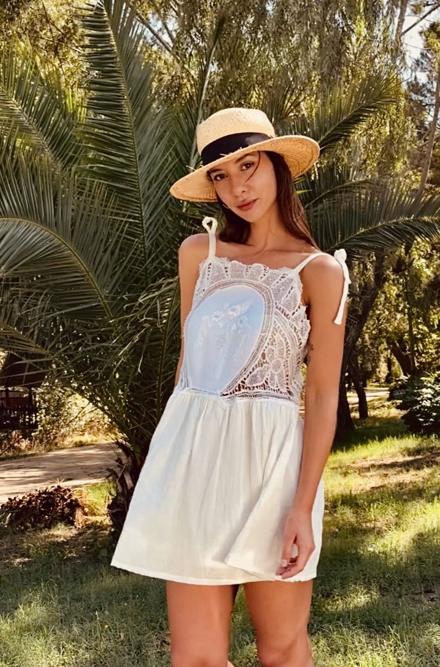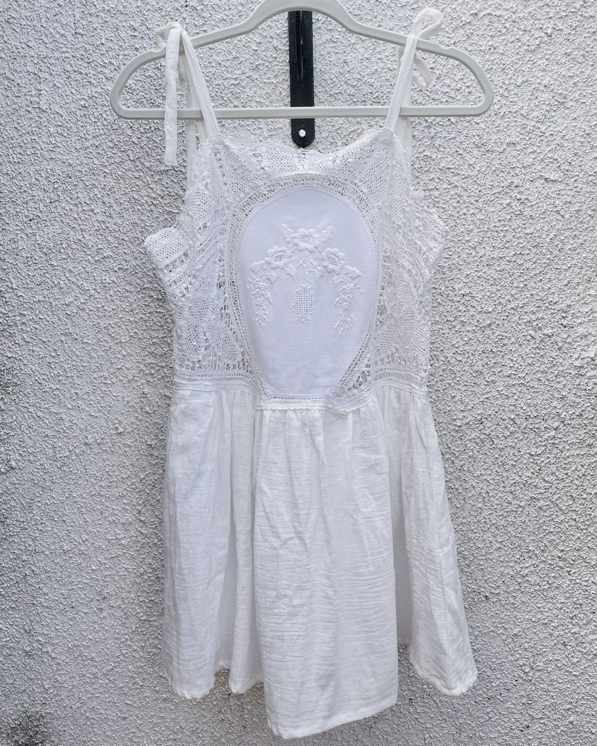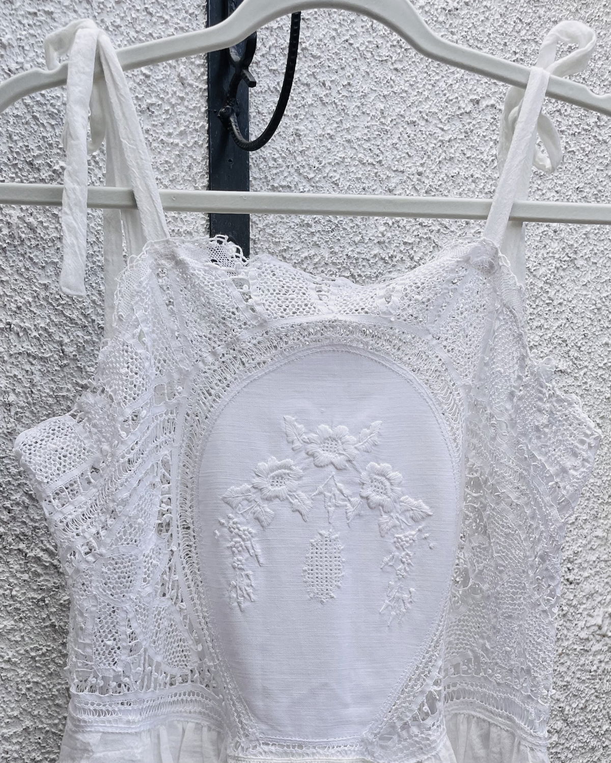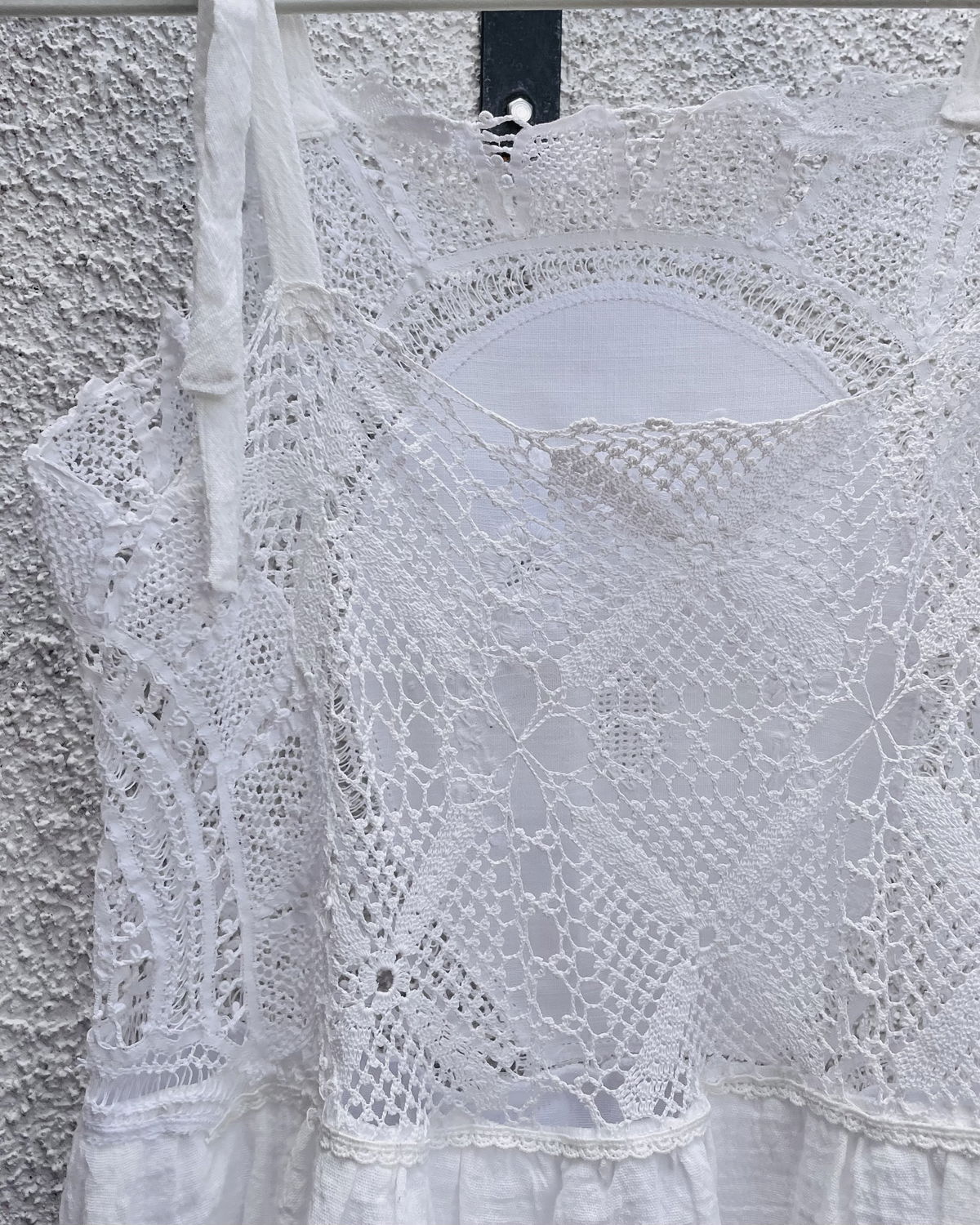 Vestido con canesú bordado, puntillas y espalda de crochet. La falda es de gasa de algodón y tiene forreria. Tiras regulables para elegir el largo deseado.