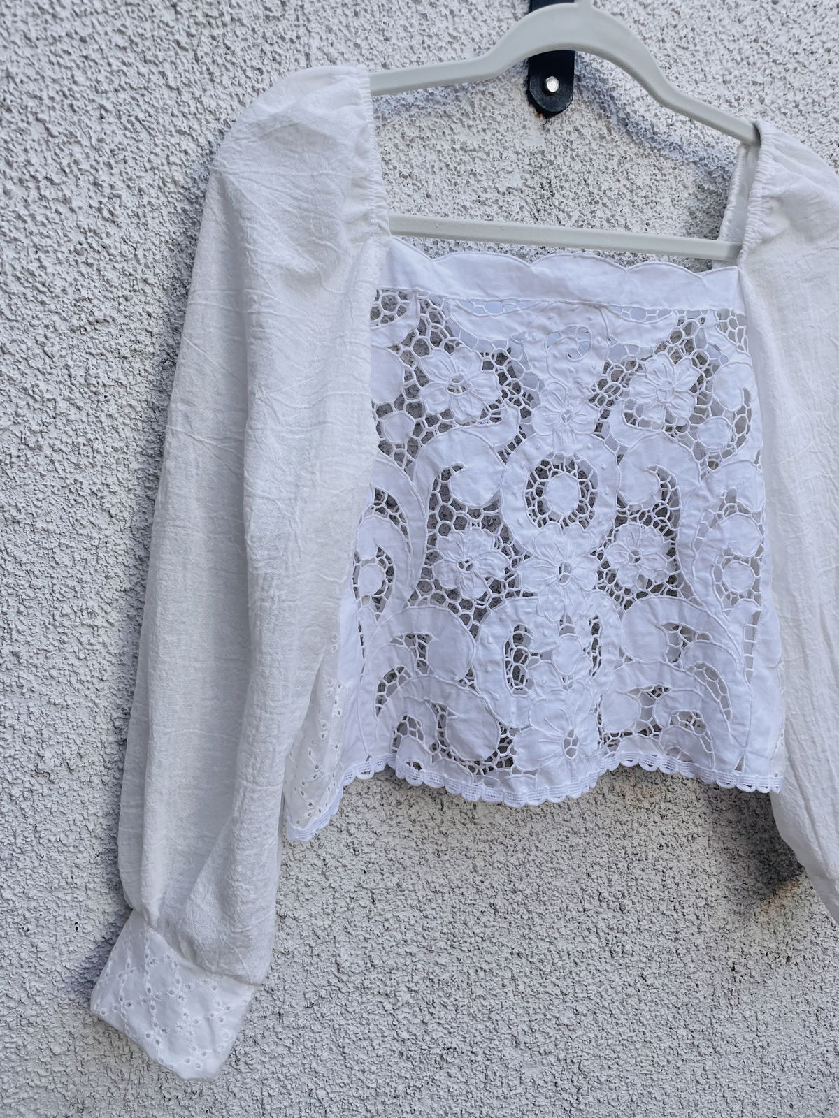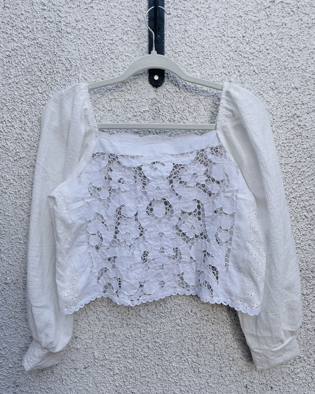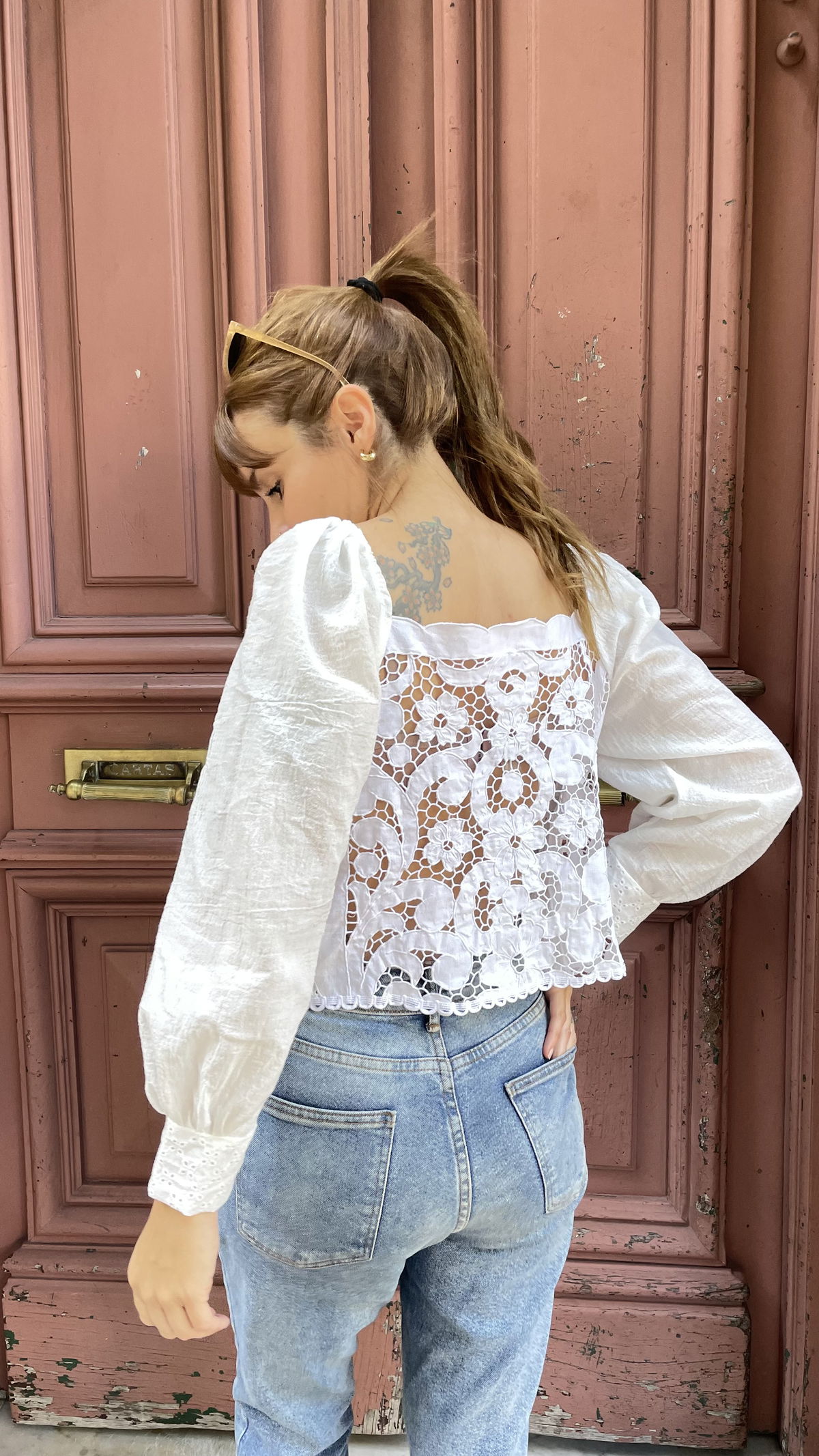 Blusa de broderie y gasa de algodón con aplique bordado y calado en delantero y en espalda.