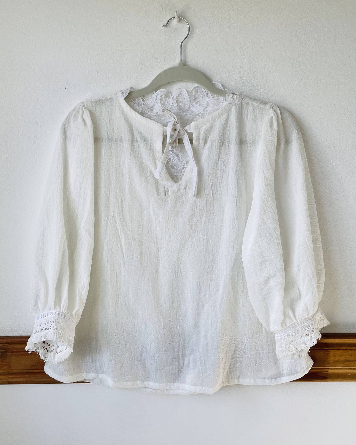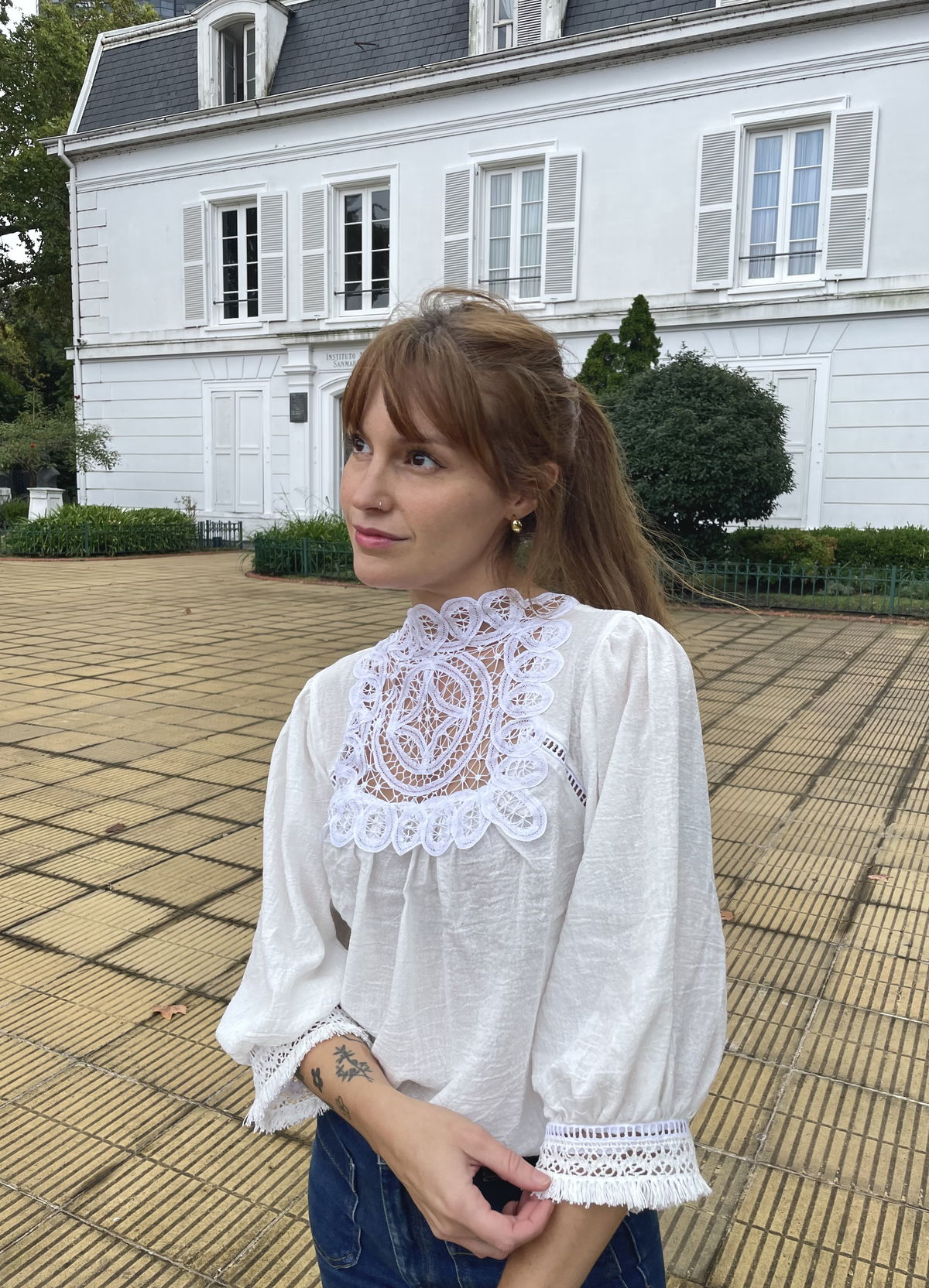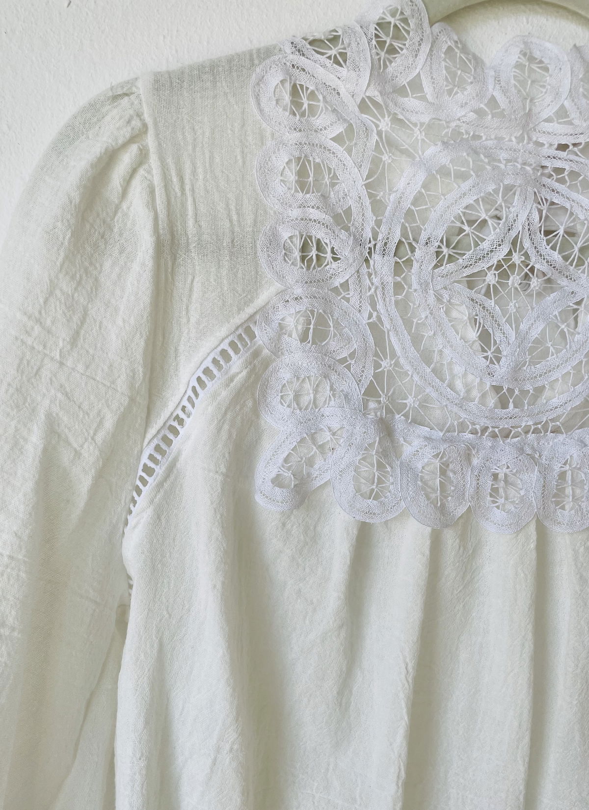 Blusa de gasa de algodón con detalle en canesú de encaje de algodón y vainillas