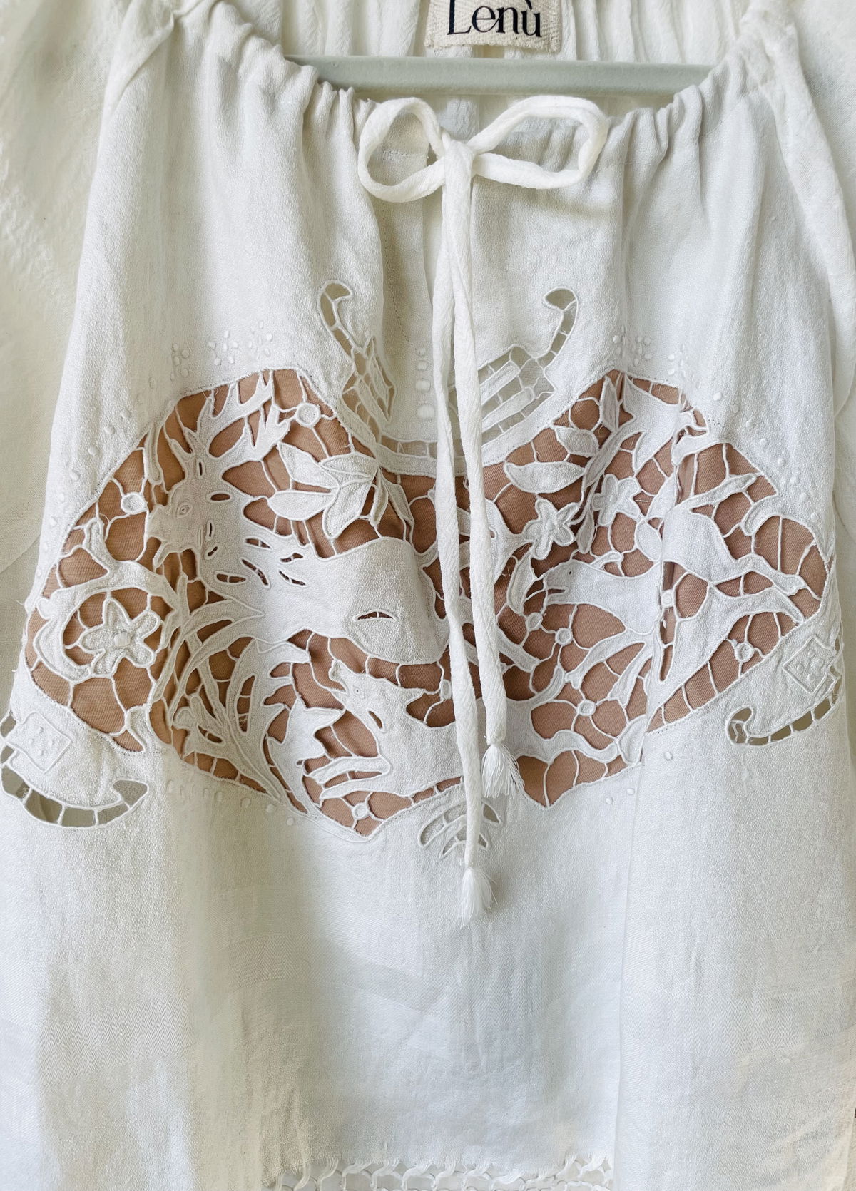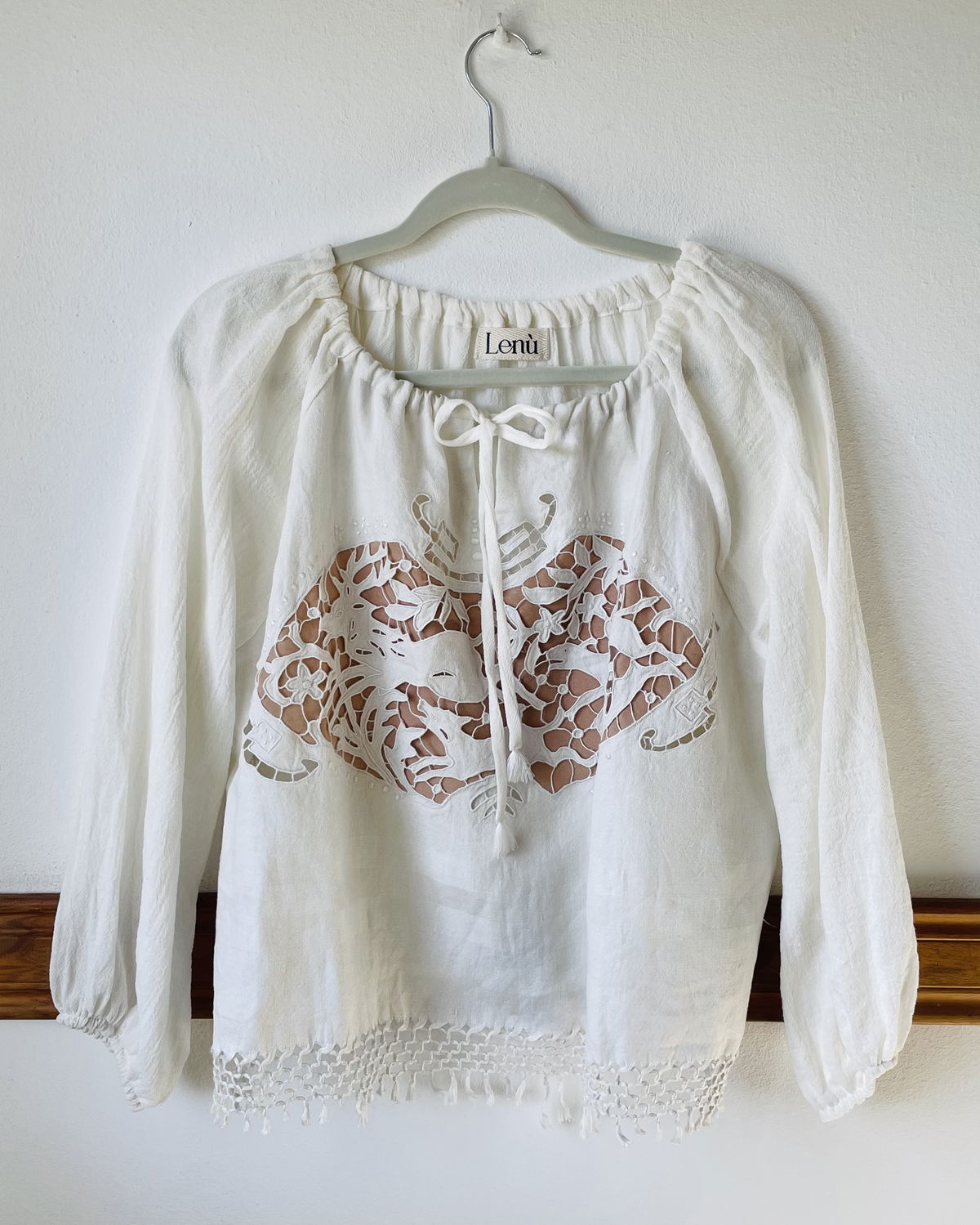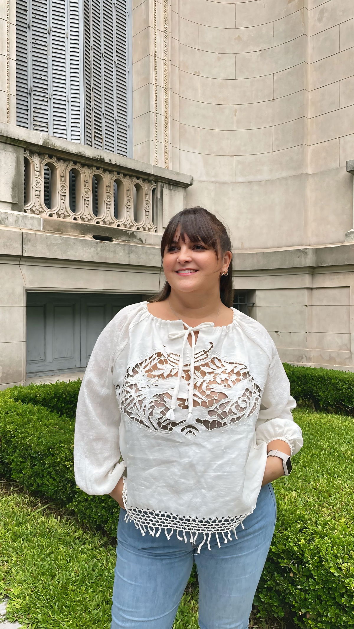 Blusa de gasa de algodón y delantero de granité (tela de algodón con cuerpo estilo gabardina o Jean) con bordado richelieu, calados y flecos. Tiene forro color nude (el cual fue agregado luego de hacer las fotos con la modelo, guiarse por las fotos del producto en percha)