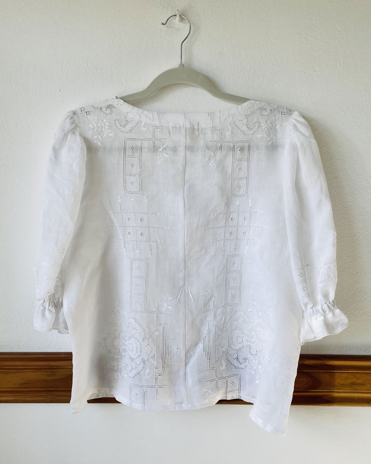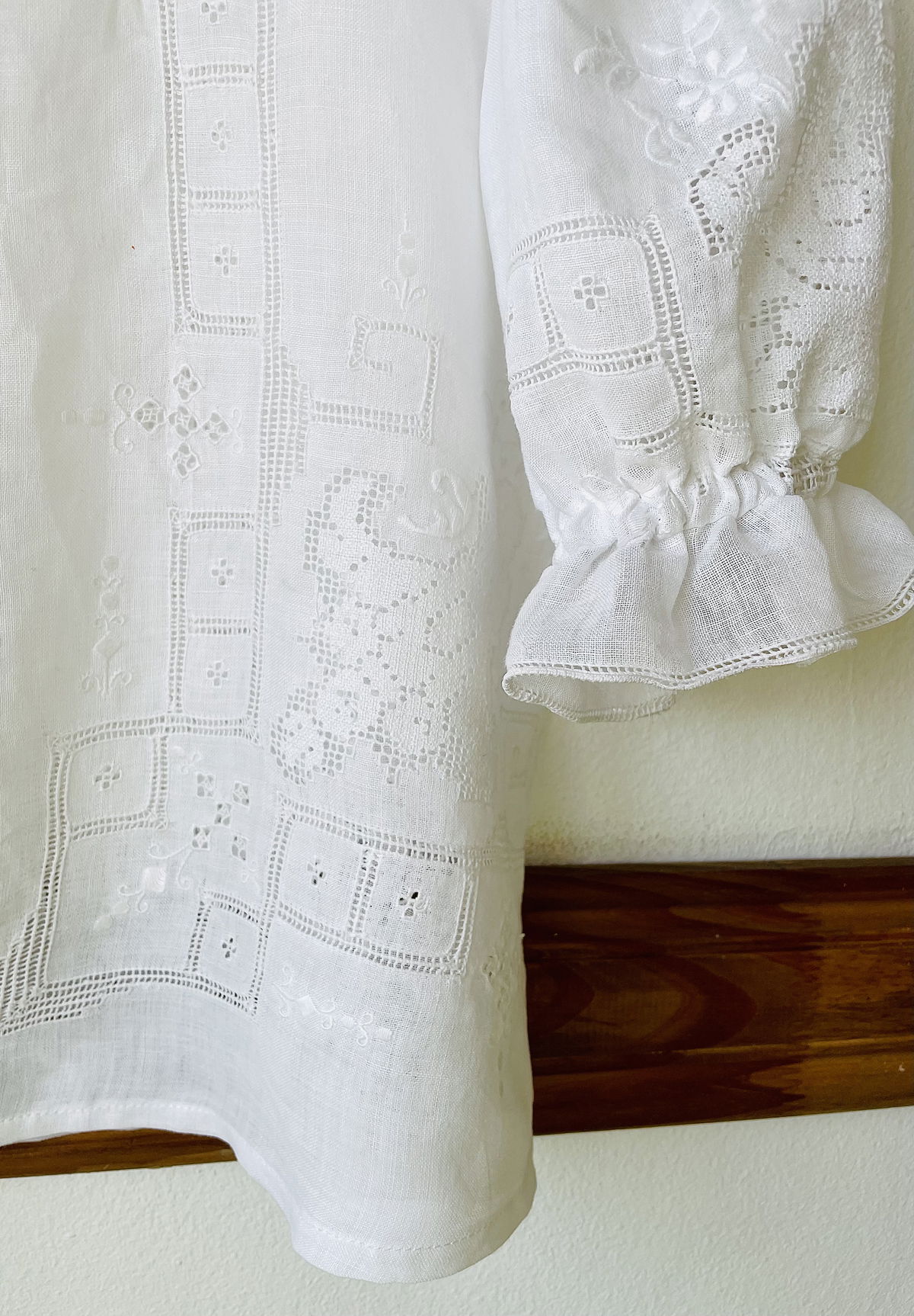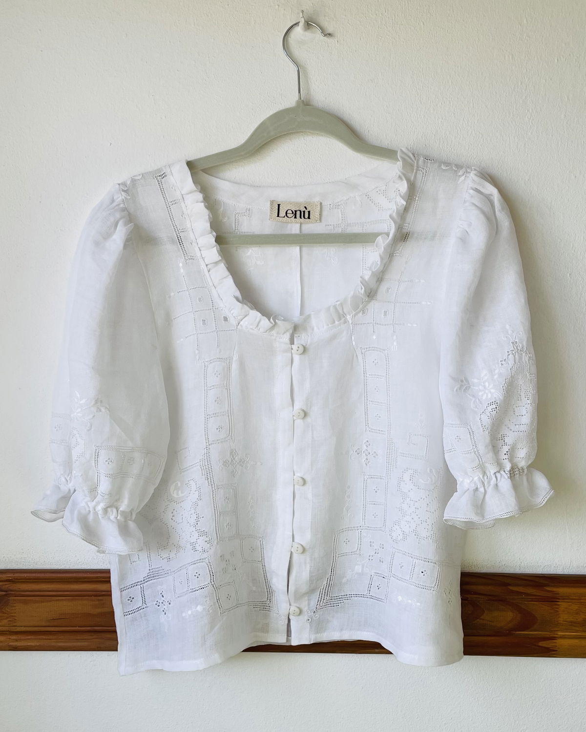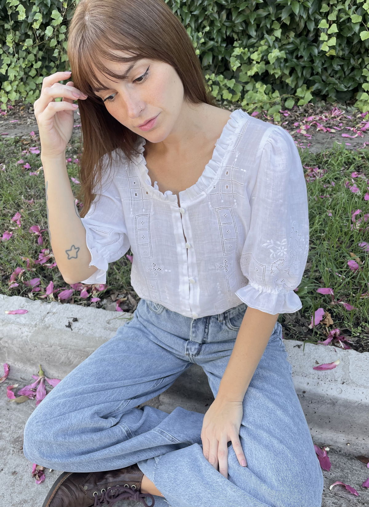 Camisa de algodón liviano bordado y calado con volados en cuello
