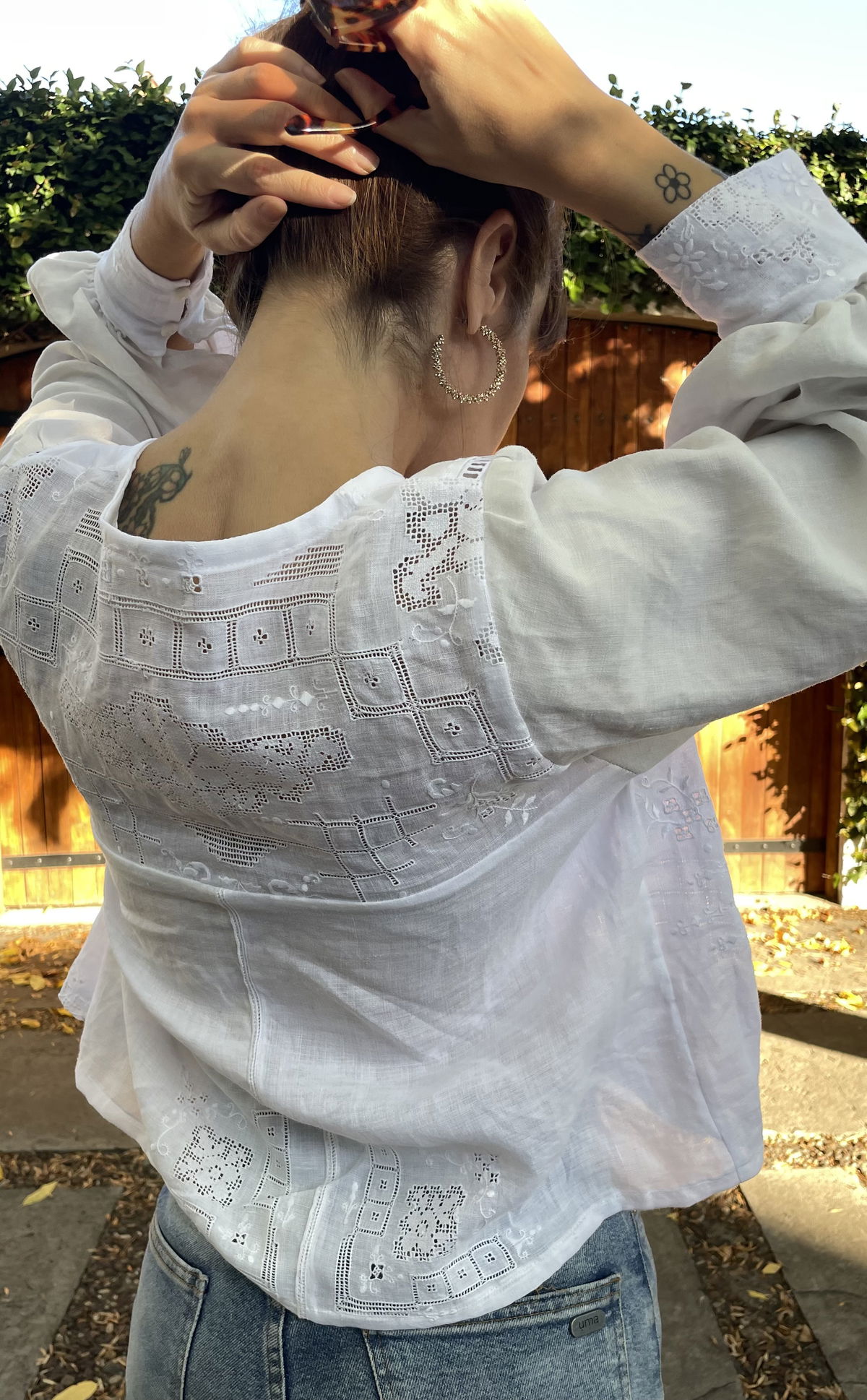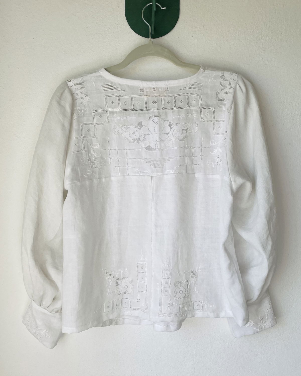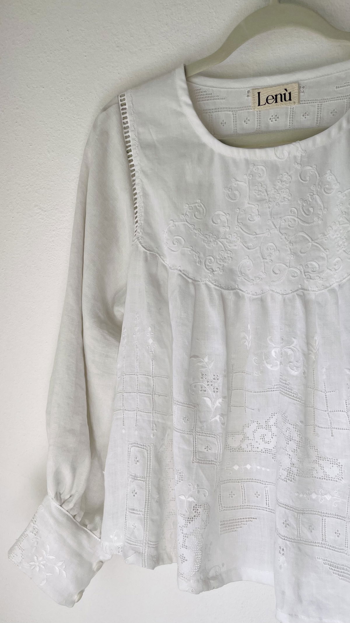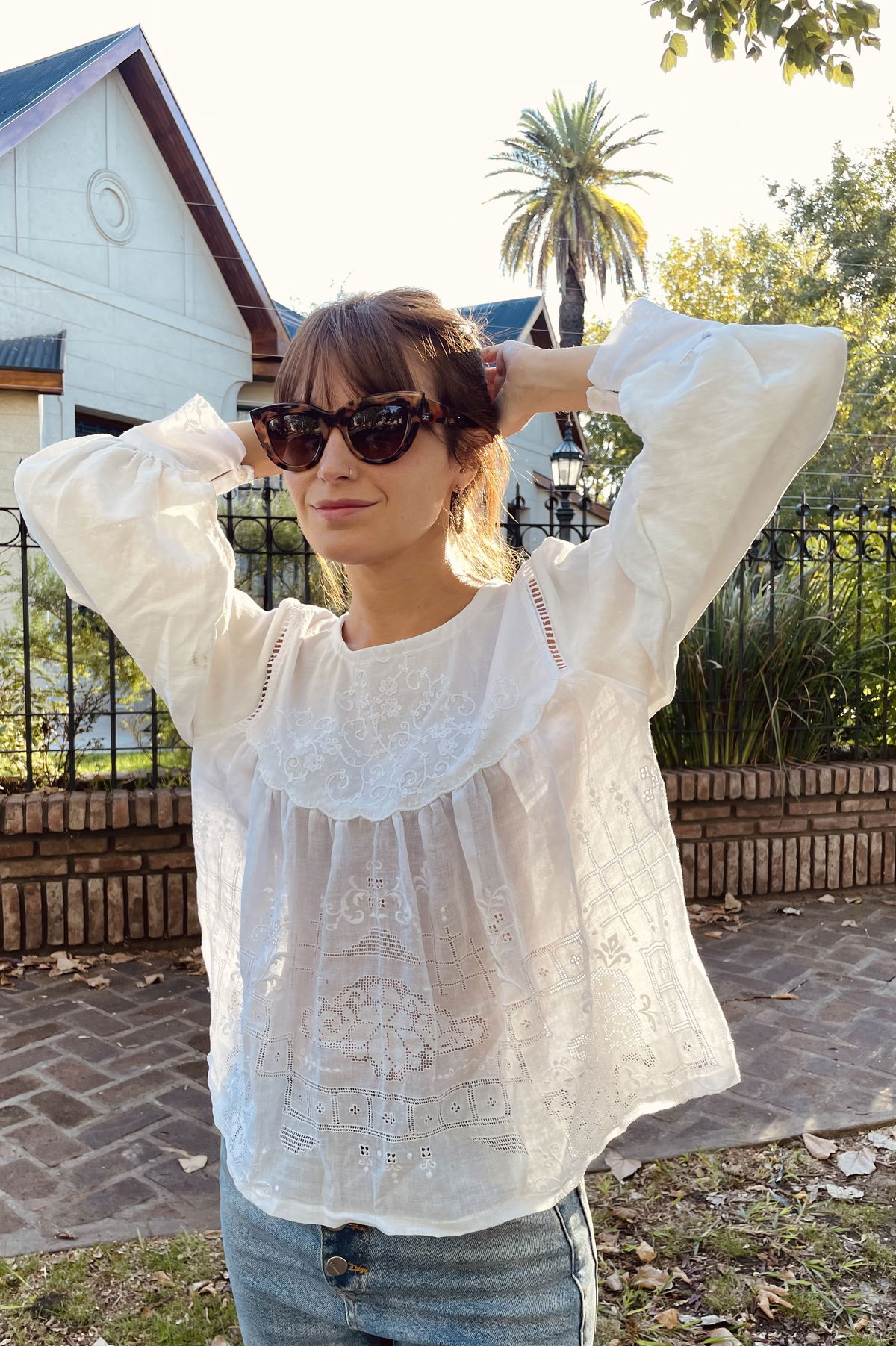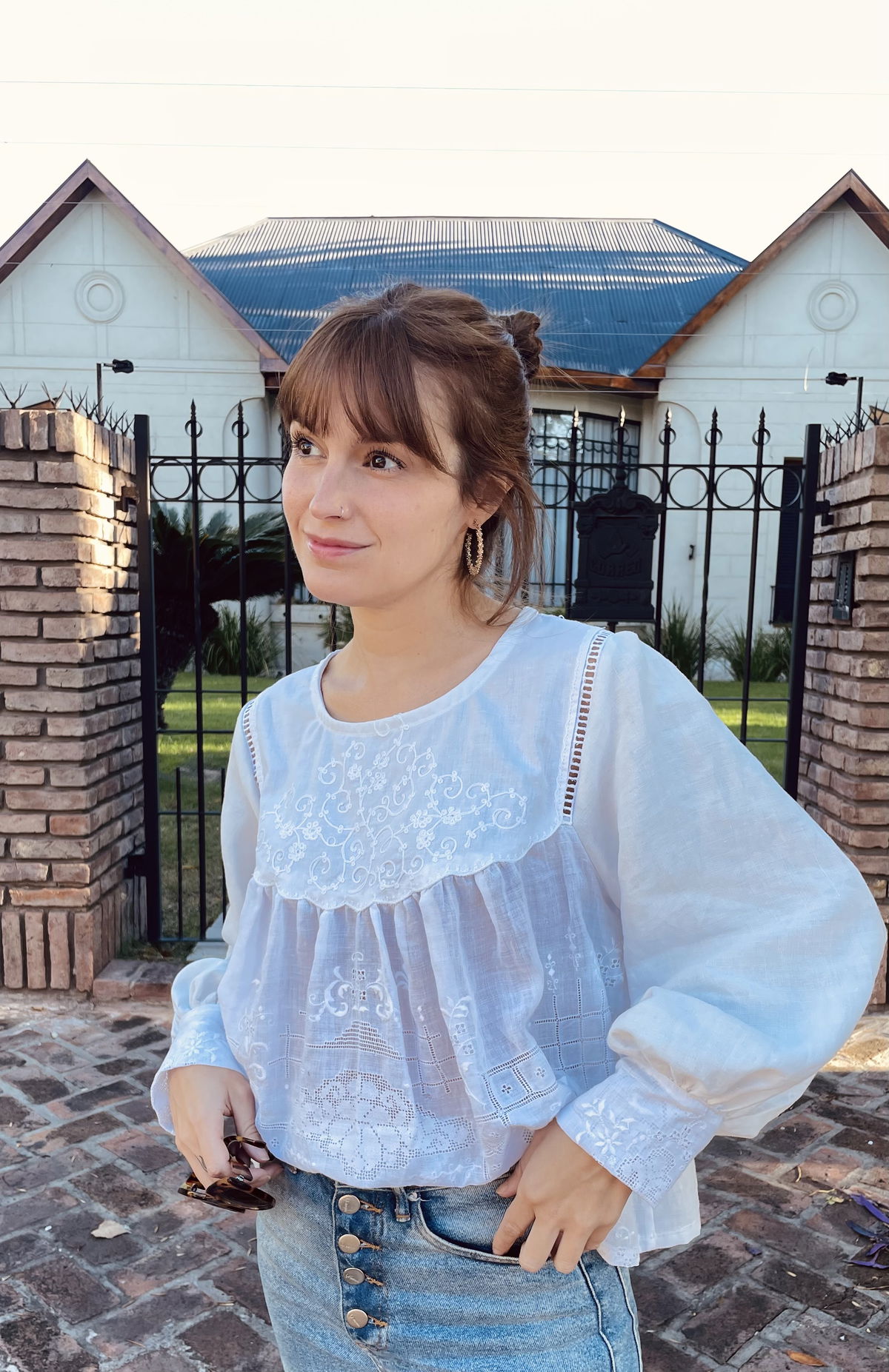 Blusa de algodón liviano bordado y calado. Canesú bordado con punto beauvais y vainillas