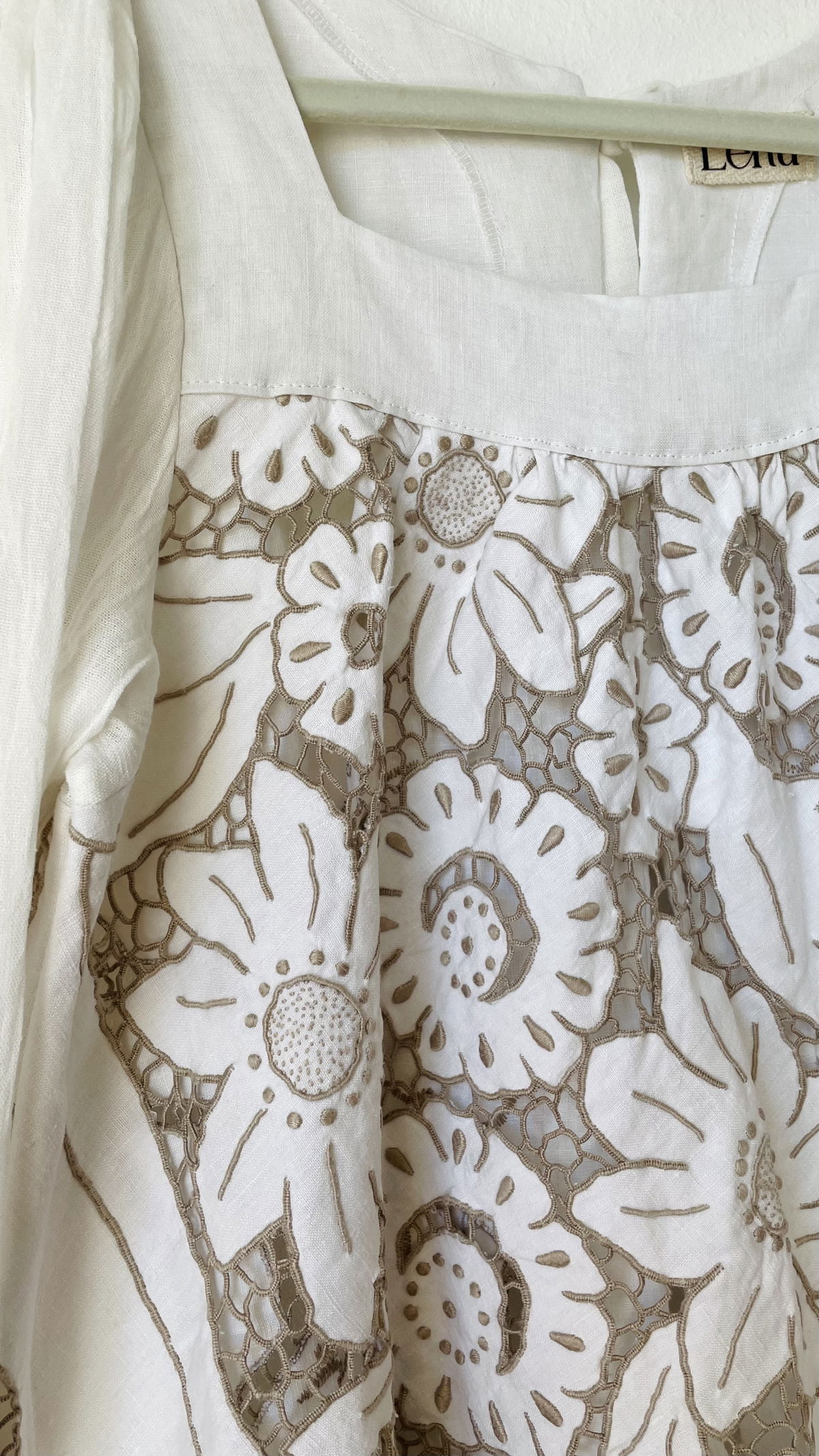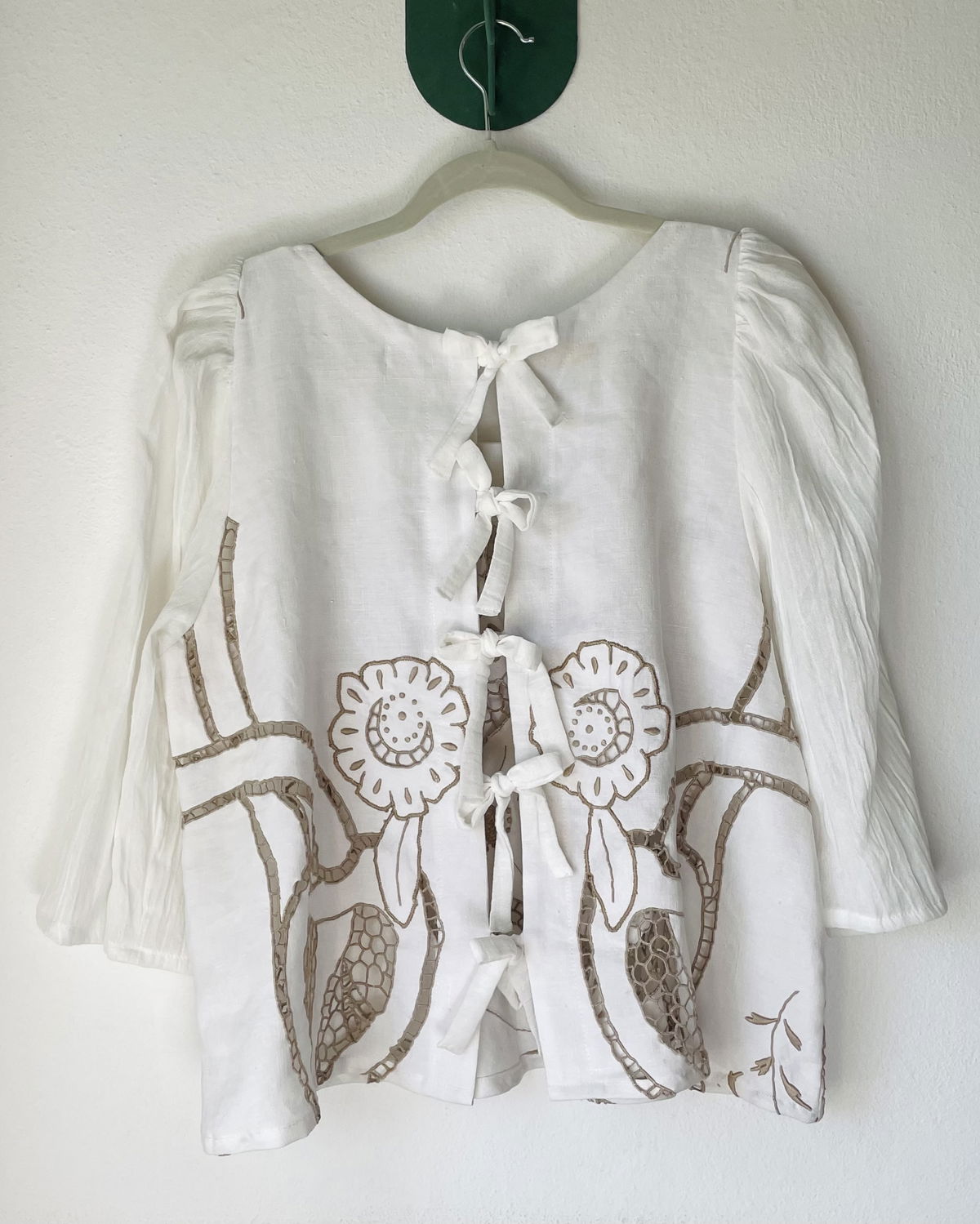 Blusa de algodón con bordado español y calados. Abierta en espalda con tiras para cerrar. Mangas de gasa de algodón