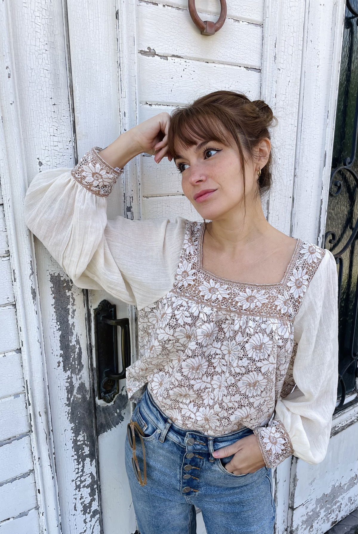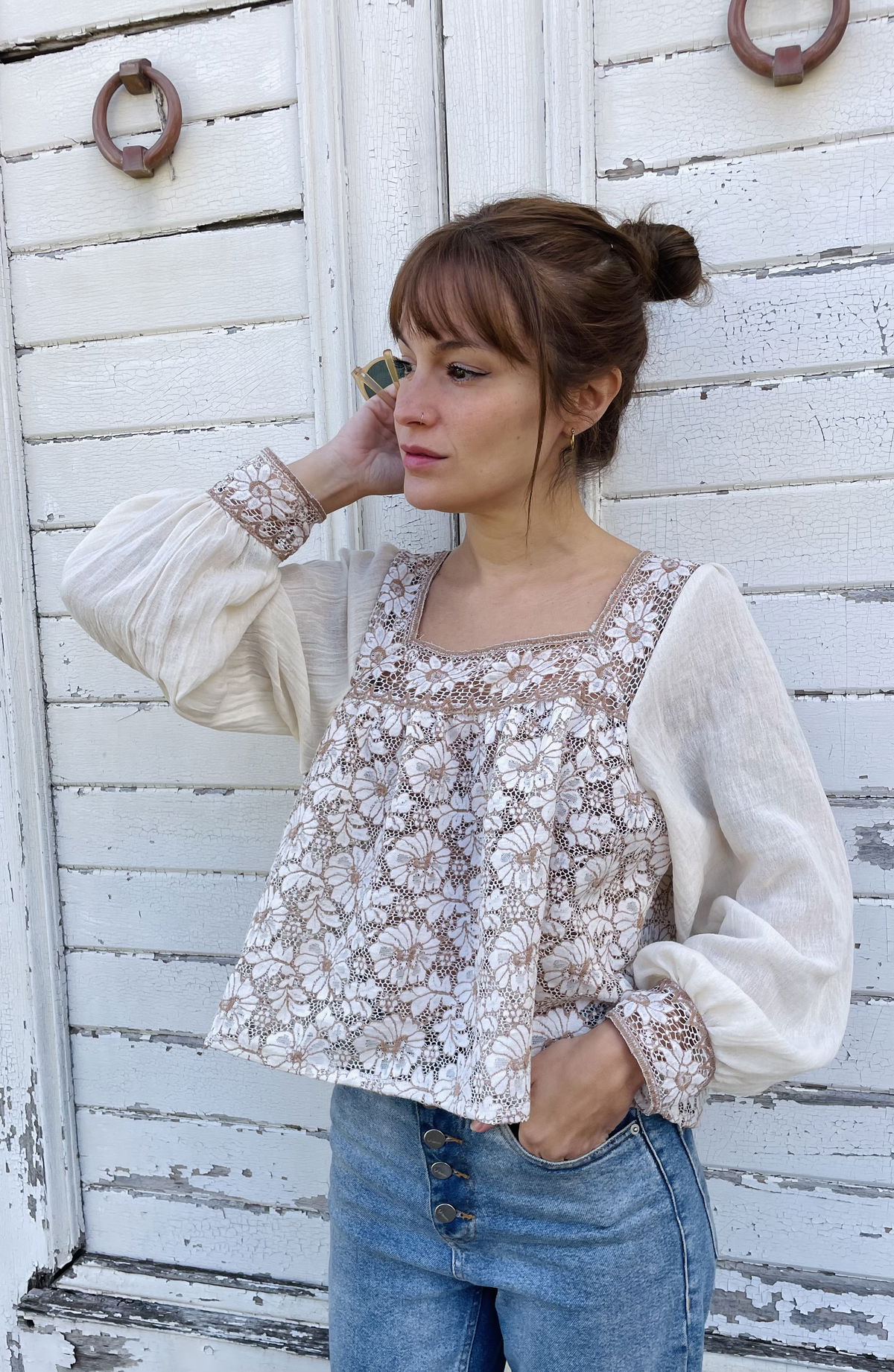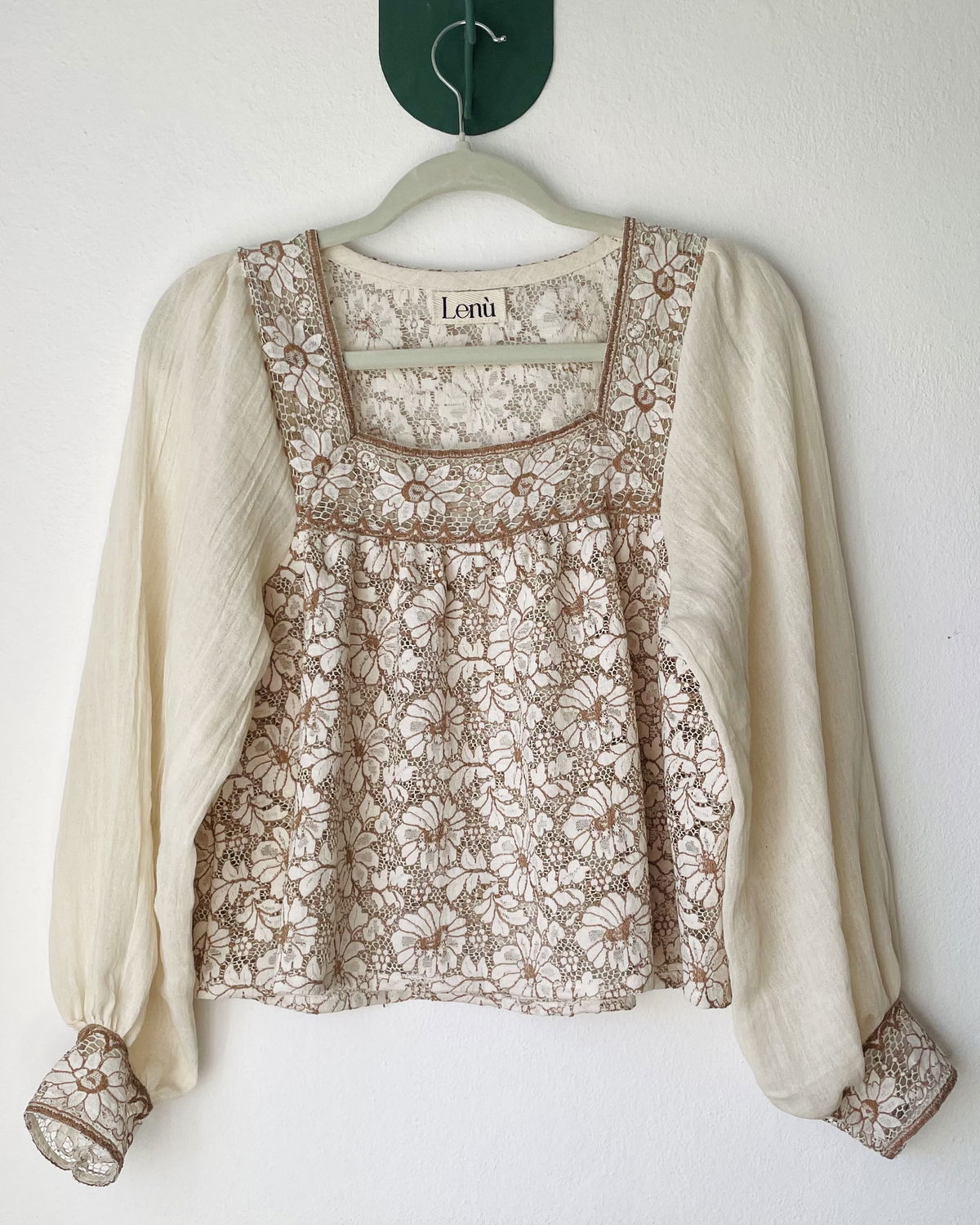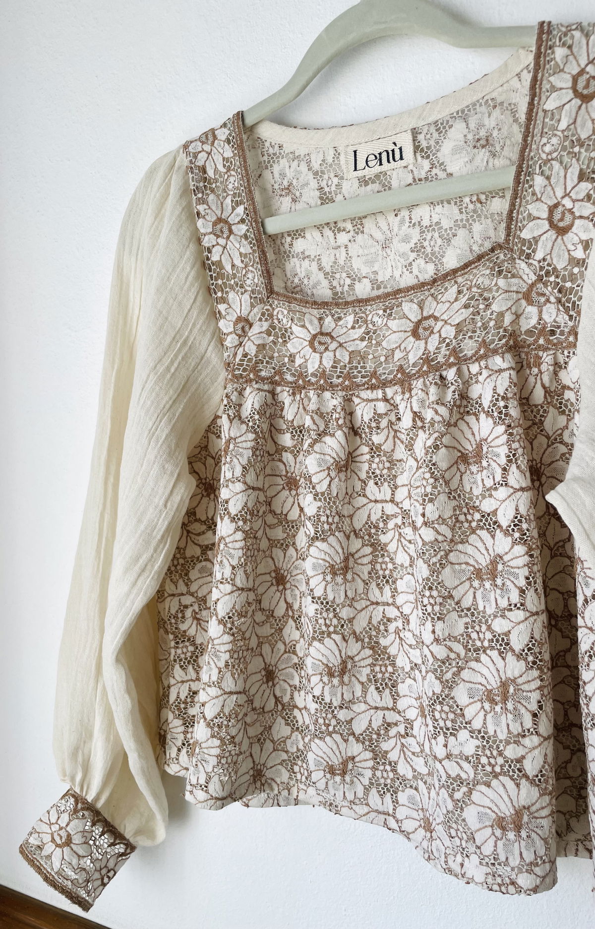 Blusa de fibra de coco, con detalles en canesú y puños. Mangas en gasa de algodón