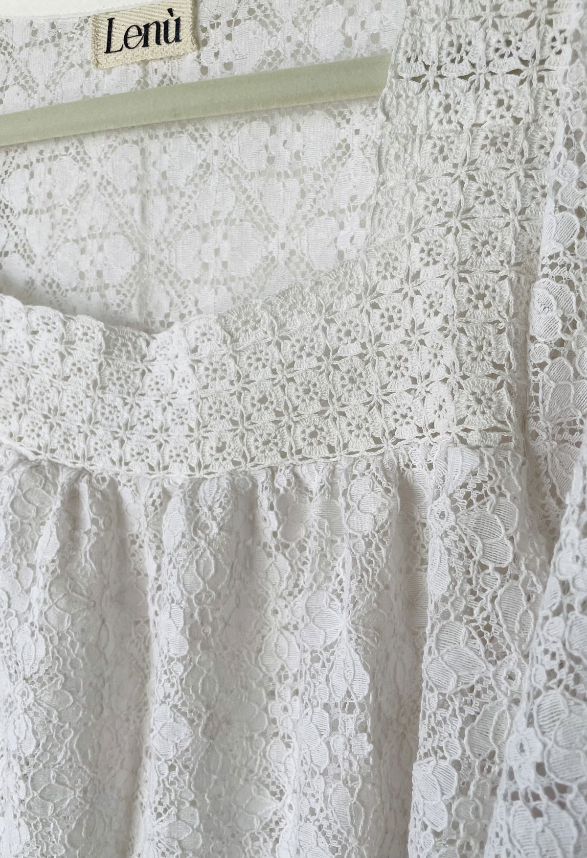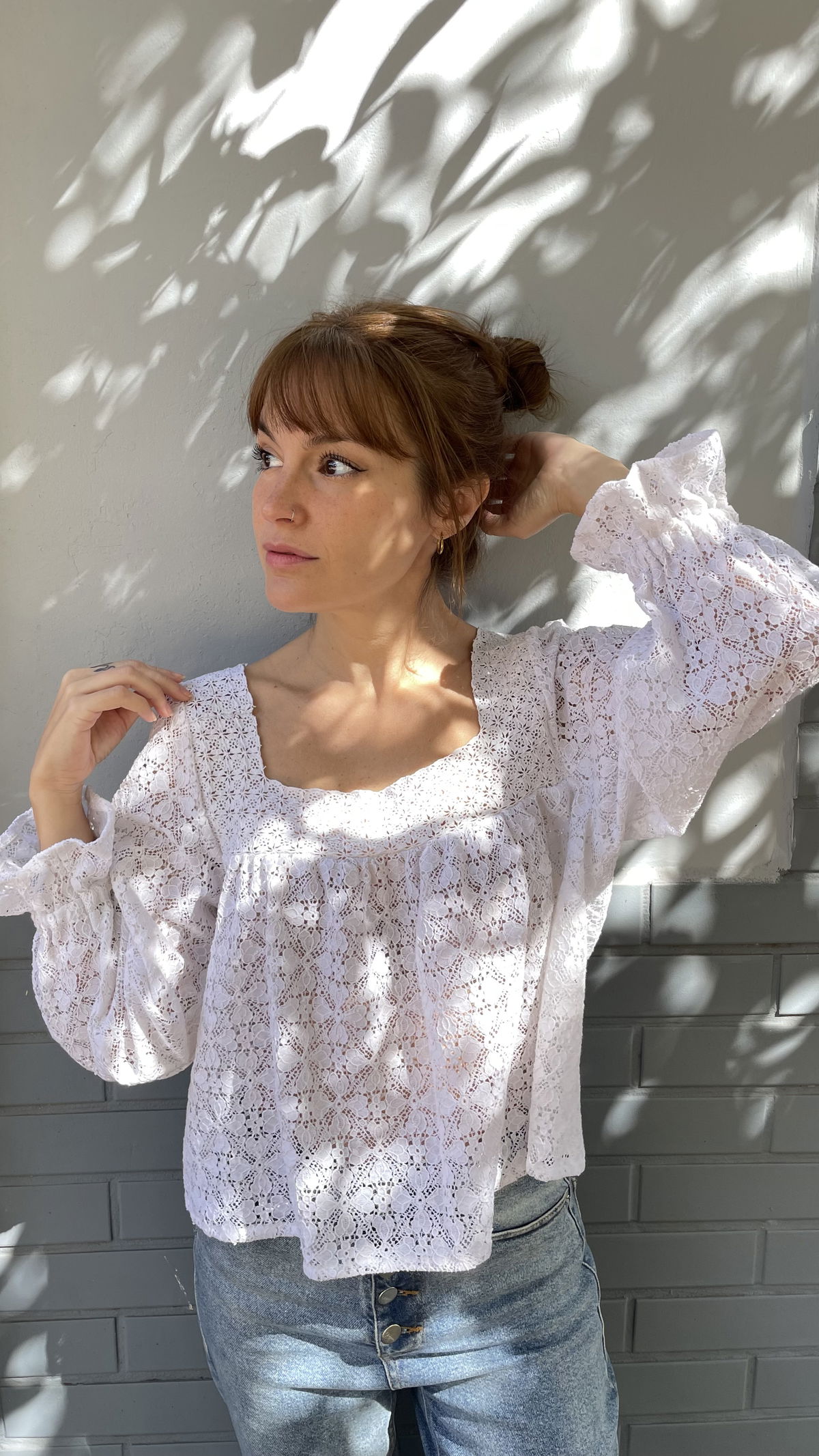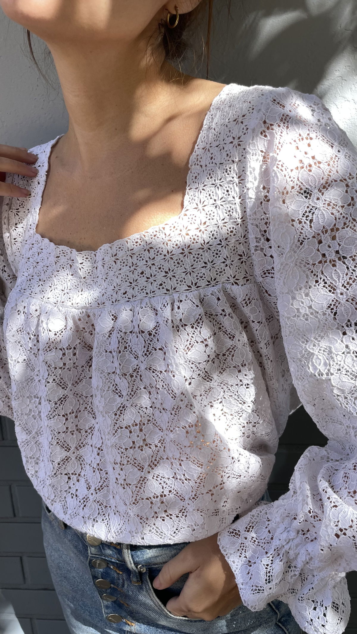 Blusa de encaje de algodón, con canesú tejido a crochet y elástico en puños.