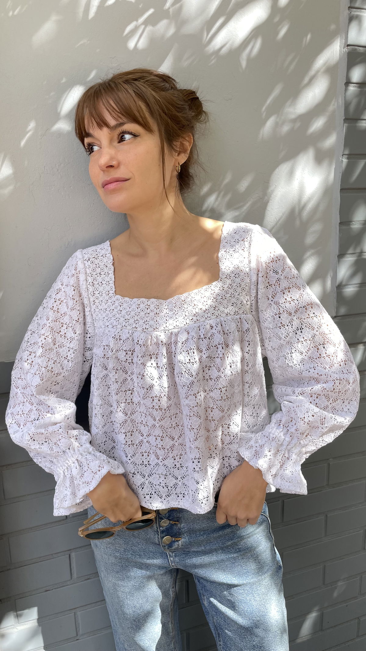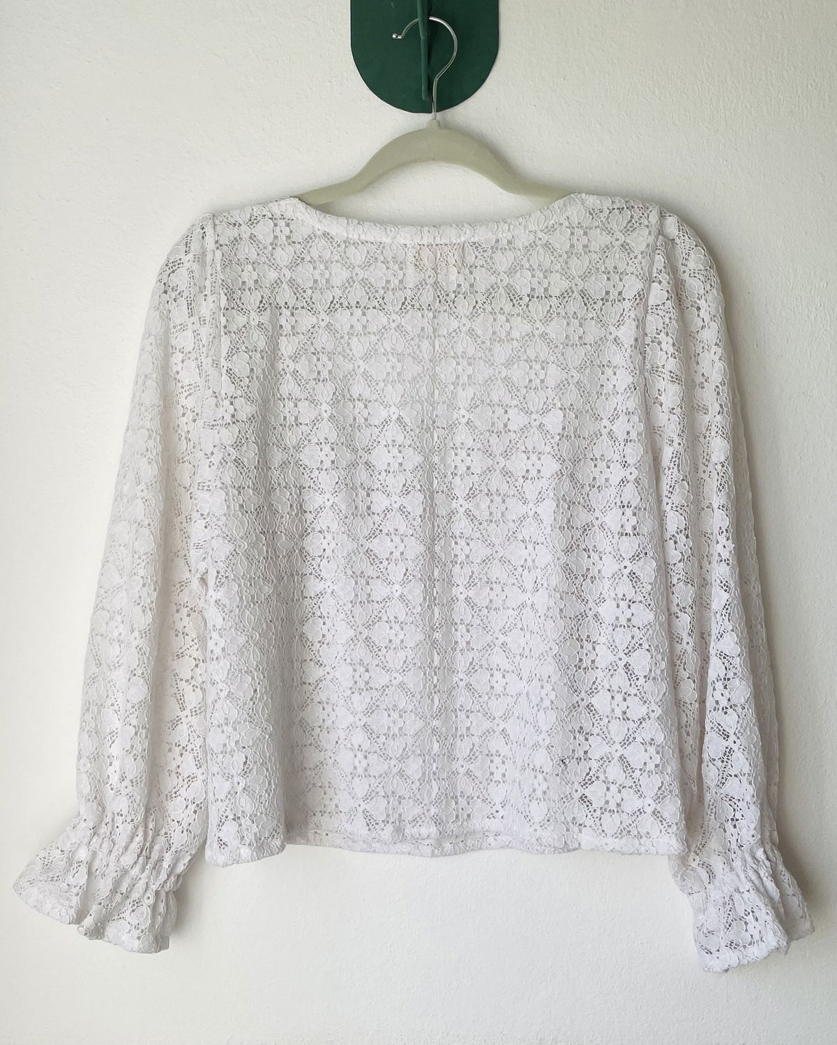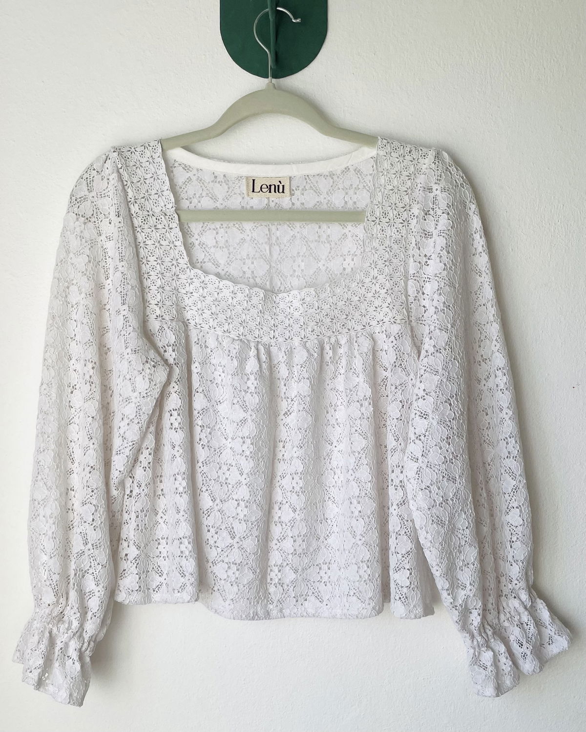Blusa de encaje de algodón, con canesú tejido a crochet y elástico en puños.