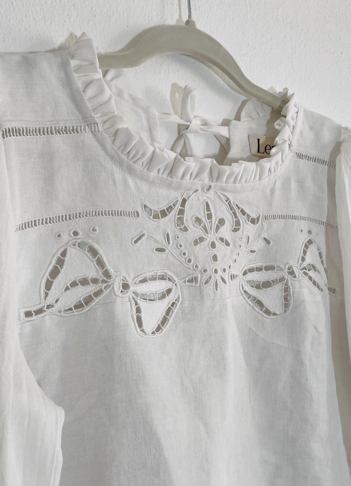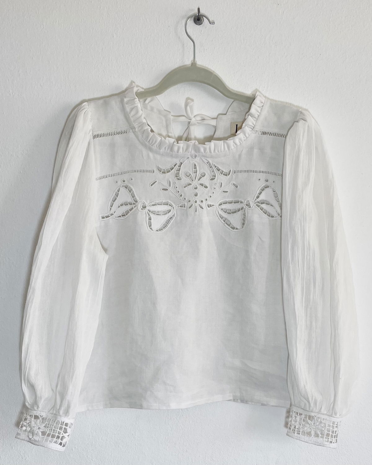 Blusa de algodón bordado y calado, con vainillas, volado en cuello y detalle en puños