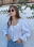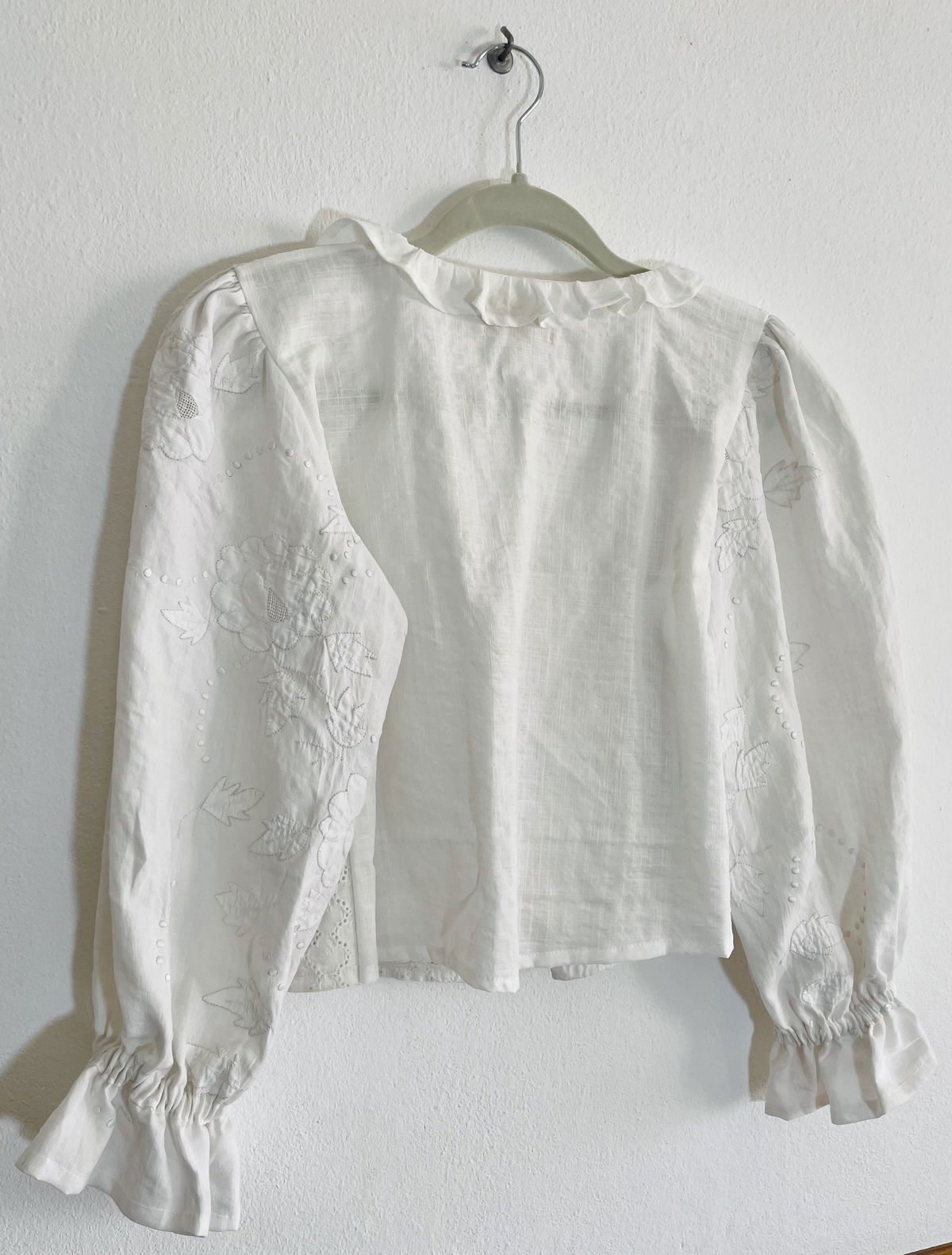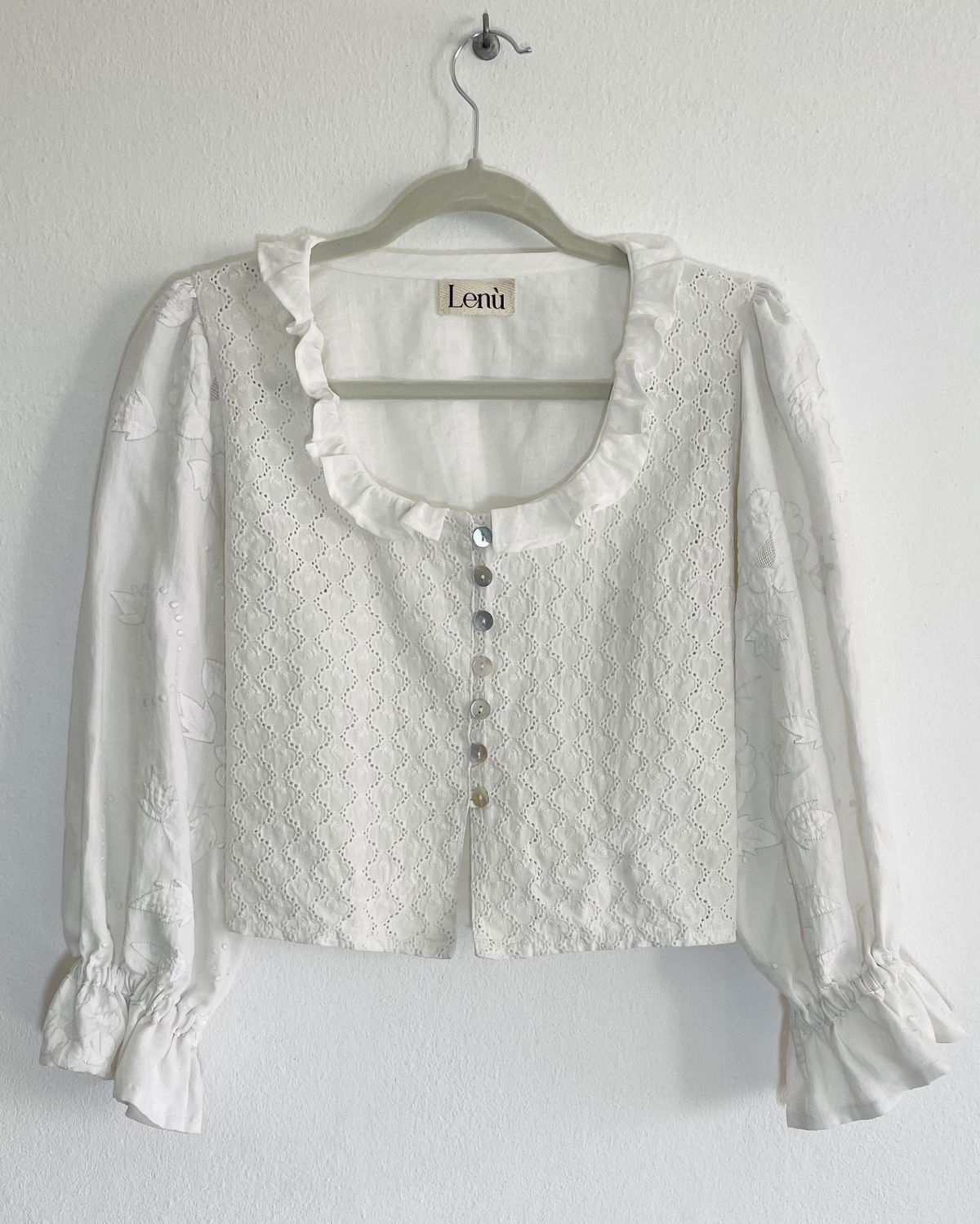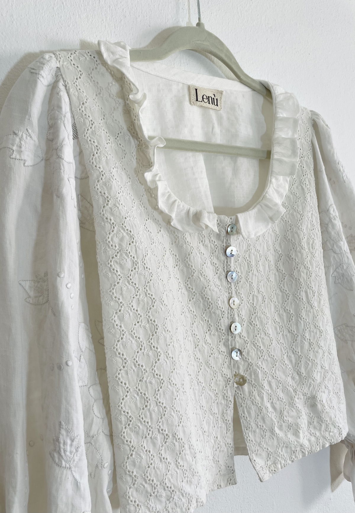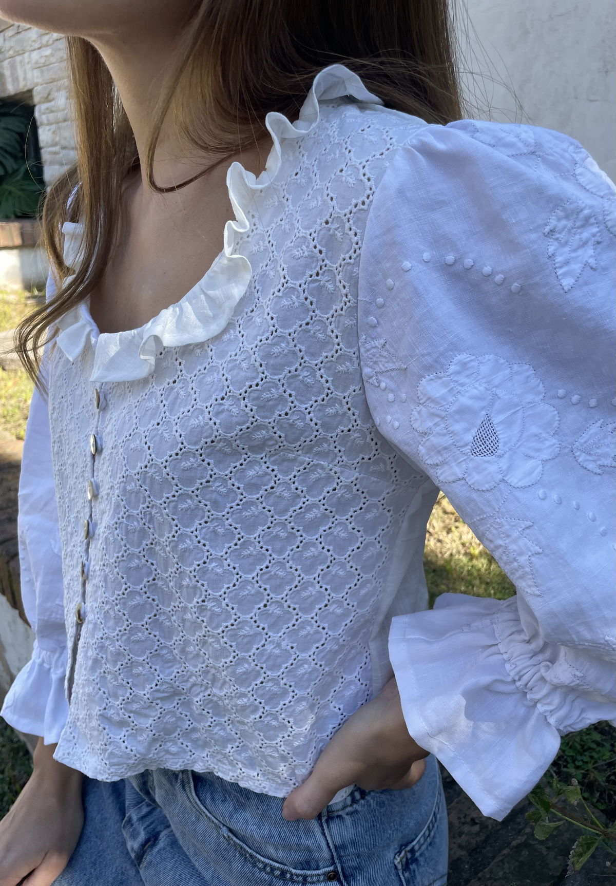 Camisa de broderie de algodón con mangas abullonadas de algodón bordado, volado en cuello y botones de nácar