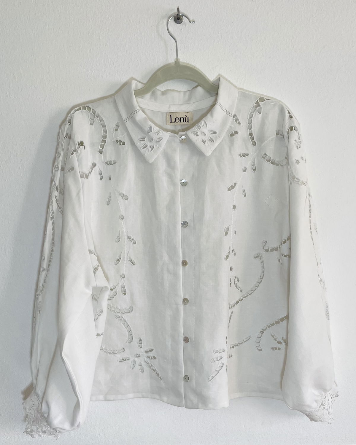 Camisa de algodón bordado y calado con cuello clásico y botones de nácar.