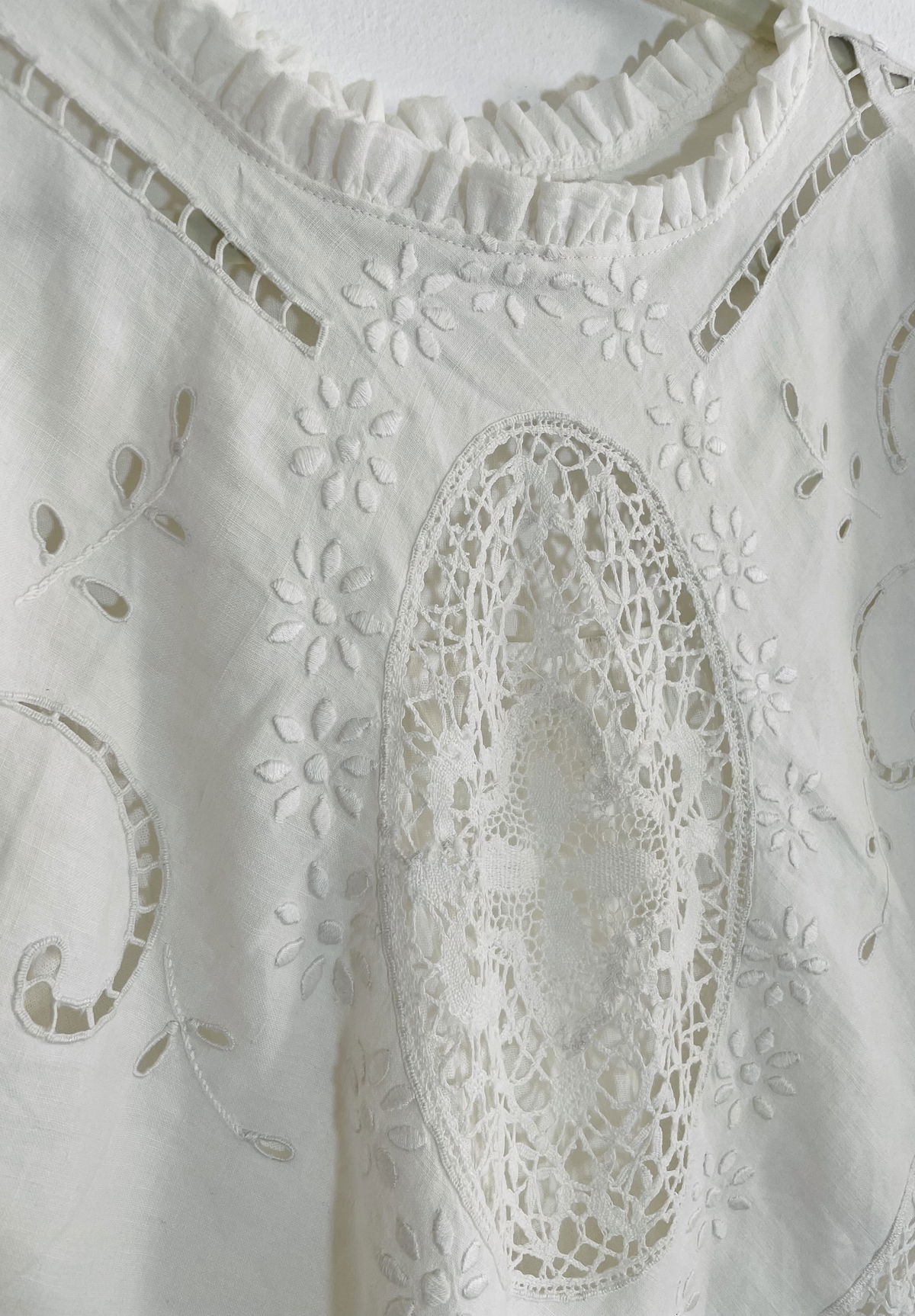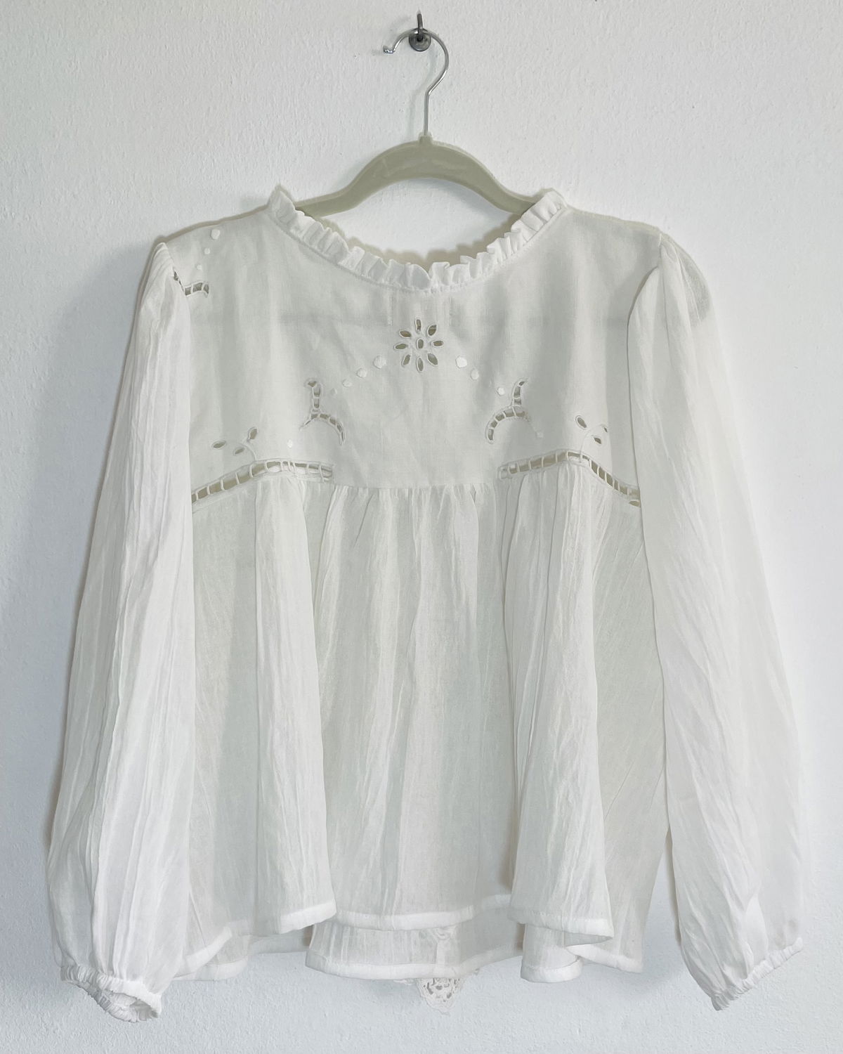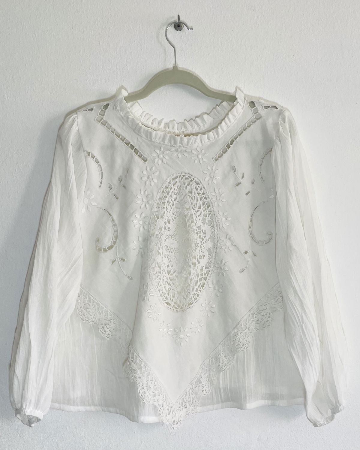 Blusa de algodón bordado y calado, detalles en crochet, mangas abullonadas y volados en cuello.