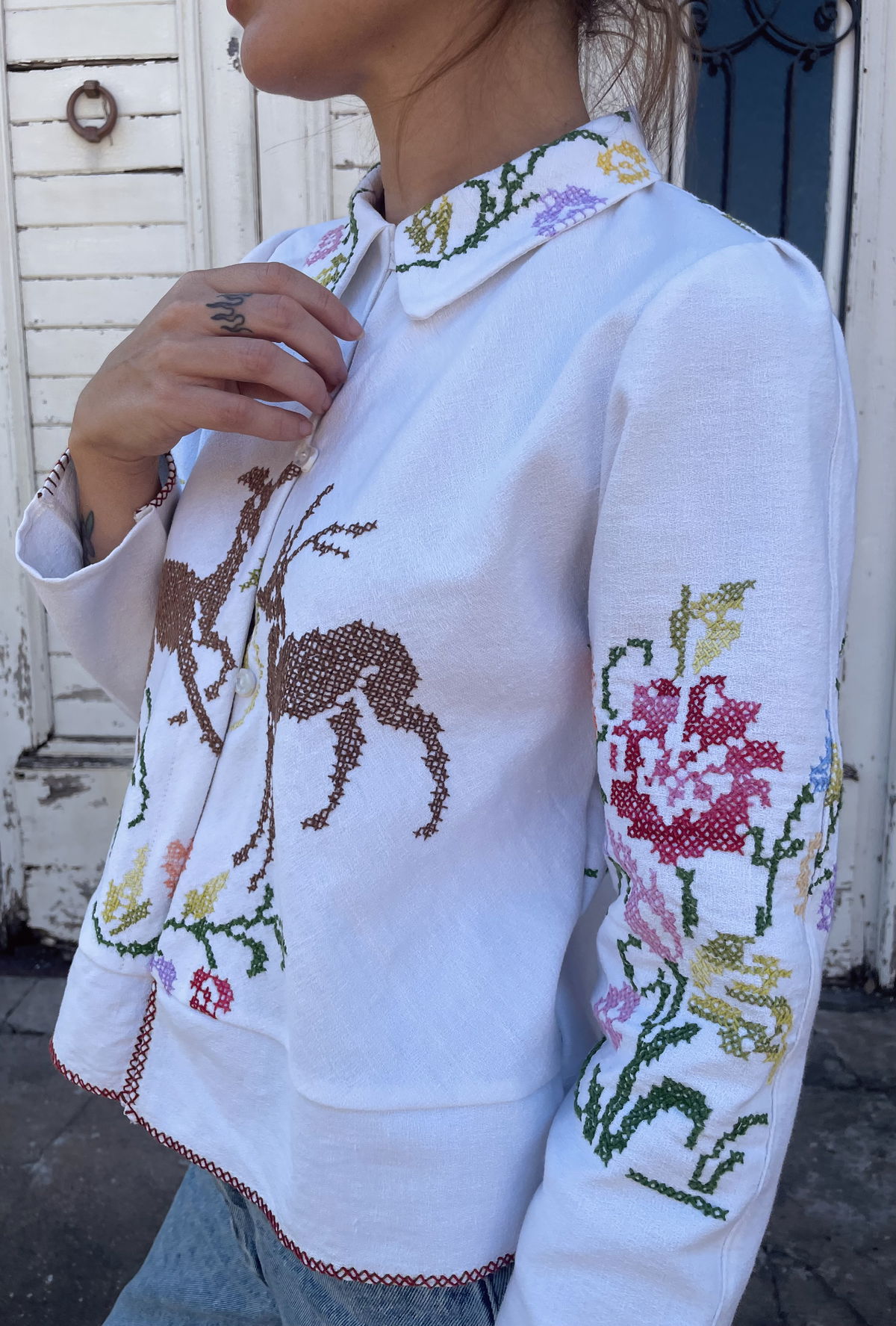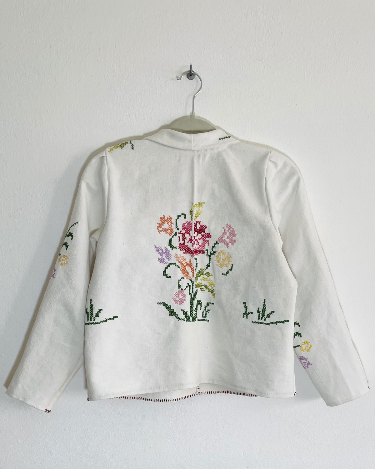 Campera de granité (es una tela similar al denim o gabardina) bordado en punto cruz combinada con tusor de algodón.
