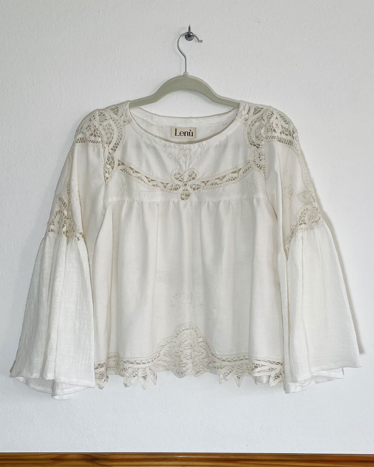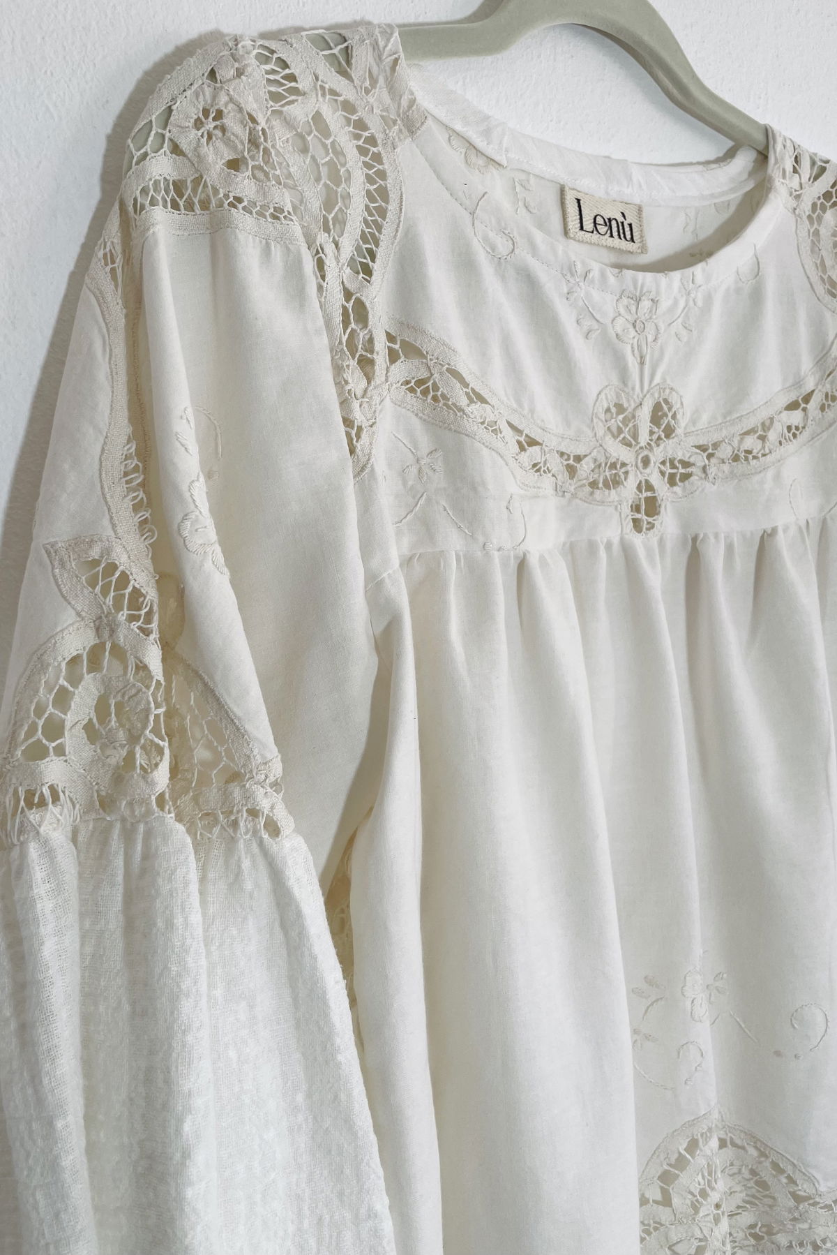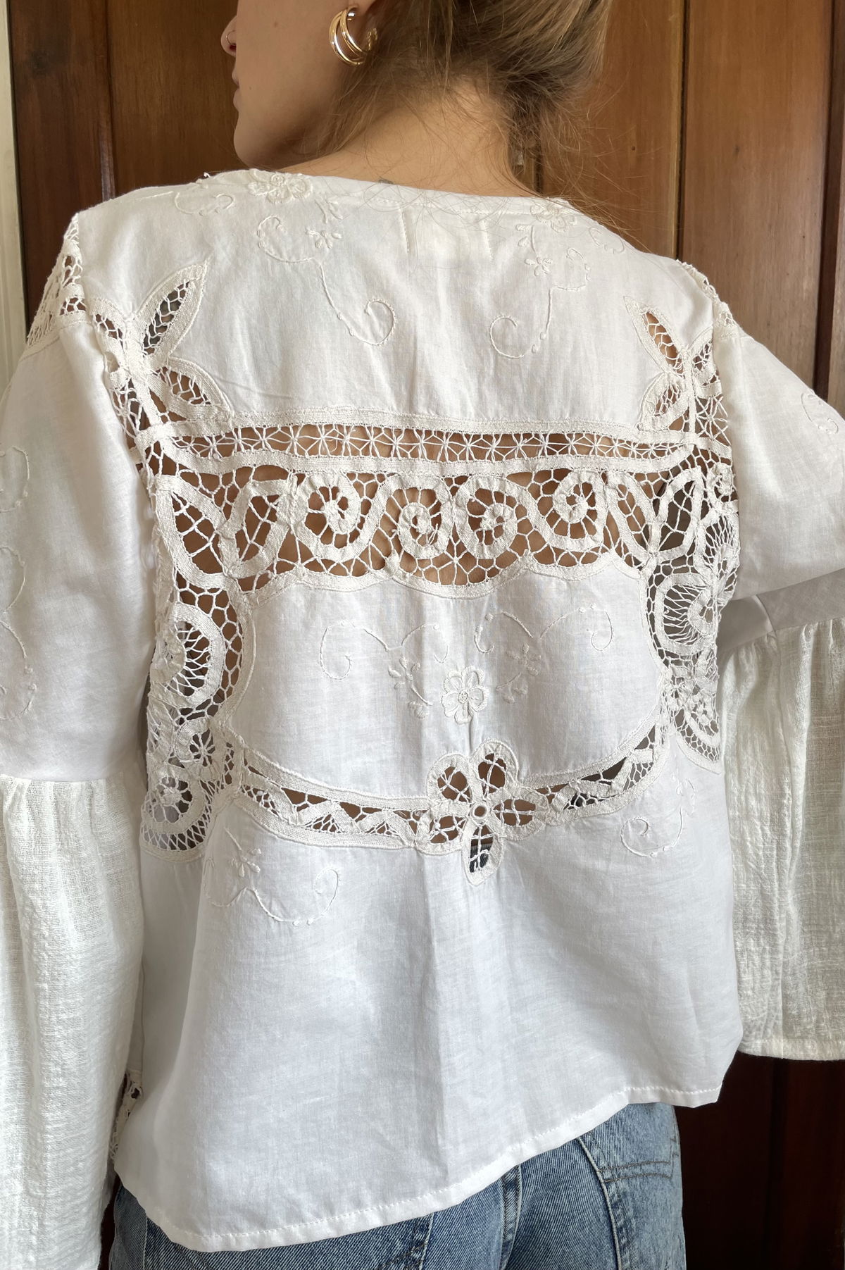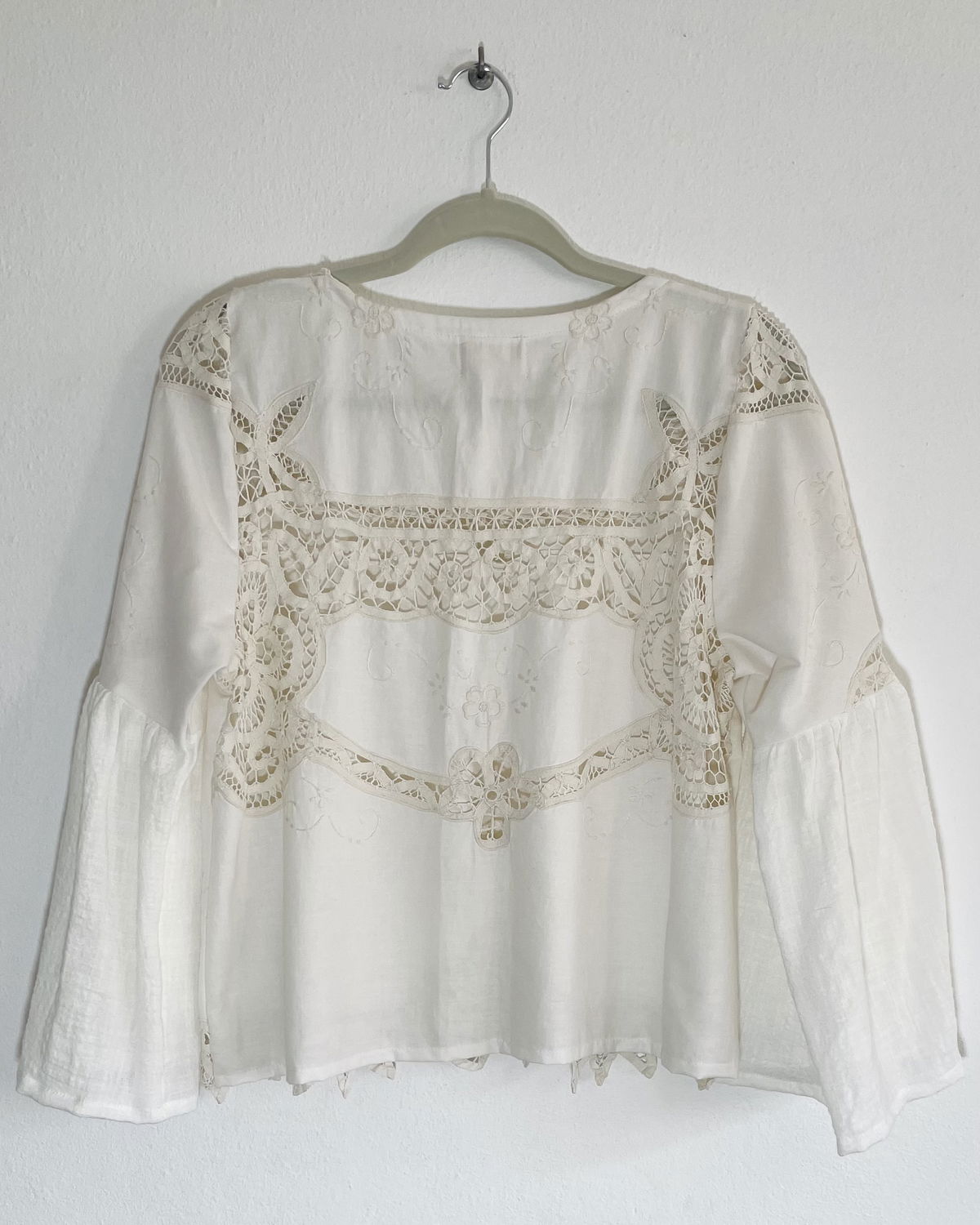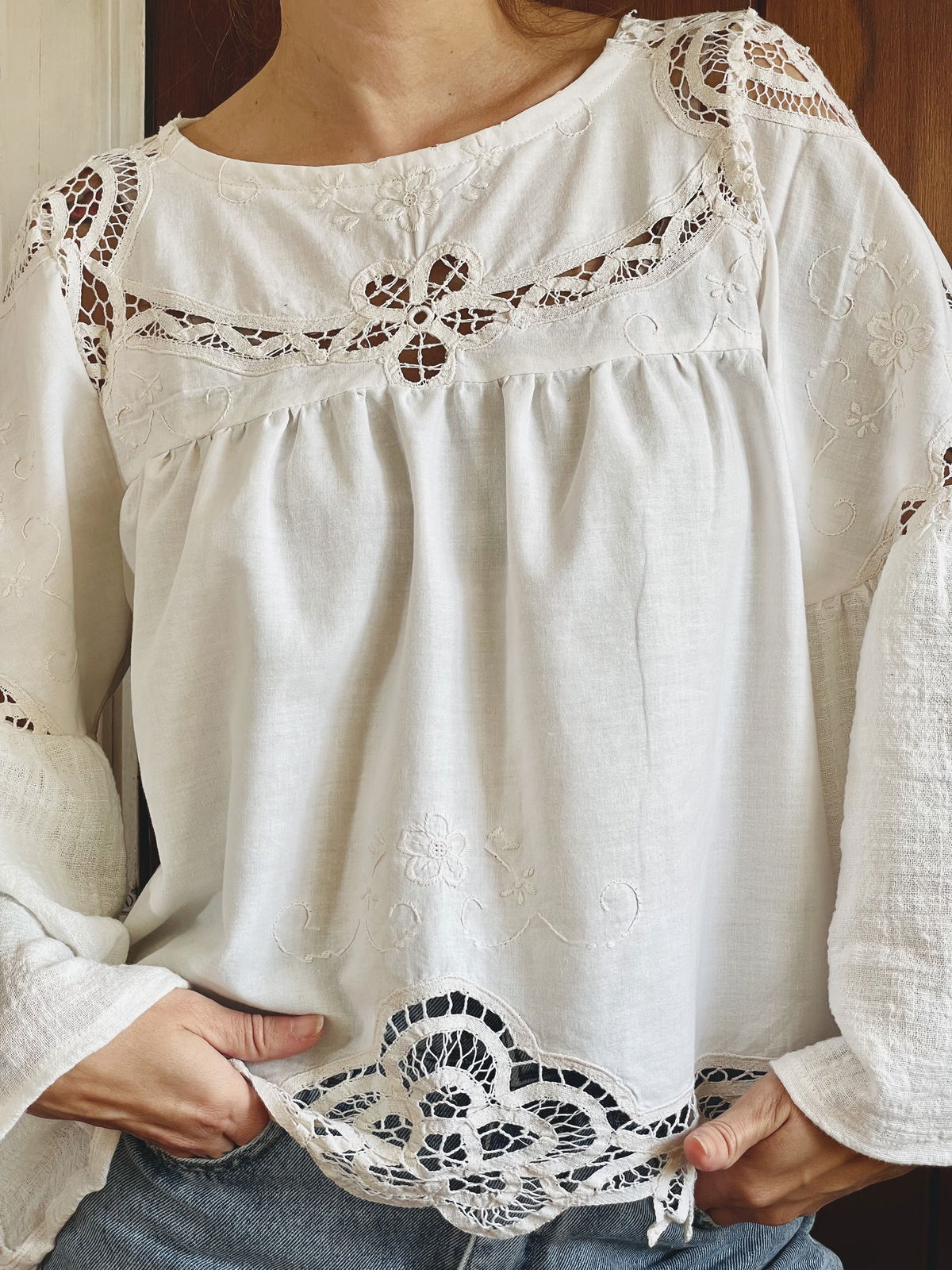 Blusa de algodón con apliques bordados y calados, mangas oxford