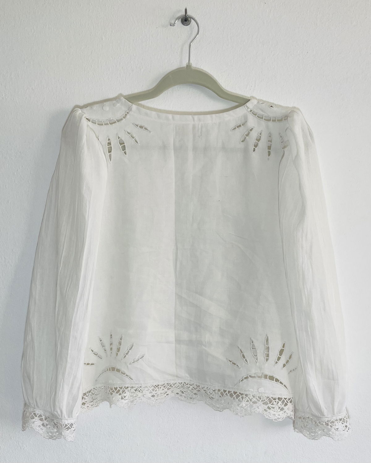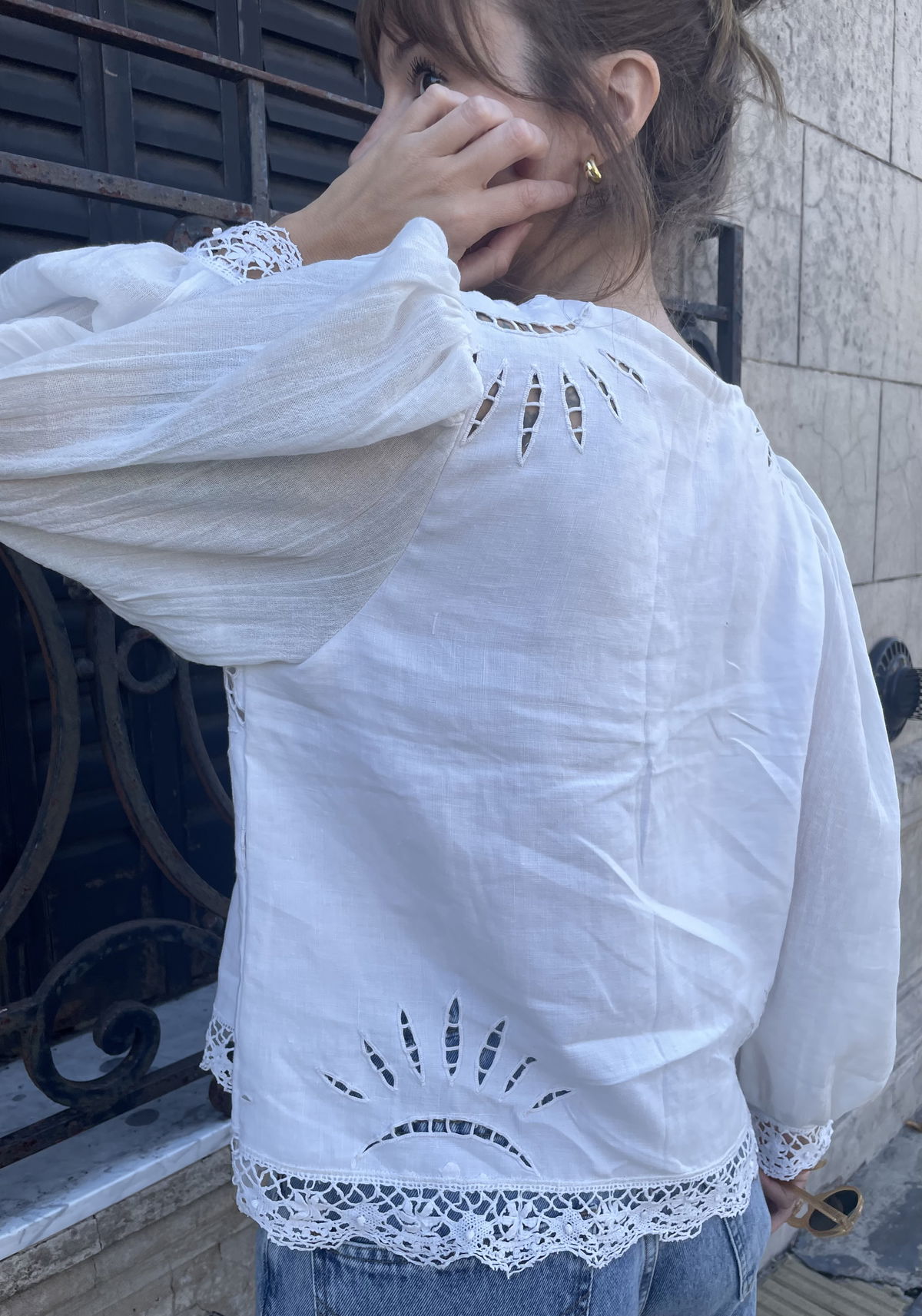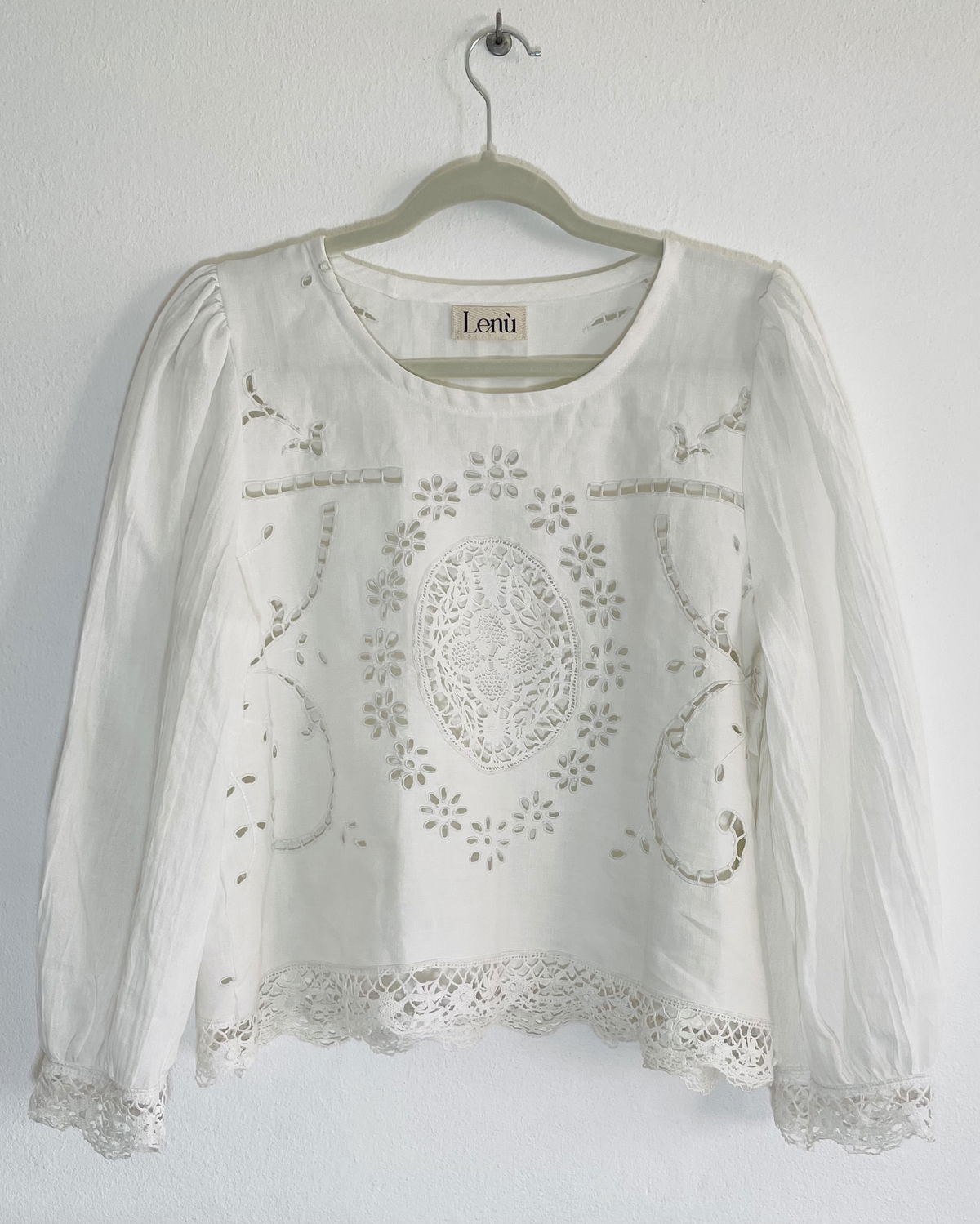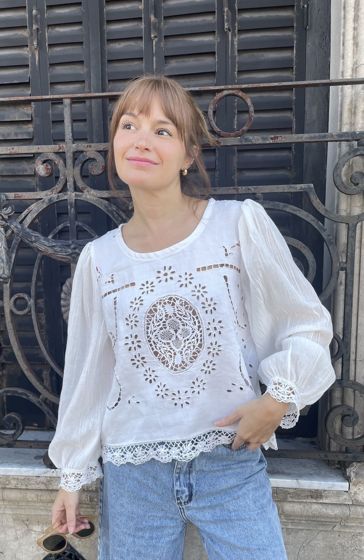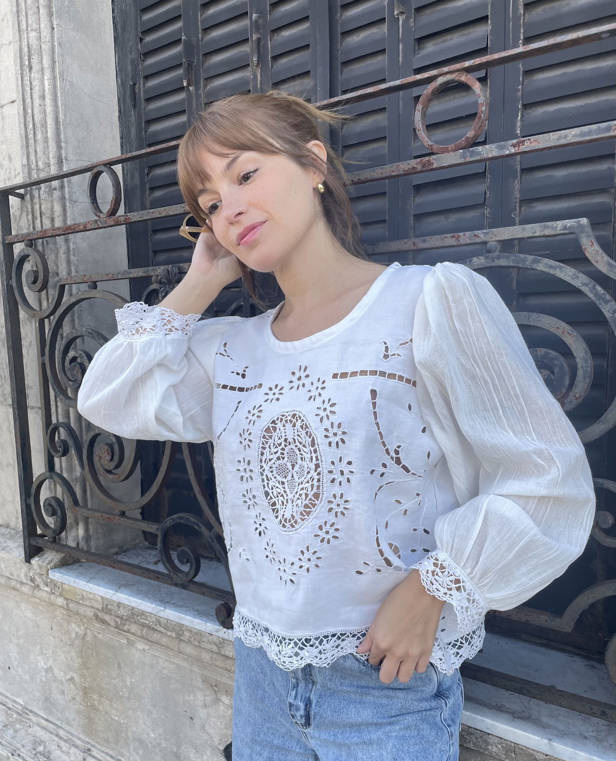 Blusa de algodón bordado y calado, detalles en crochet, mangas abullonadas y puntilla en puños