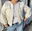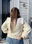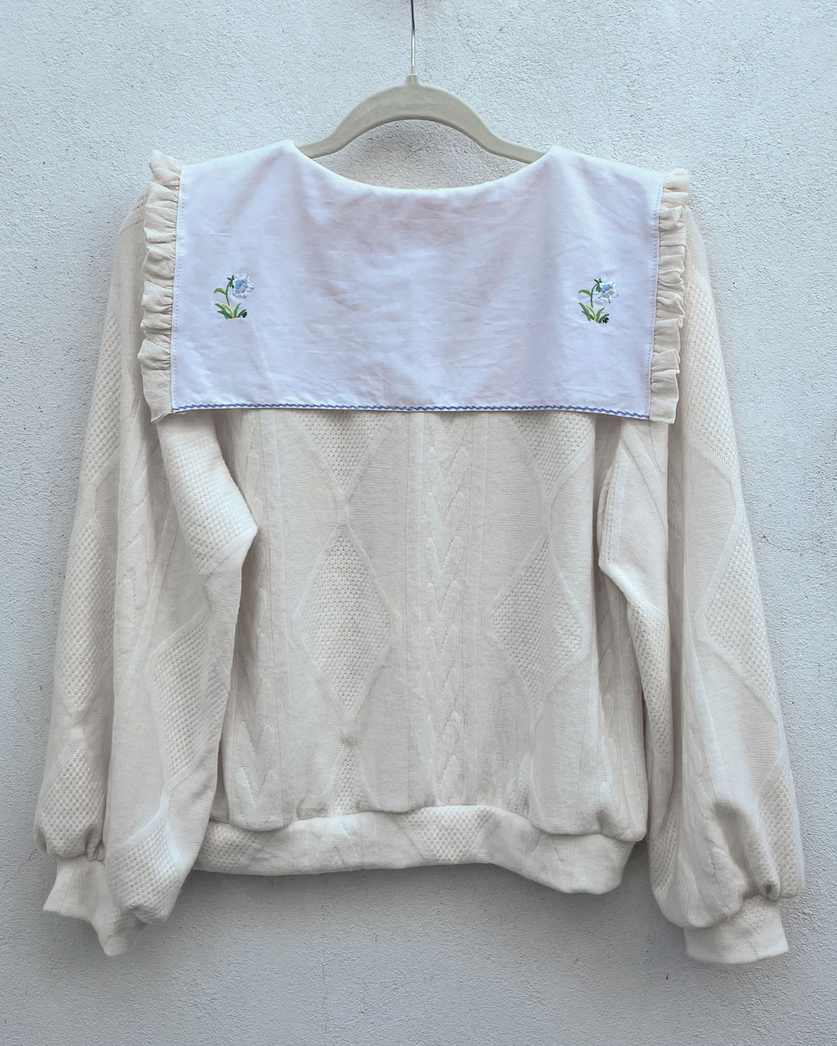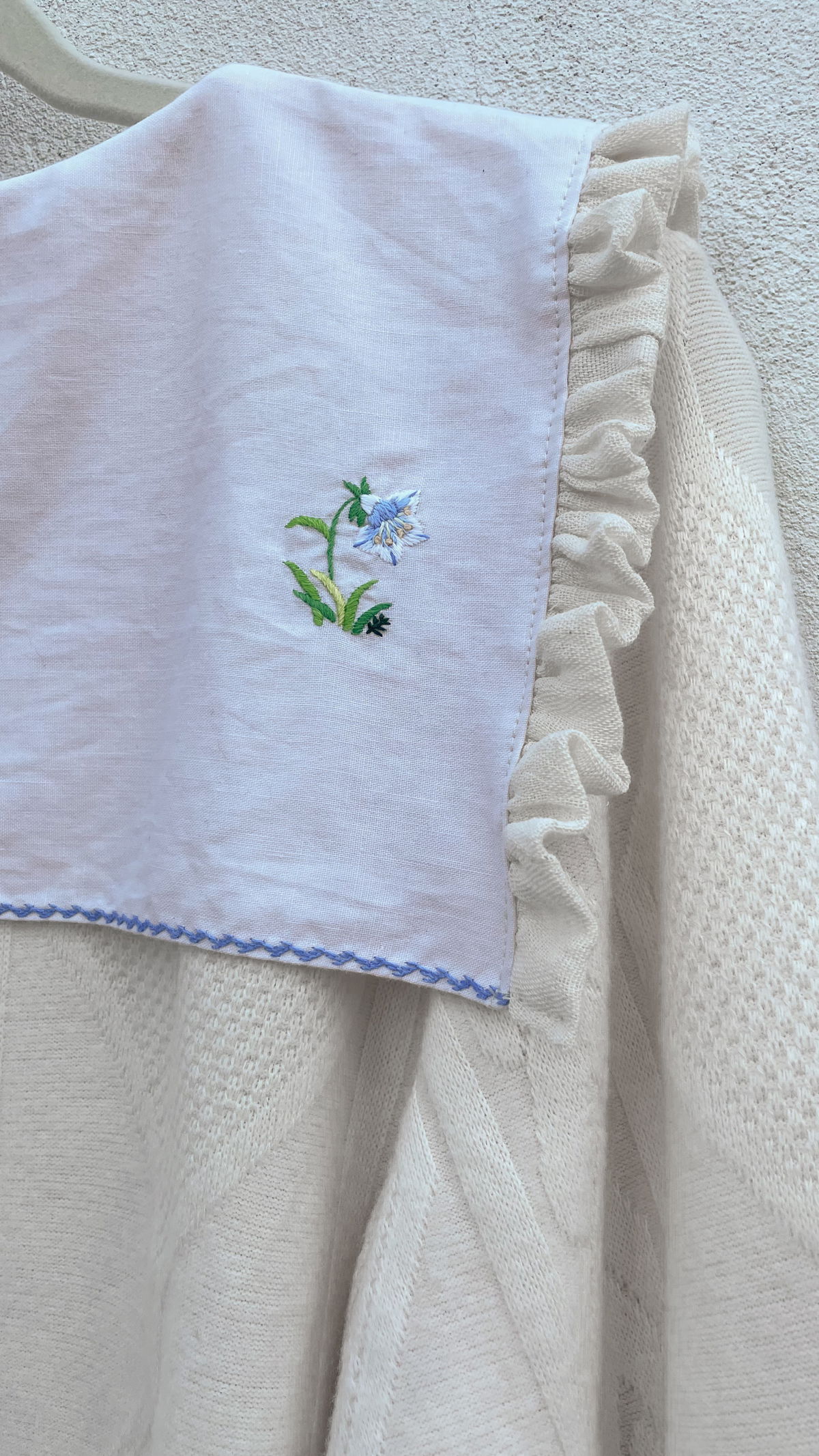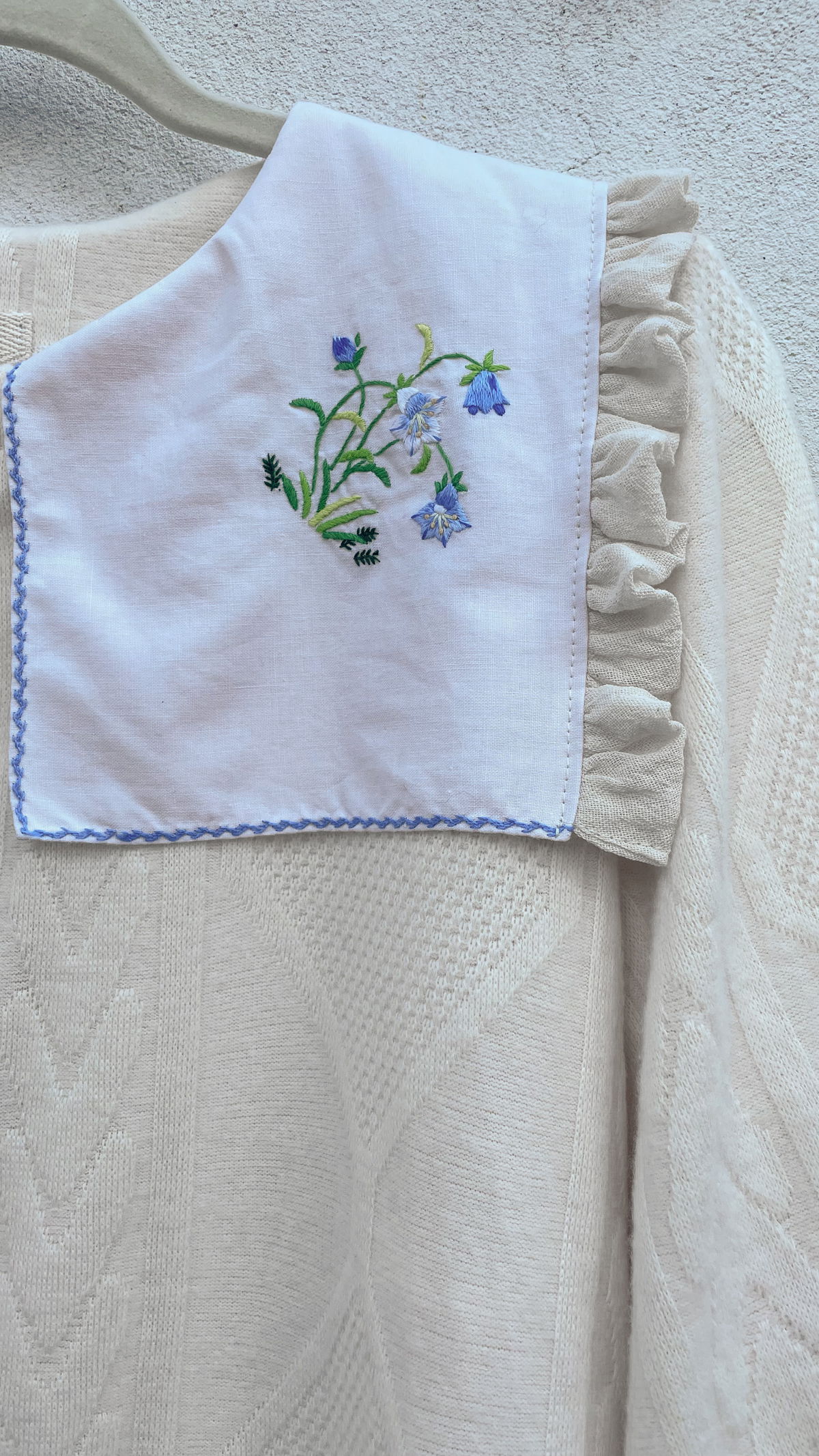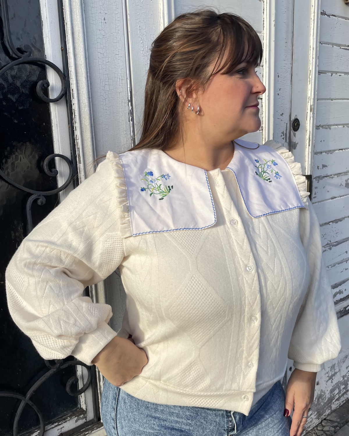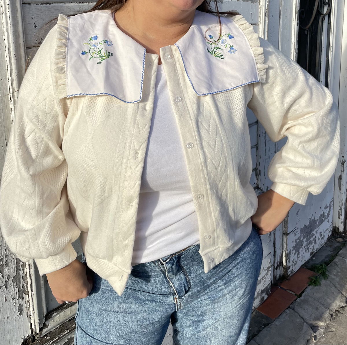 Cardigan de lanilla con diseño en relieve, y cuello de algodón bordado. La tela elastiza mucho así que va bien para talle M o L (en las fotos se muestra en una modelo con 105 de busto y otra con 85 de busto)