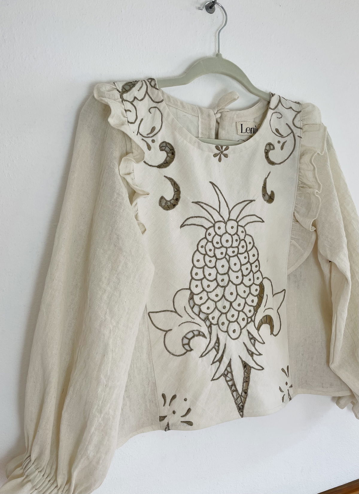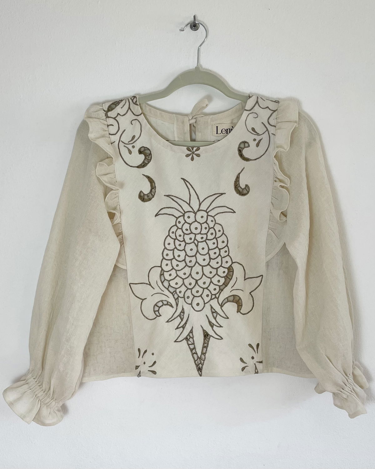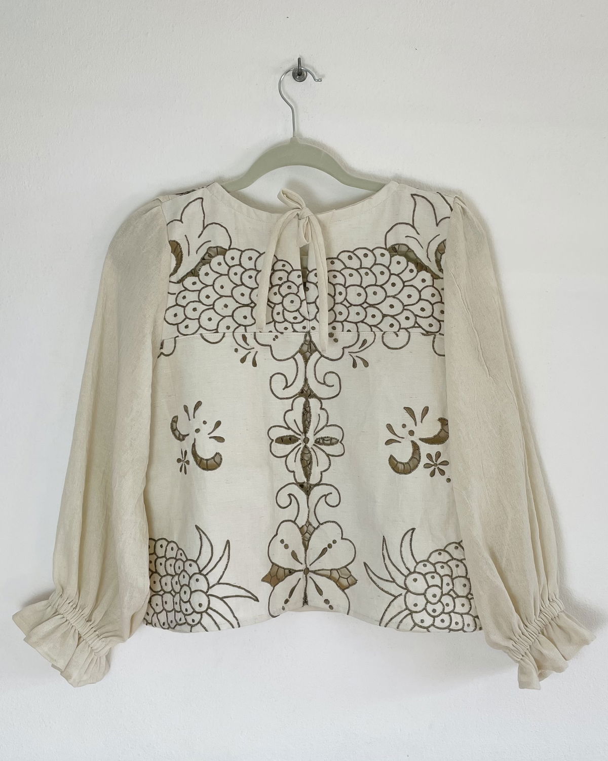 Blusa hecha a partir de mantel español de algodón bordado y calado con volado en frente y mangas de gasa de algodón a tono. Talle S