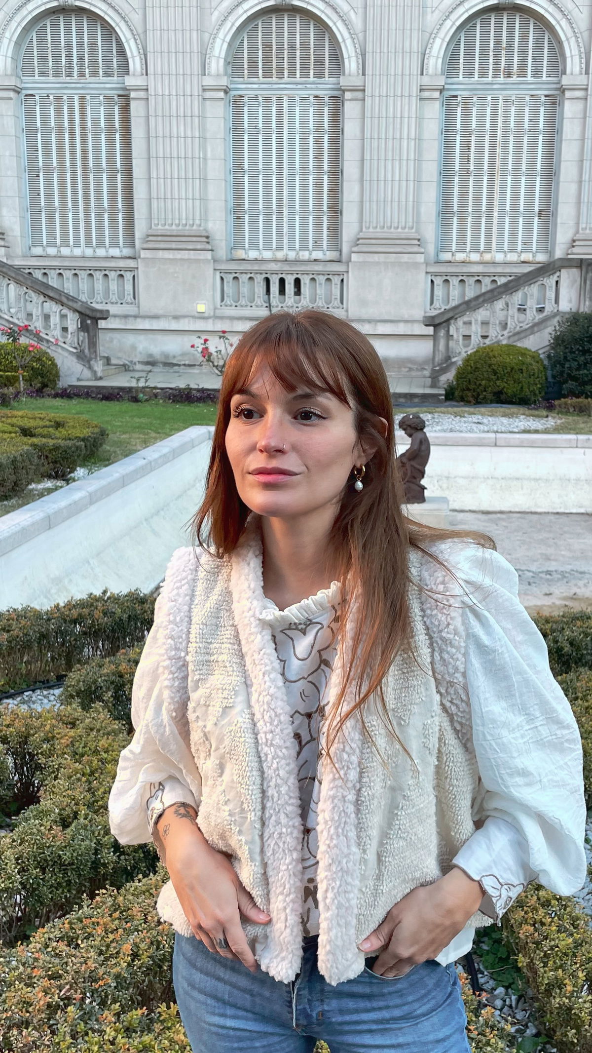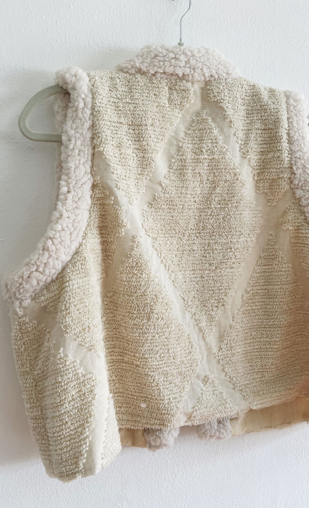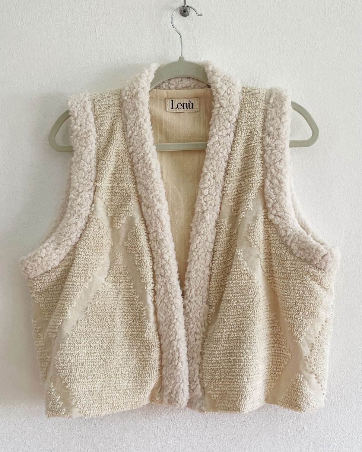 Chaleco hecho a partir de acolchado Palette, con textura. Forrado con algodón y con bordes de corderito sherpa