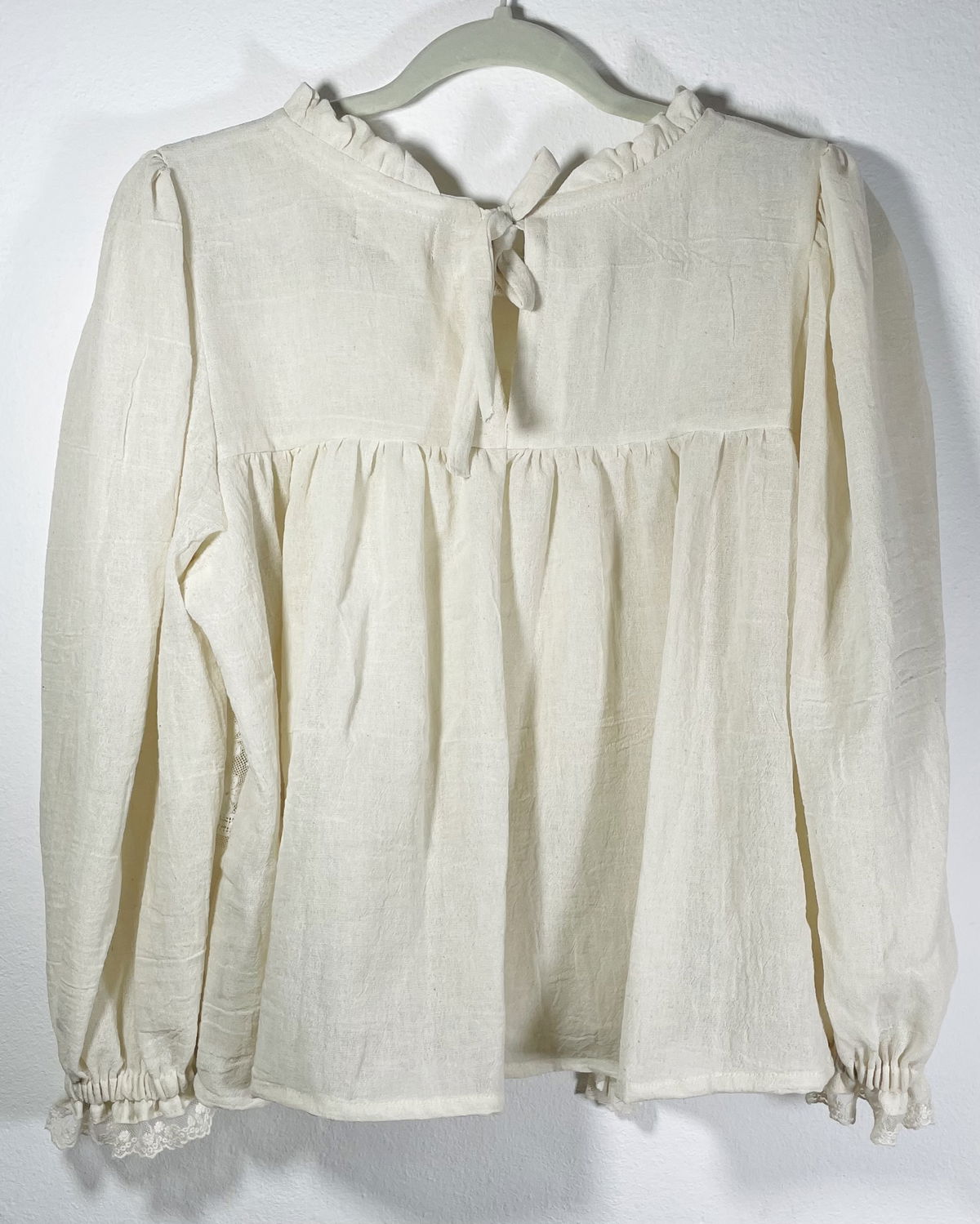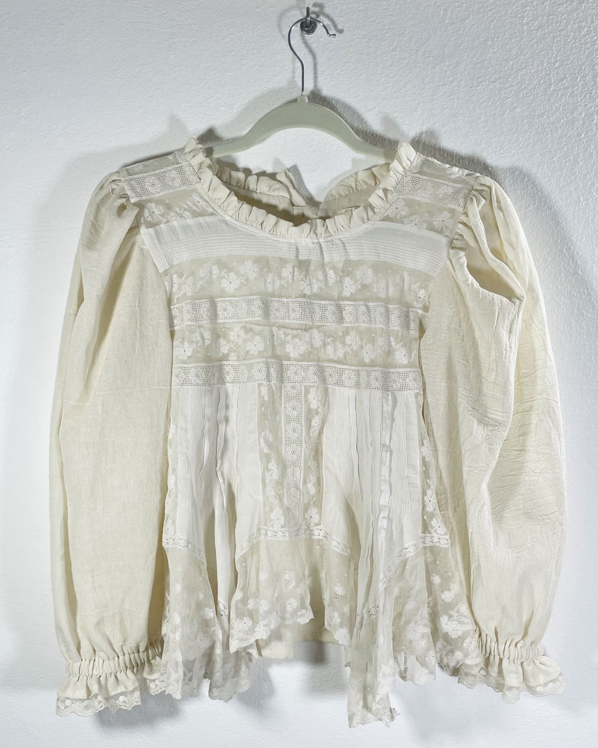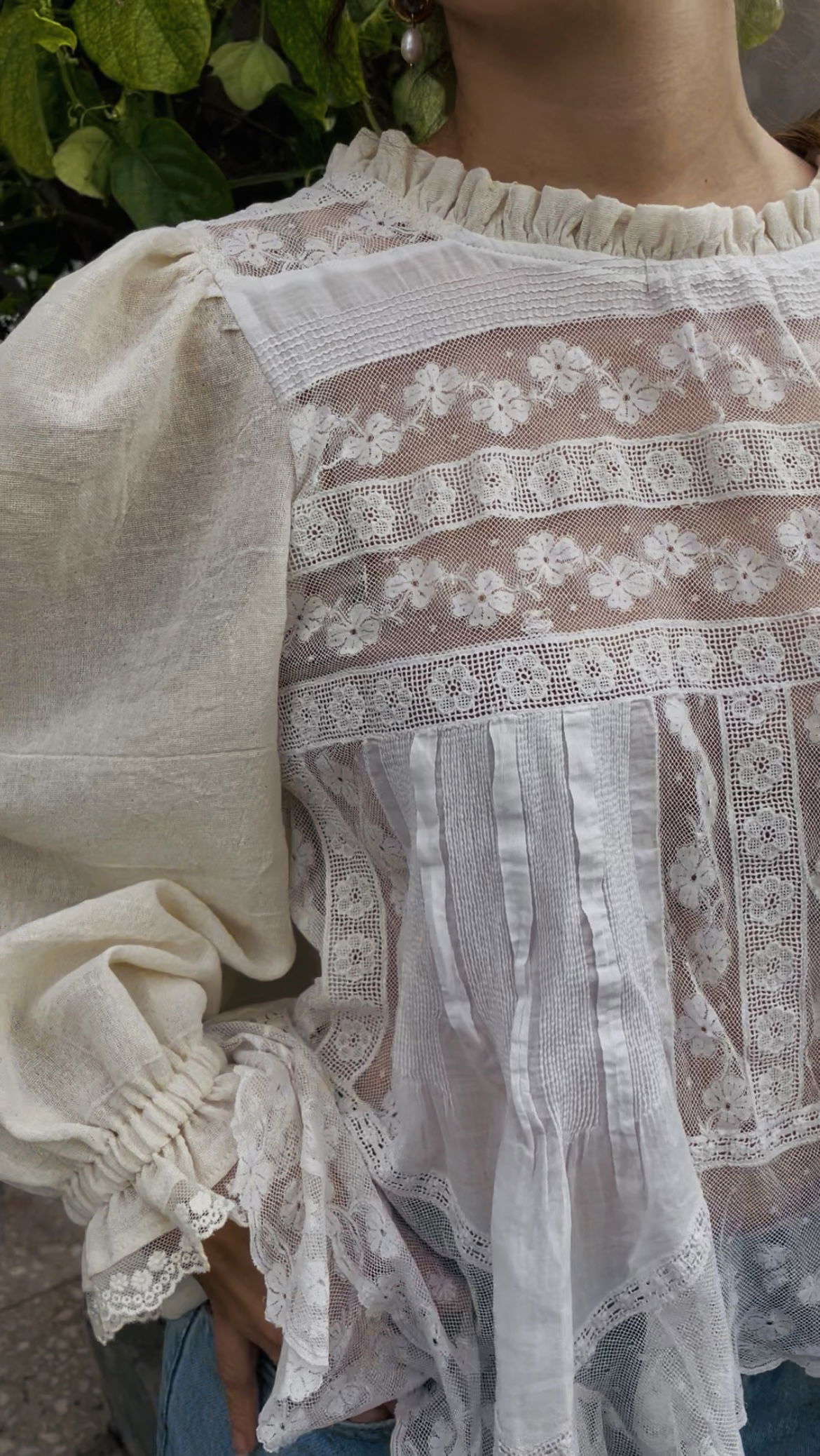 Blusa hecha a partir de visillo con recortes de tul bordado, puntillas y algodón alforzado. Espalda y mangas de gasa de algodón