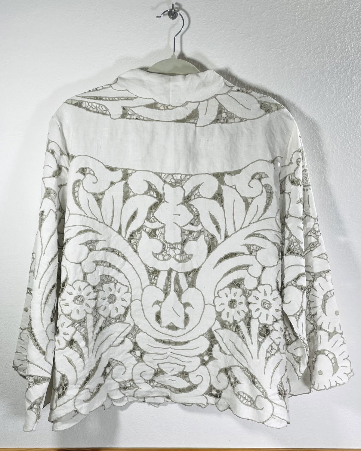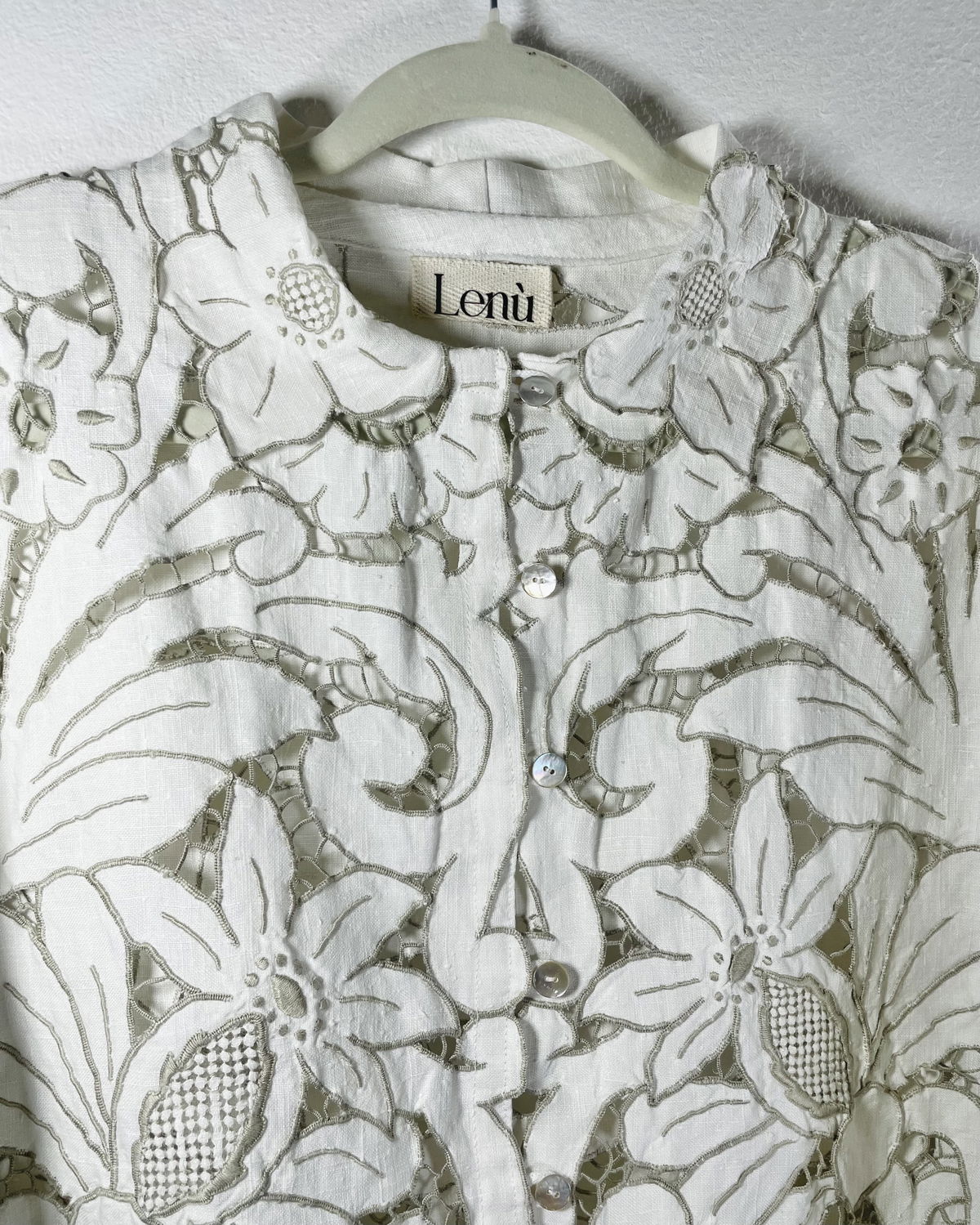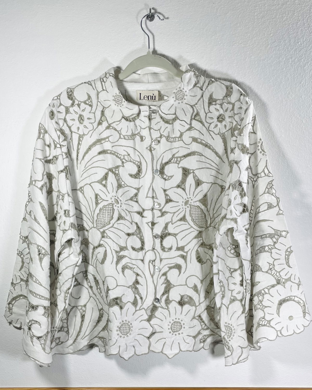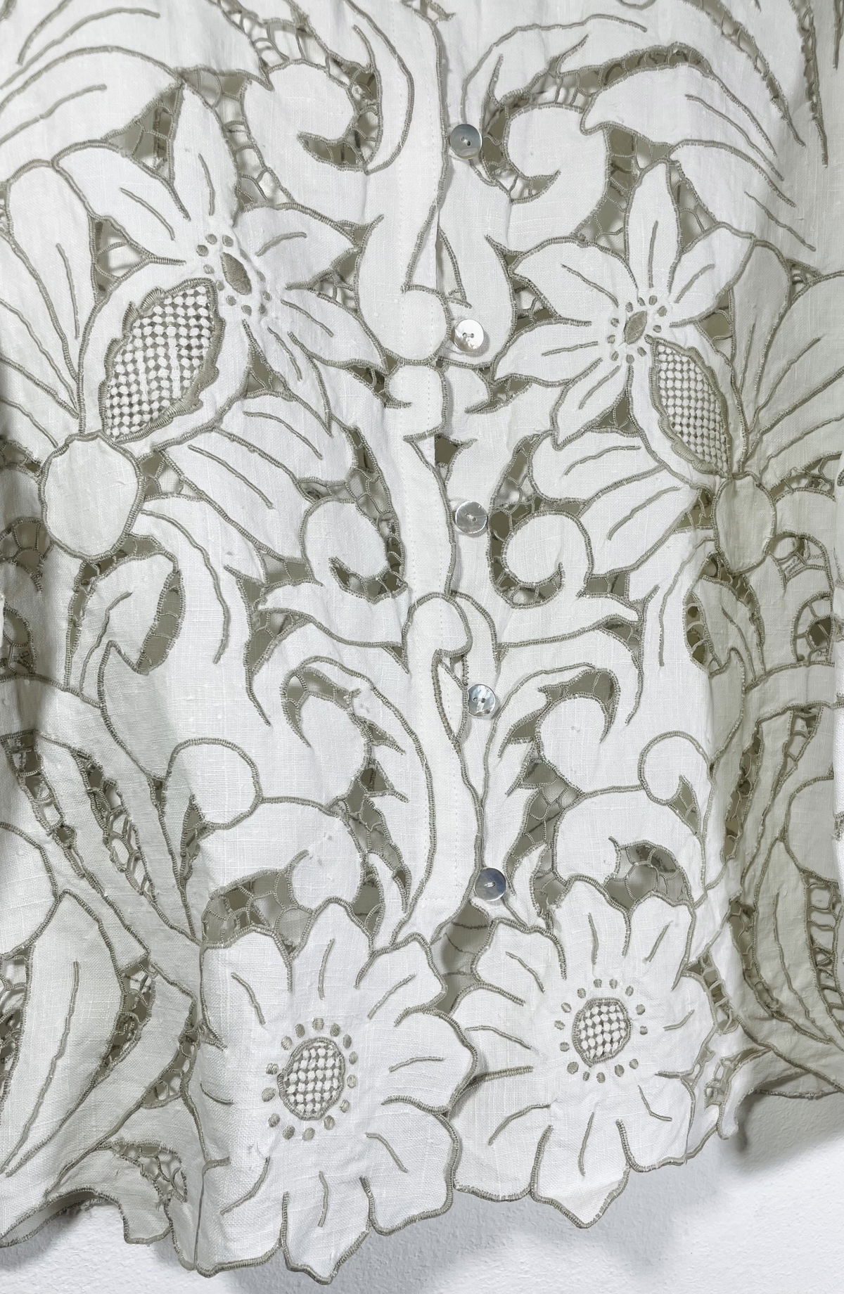 Camisa hecha a partir de mantel español de algodón bordado y calado con cuello y mangas amplias.