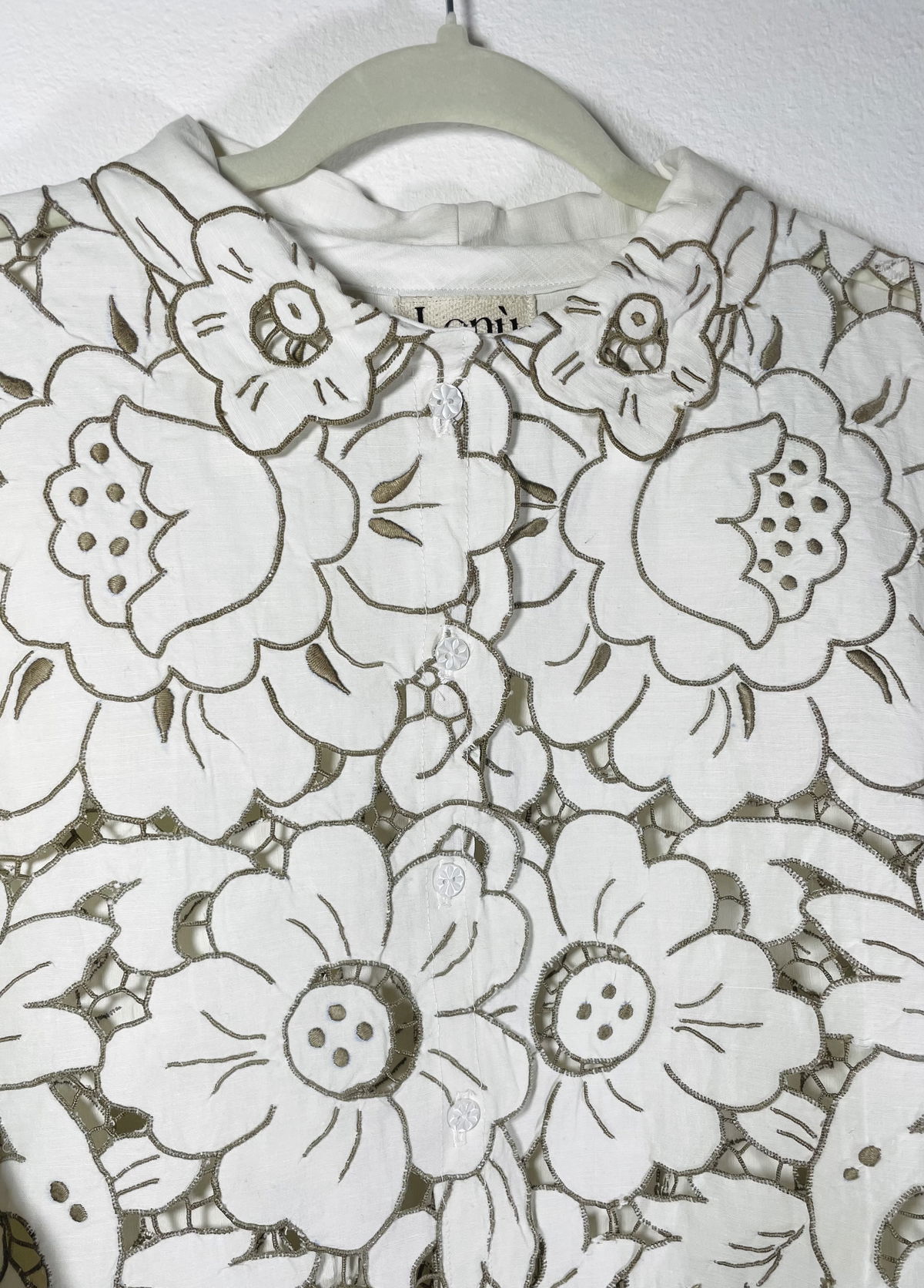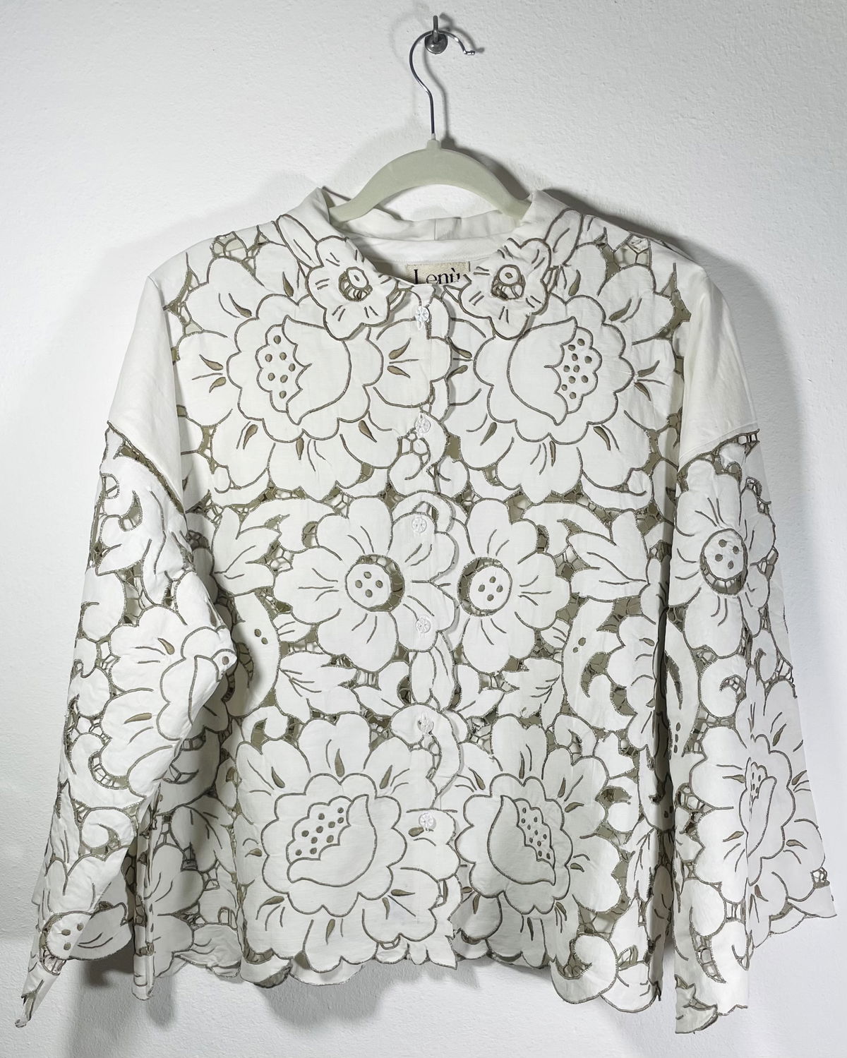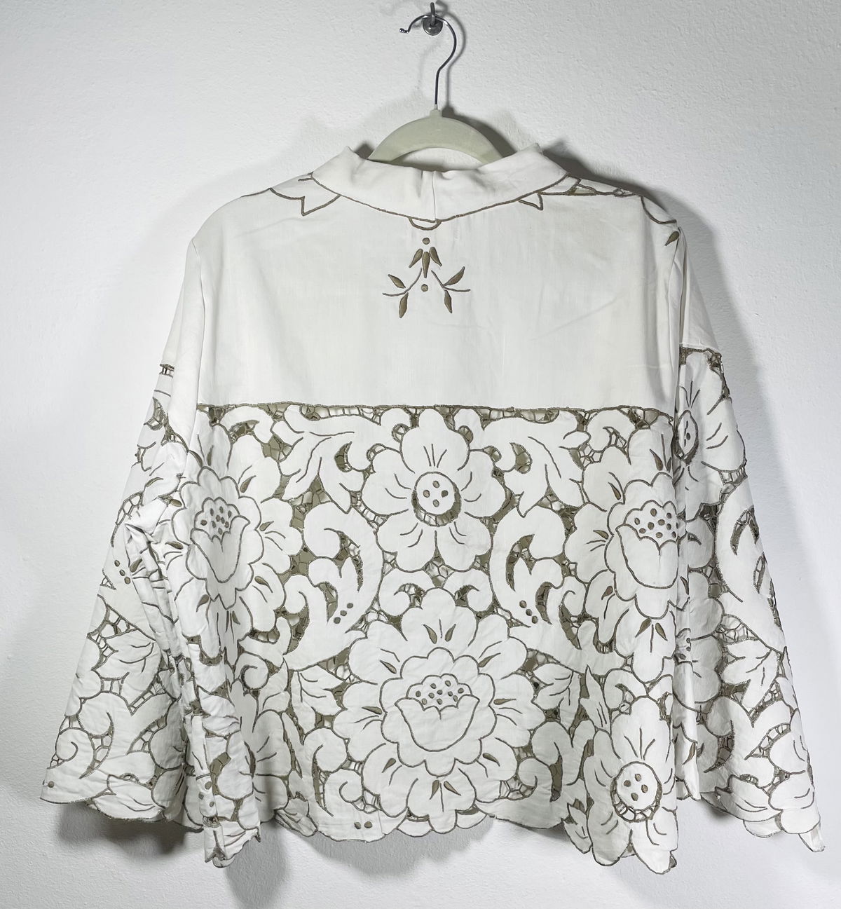 Camisa hecha a partir de mantel español de algodón bordado y calado con cuello y mangas amplias.
