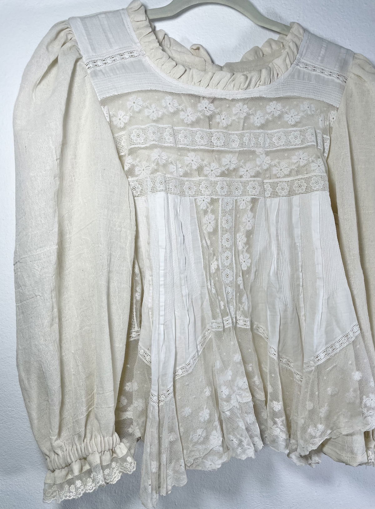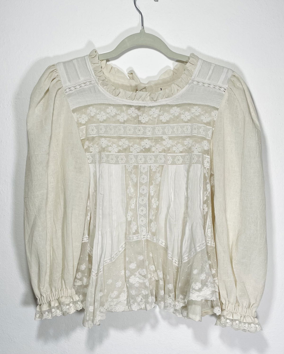 Blusa hecha a partir de visillo con recortes de tul bordado, puntillas y algodón alforzado. Espalda y mangas de gasa de algodón